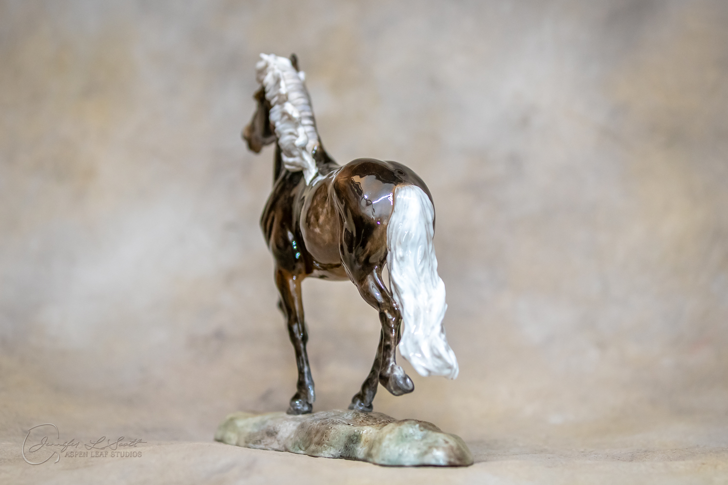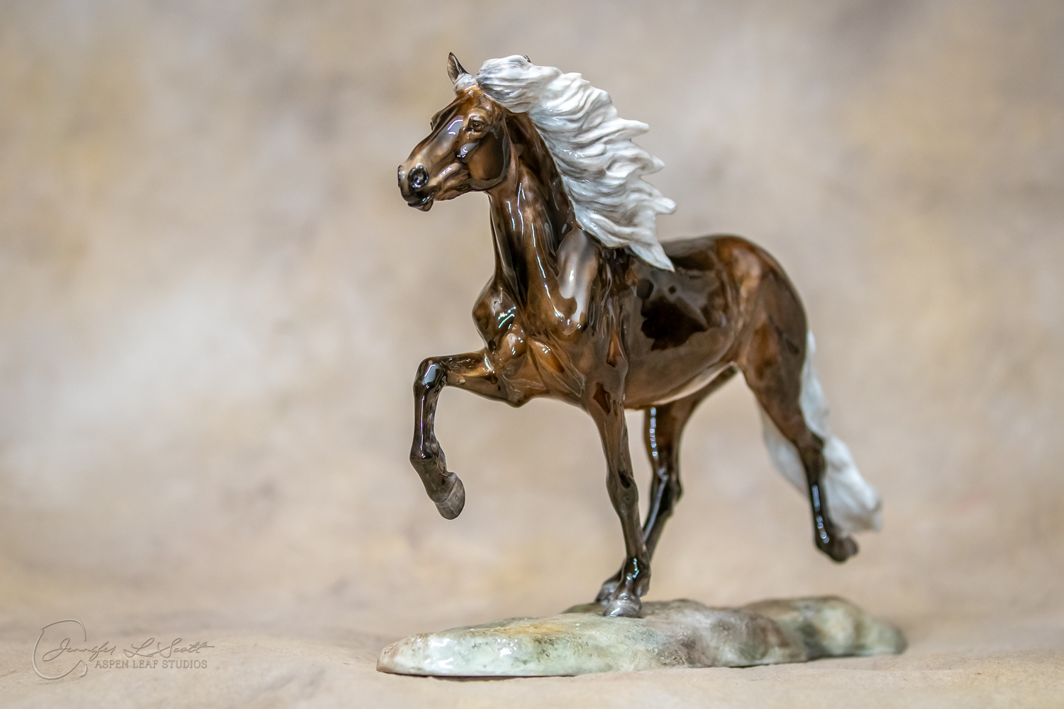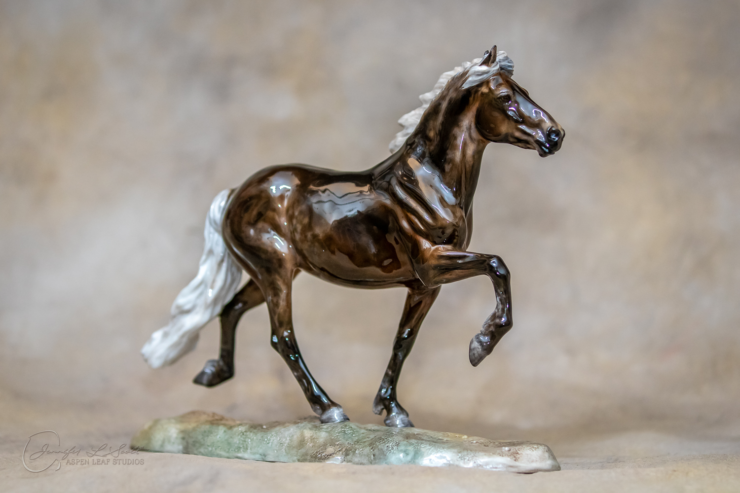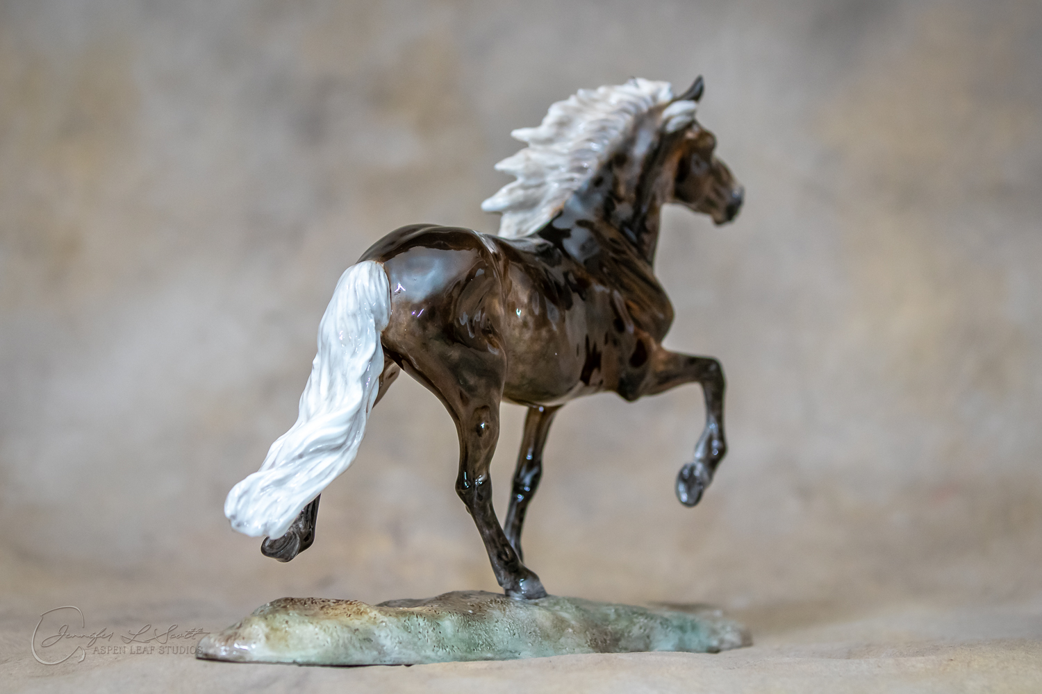 Classic Scale "Bjalla" bone china sculpted by Brigitte Eberl and produced by Horsing around. Glossy finish, overglazed black silver dapple in 2019.