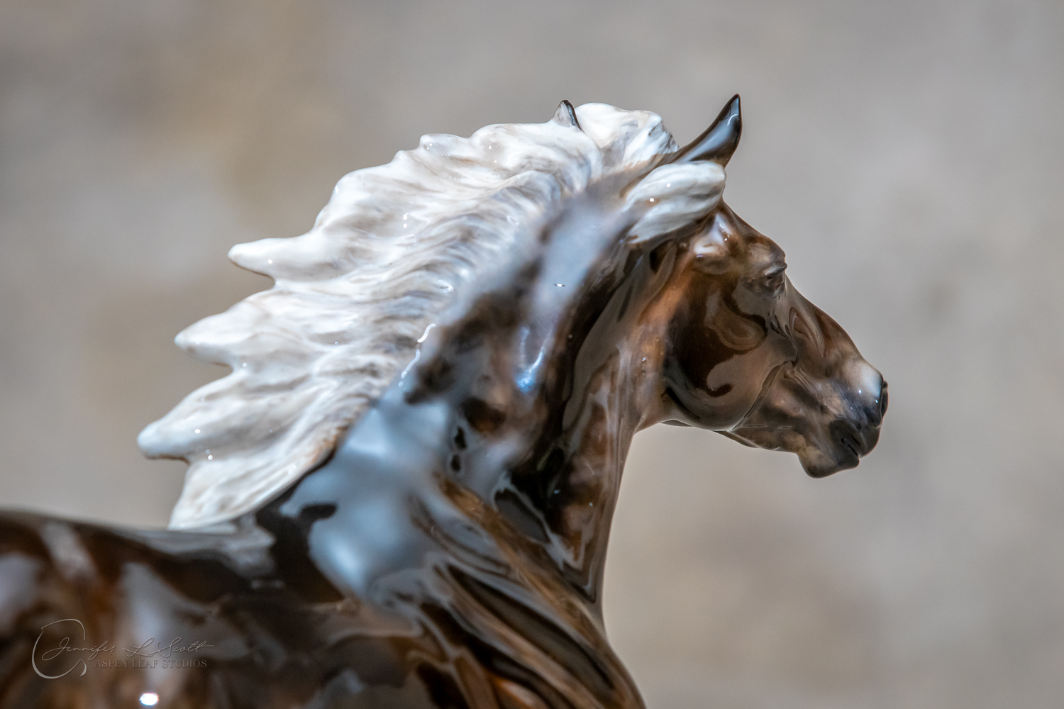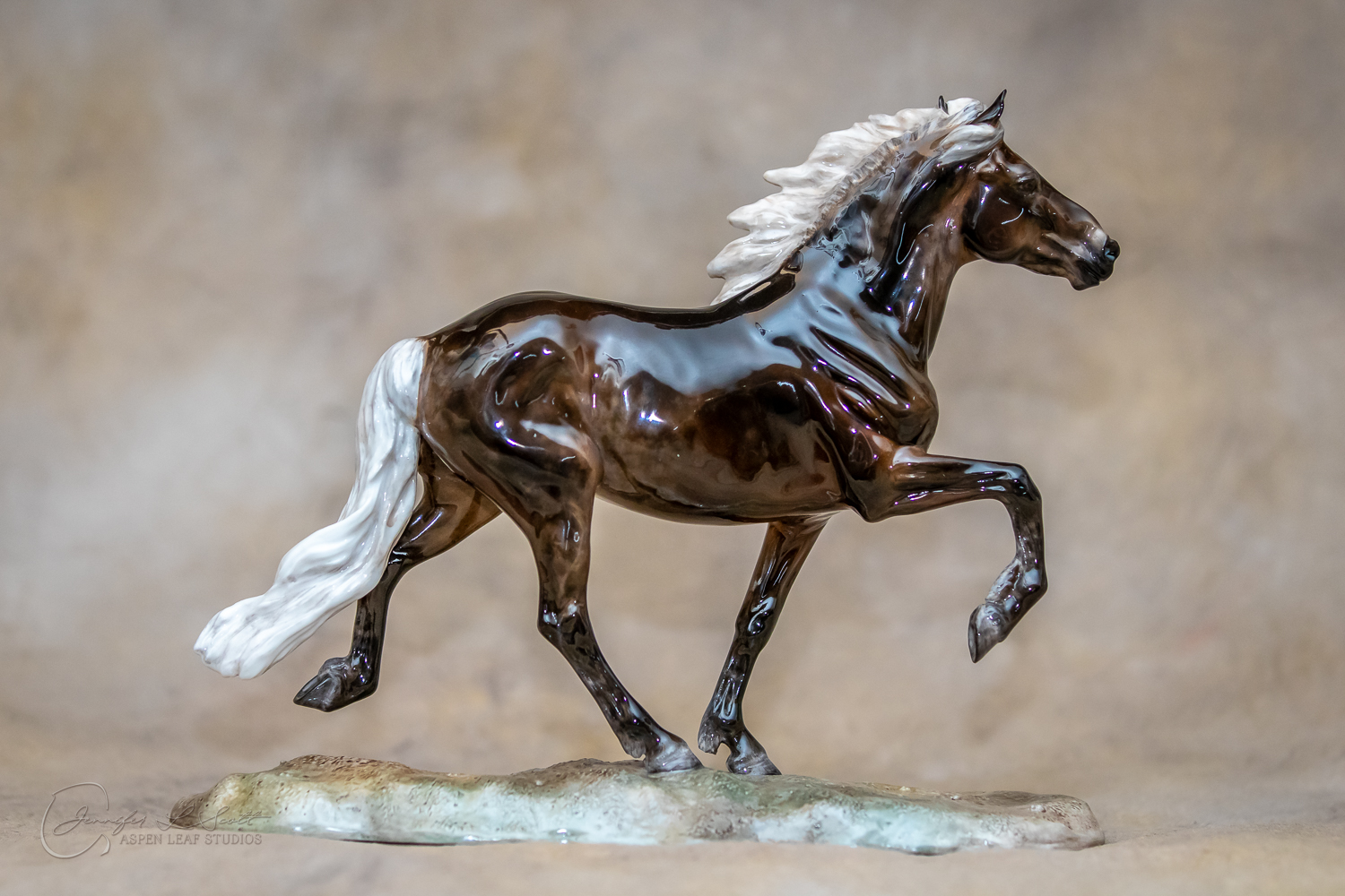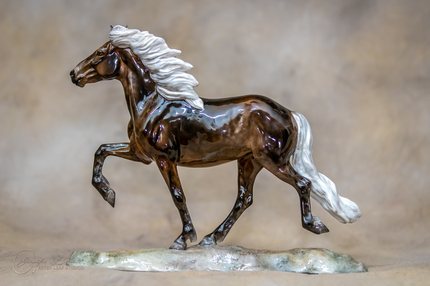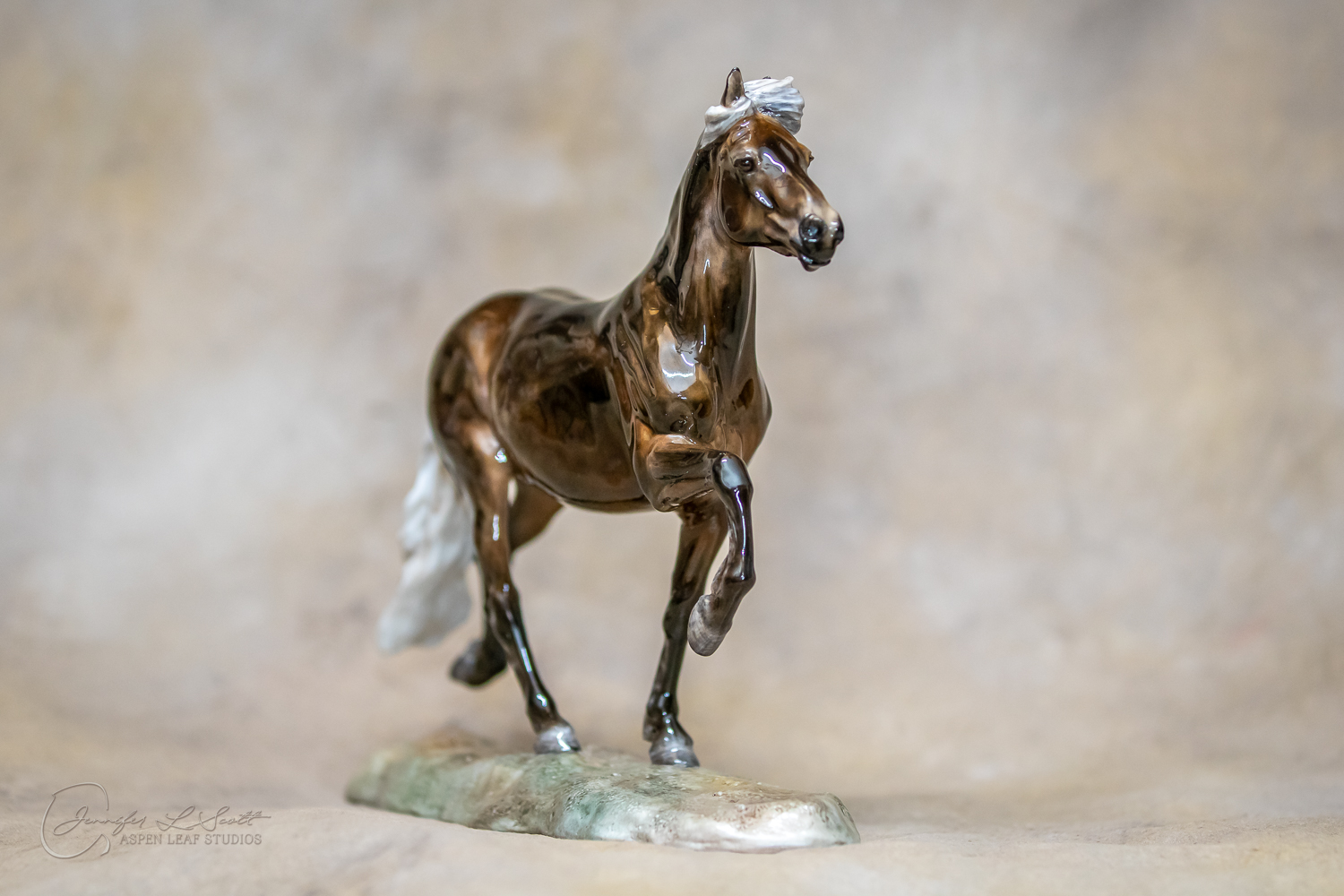 Classic Scale "Bjalla" bone china sculpted by Brigitte Eberl and produced by Horsing around. Glossy finish, overglazed black silver dapple in 2019.