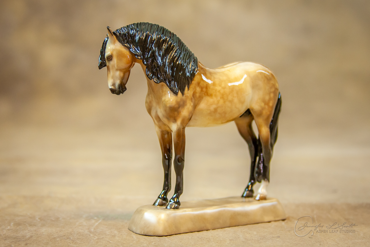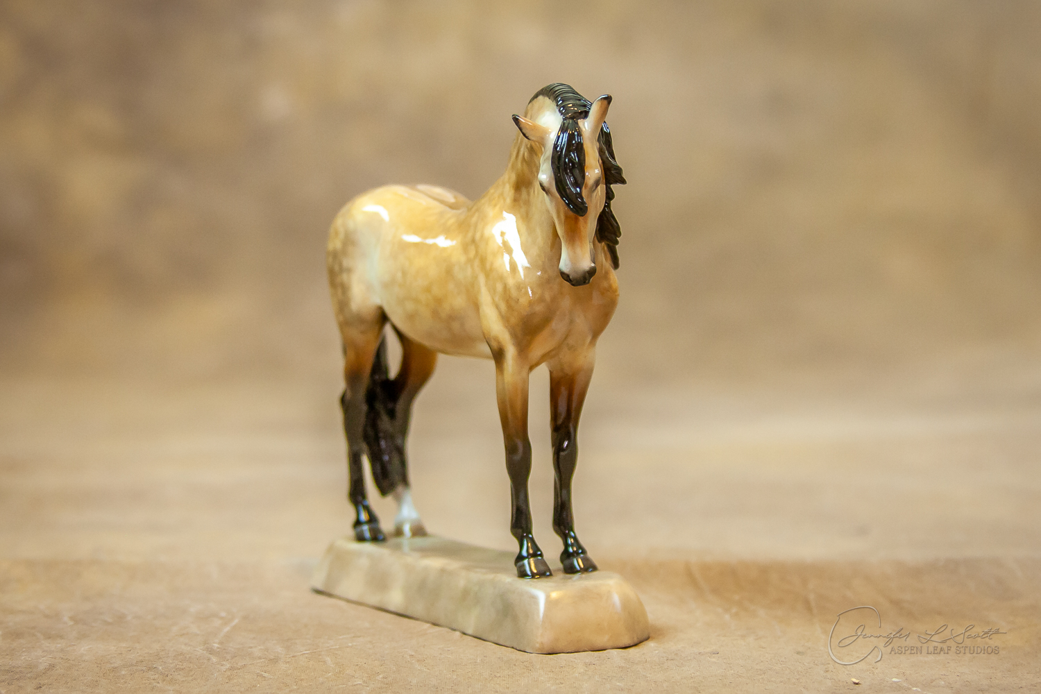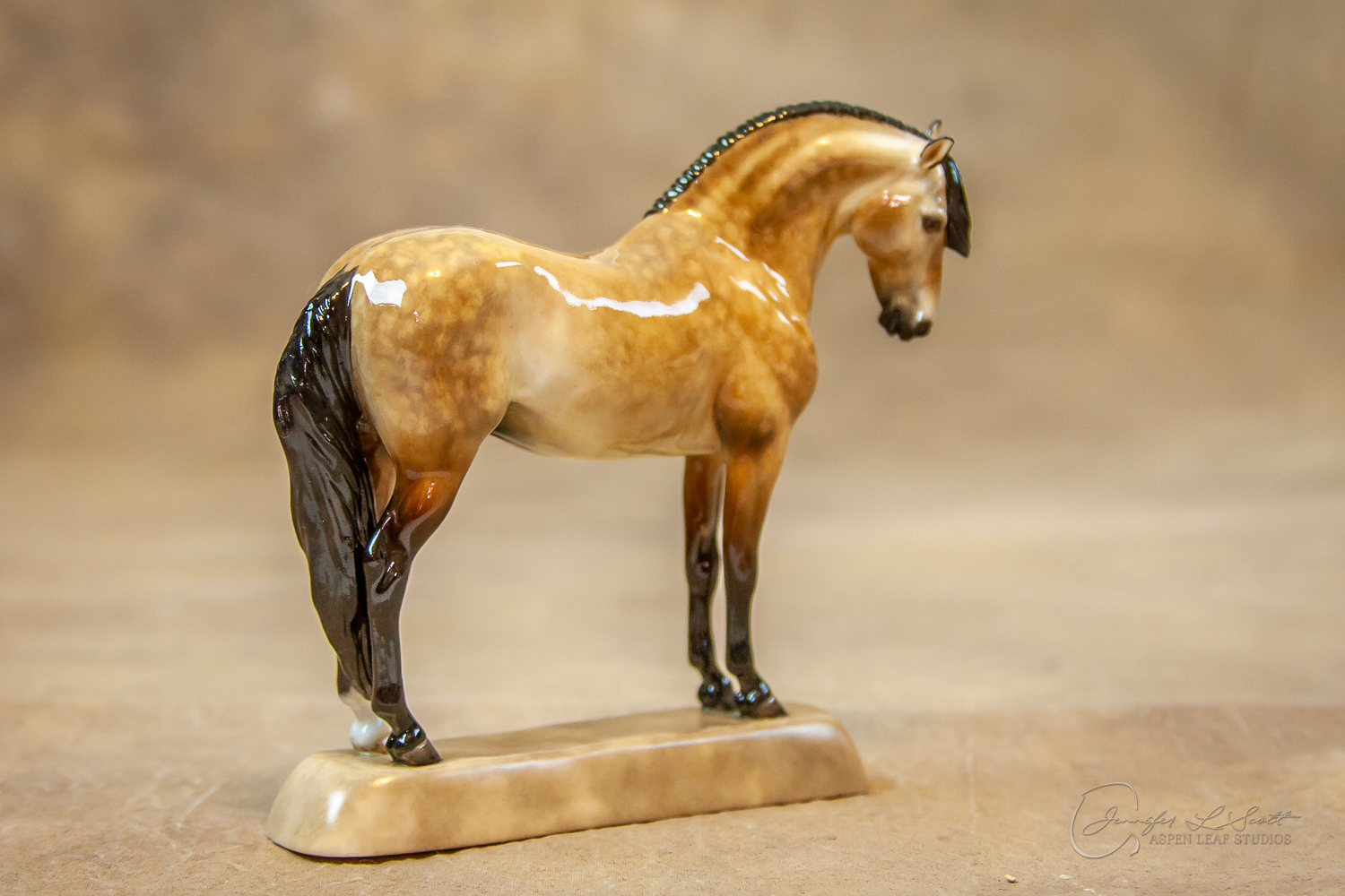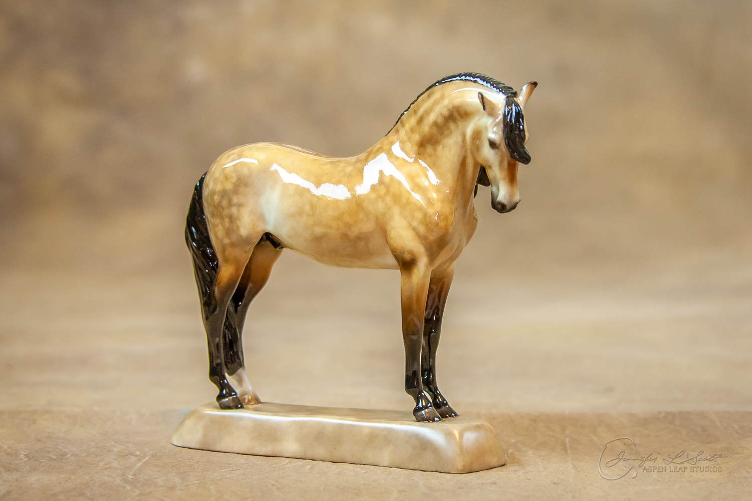 Curio Scale "Fausto" bone china sculpted by Josine Vingerling and produced by Horsing around. Glossy finish, overglazed dappled light buckskin in 2015.