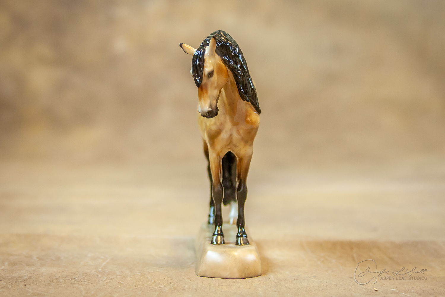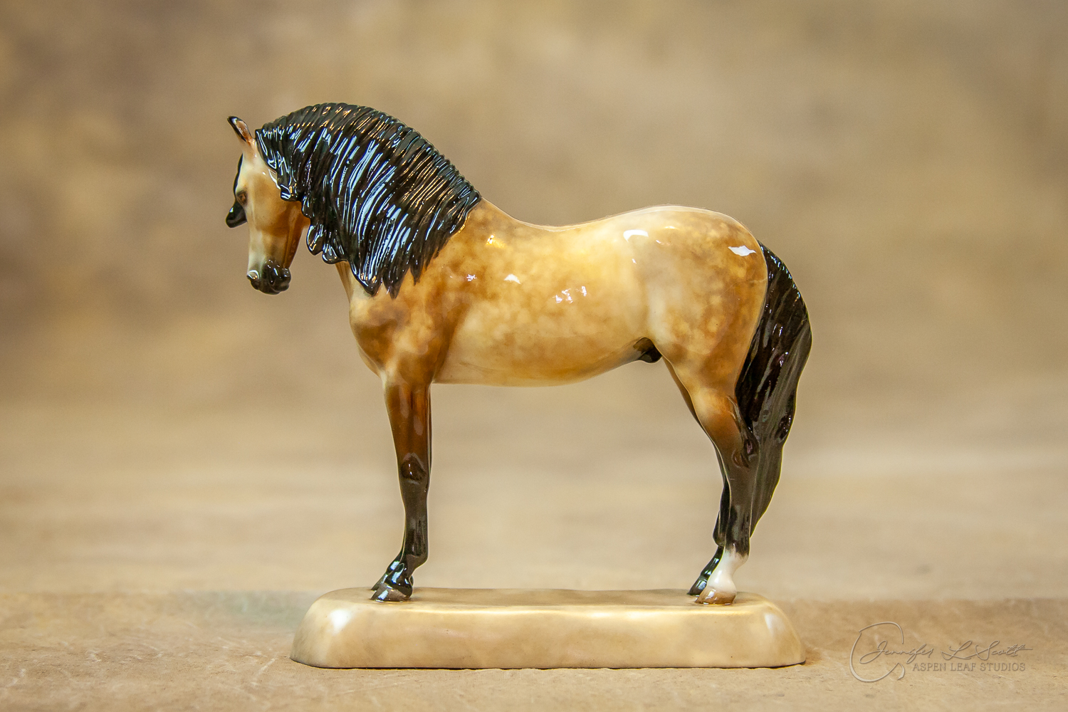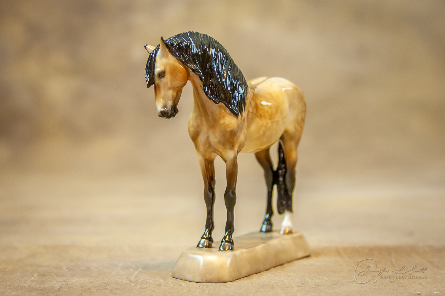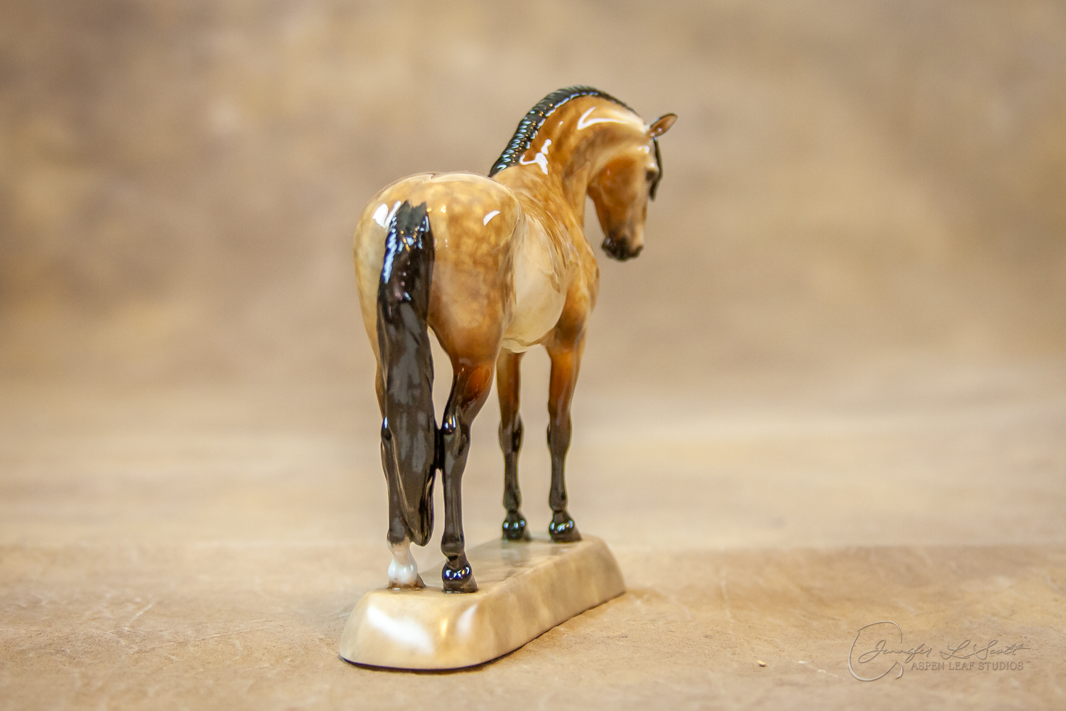 Curio Scale "Fausto" bone china sculpted by Josine Vingerling and produced by Horsing around. Glossy finish, overglazed dappled light buckskin in 2015.