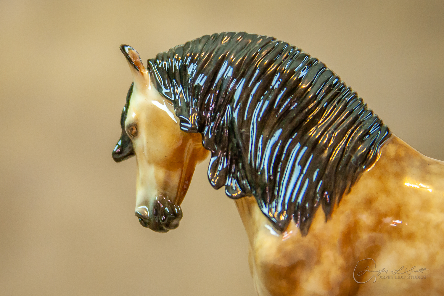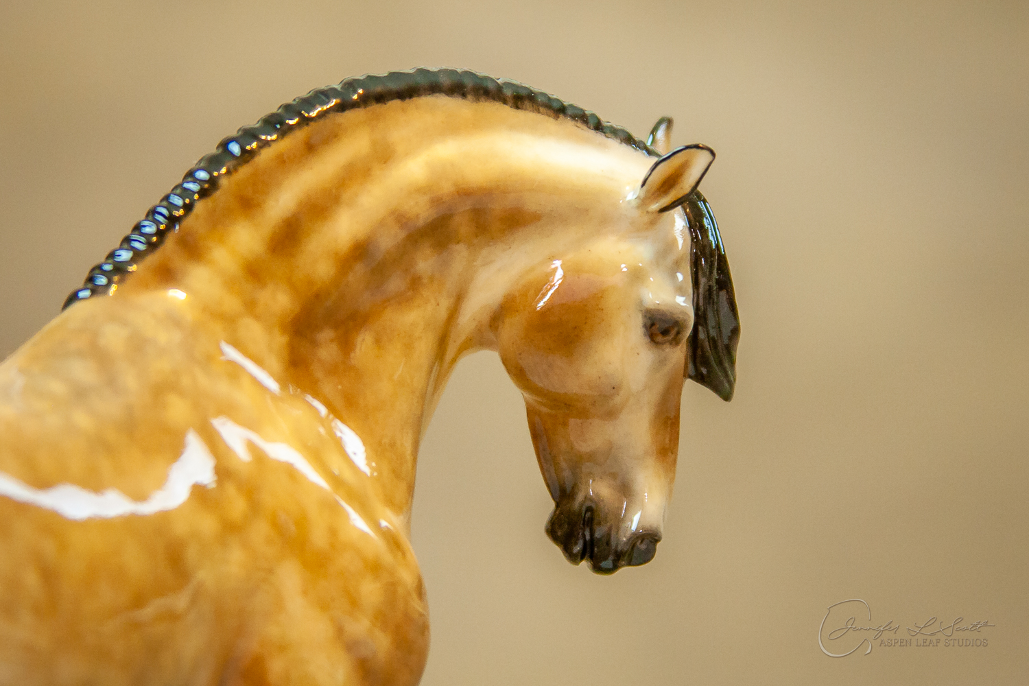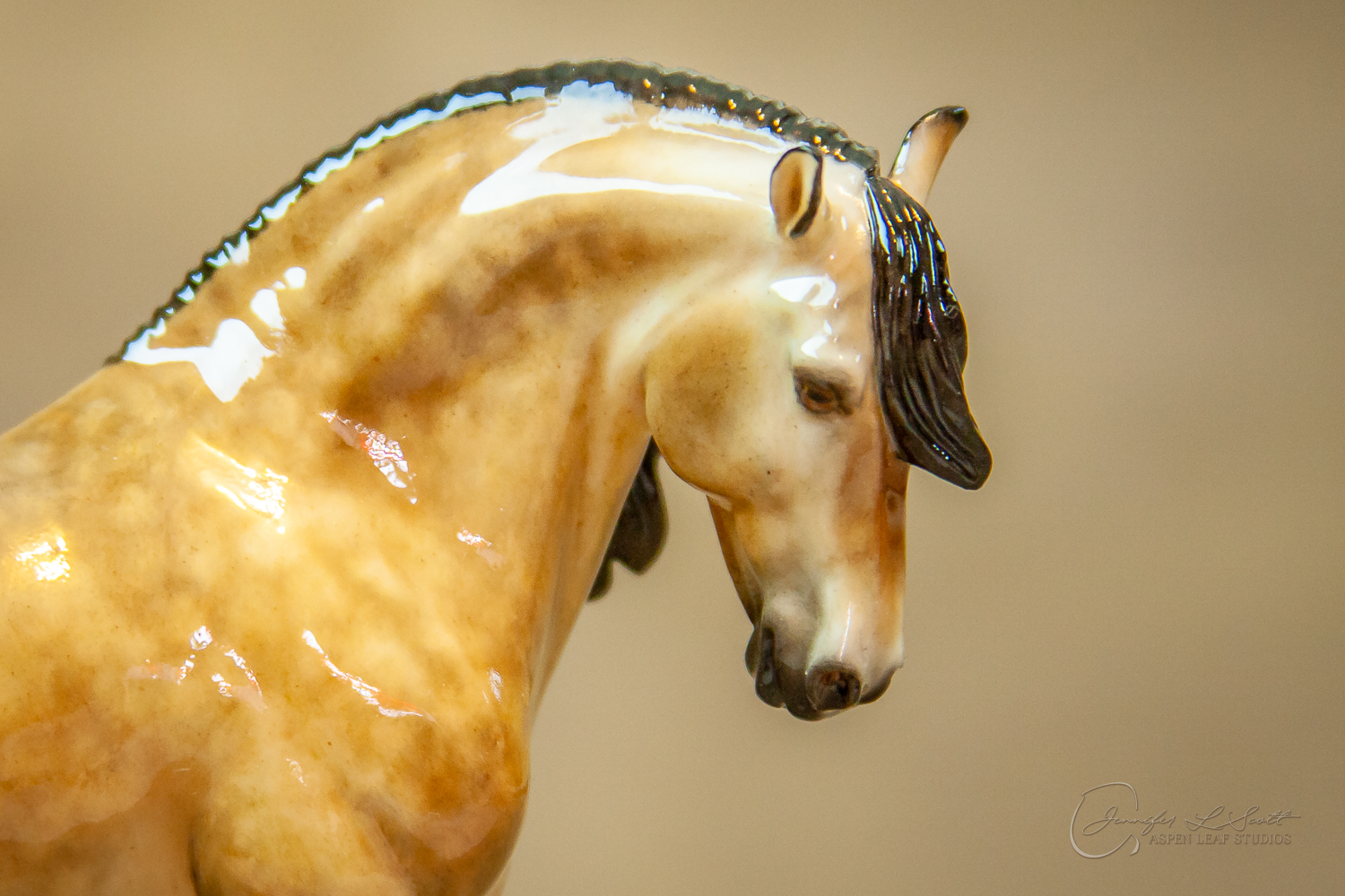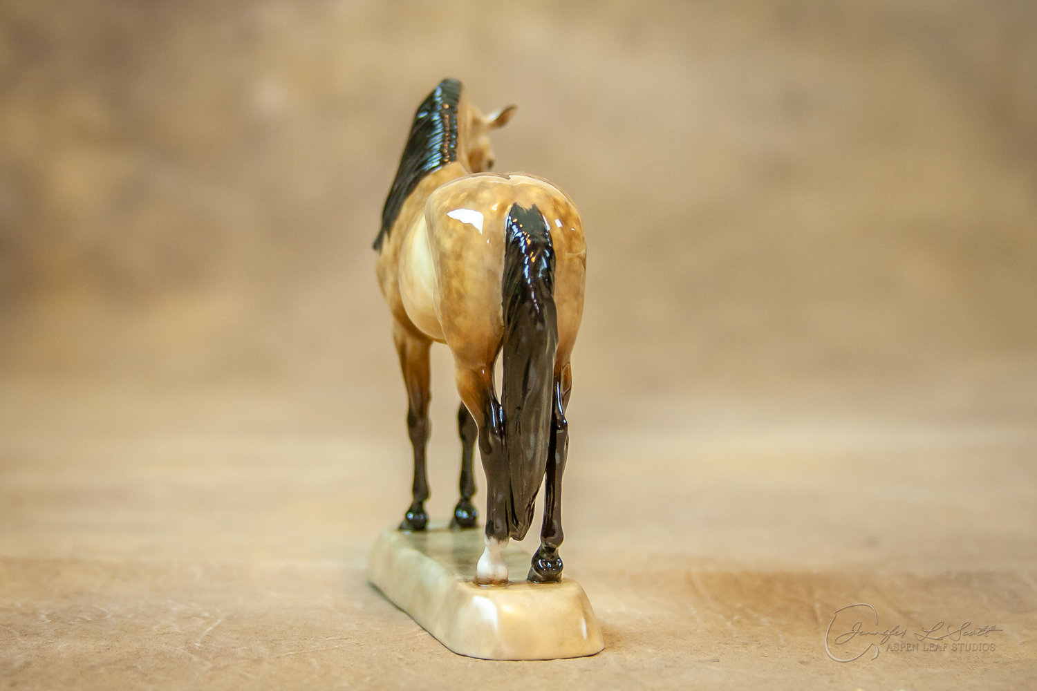 Curio Scale "Fausto" bone china sculpted by Josine Vingerling and produced by Horsing around. Glossy finish, overglazed dappled light buckskin in 2015.