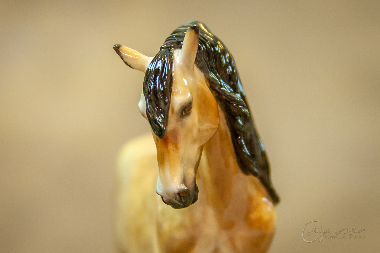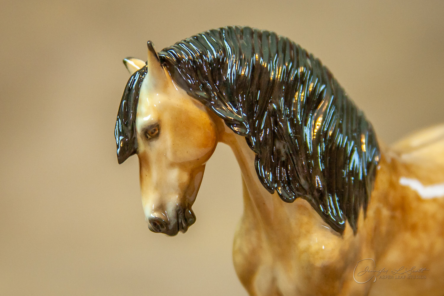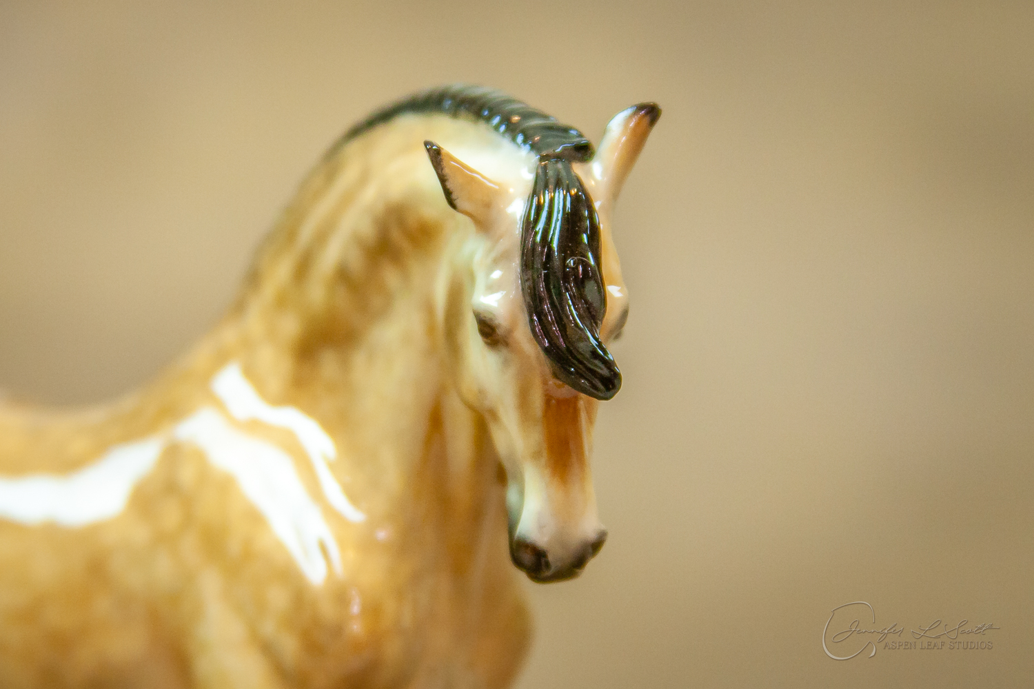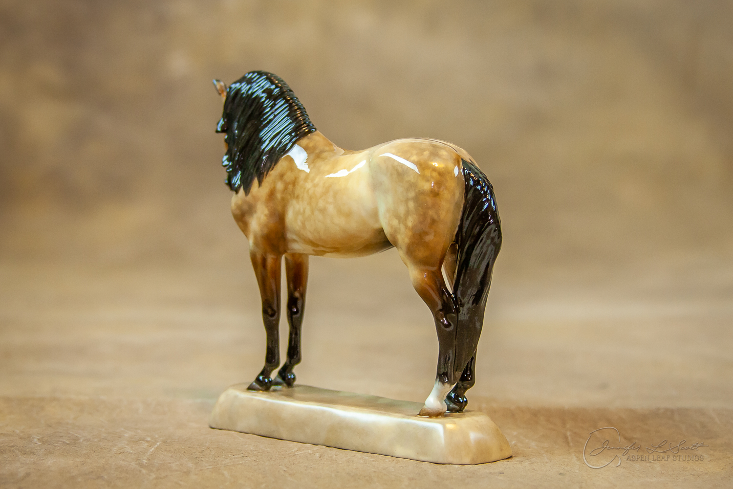 Curio Scale "Fausto" bone china sculpted by Josine Vingerling and produced by Horsing around. Glossy finish, overglazed dappled light buckskin in 2015.