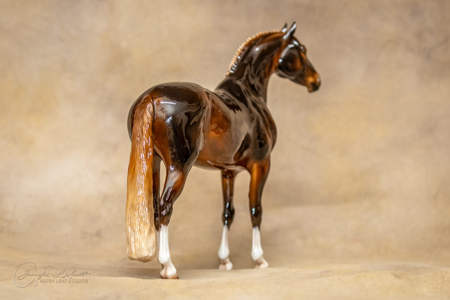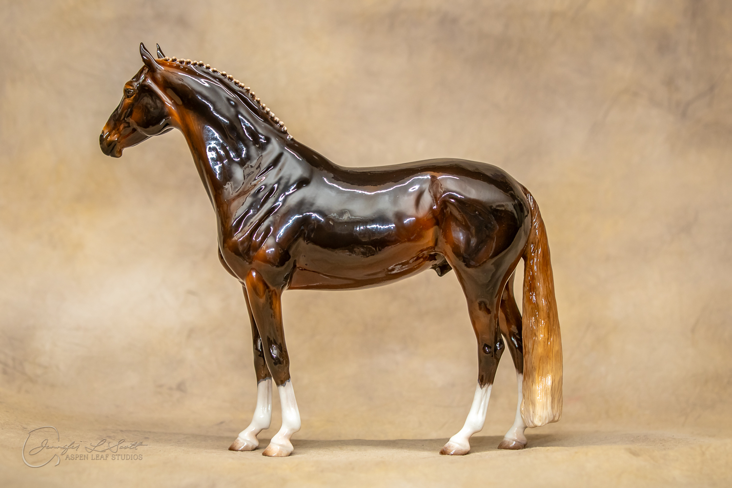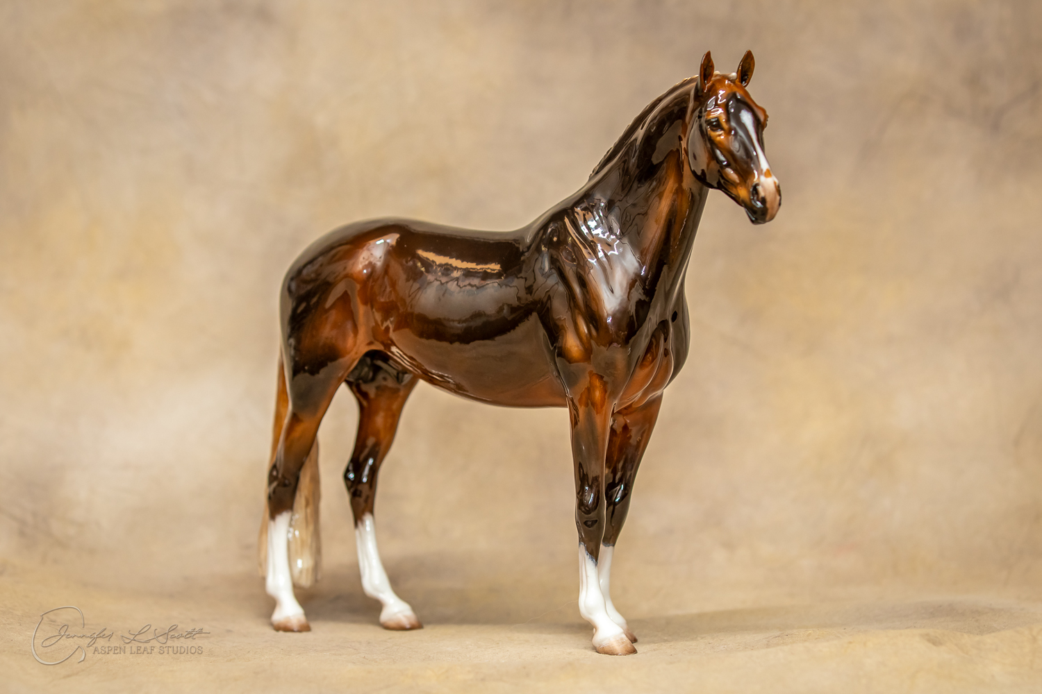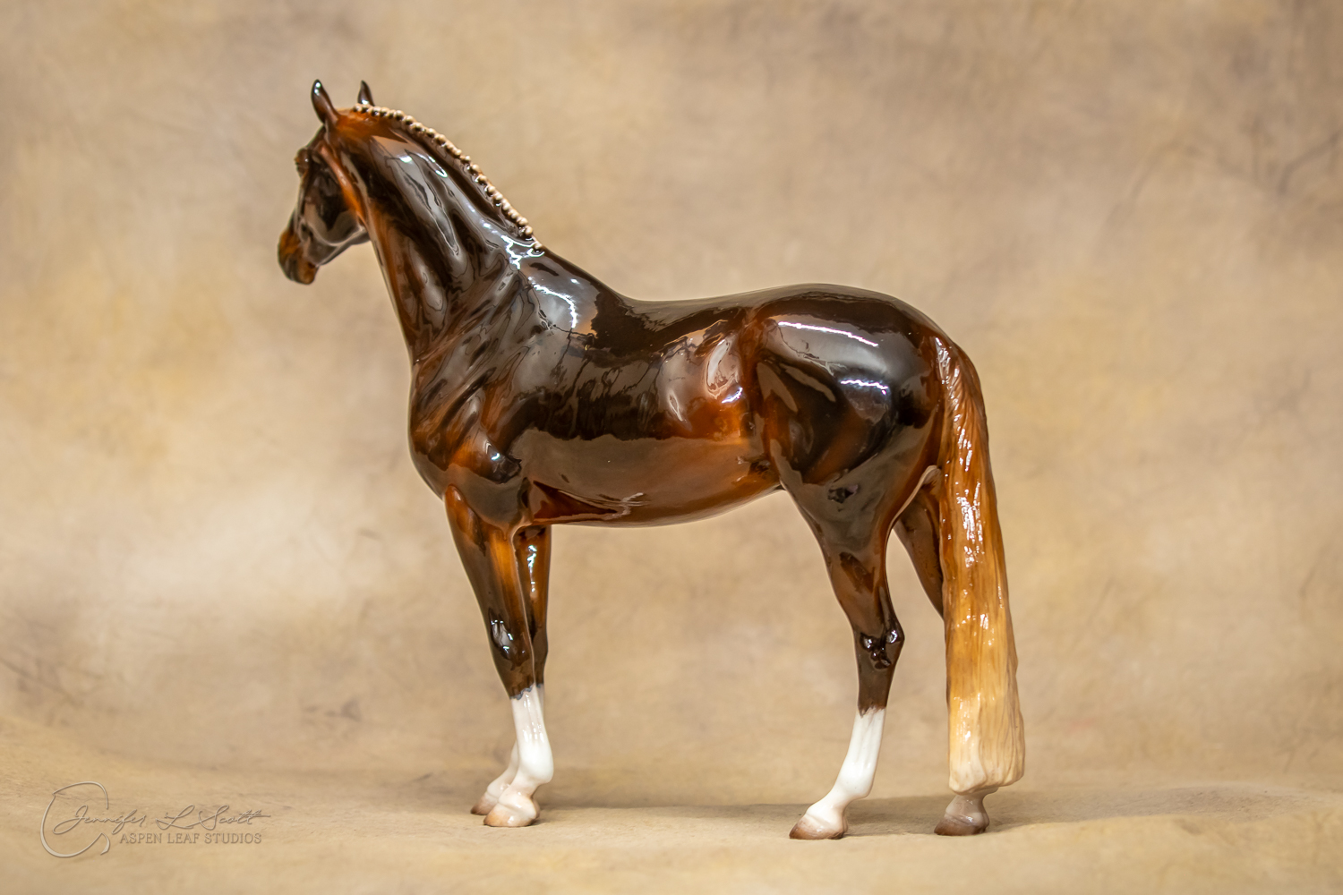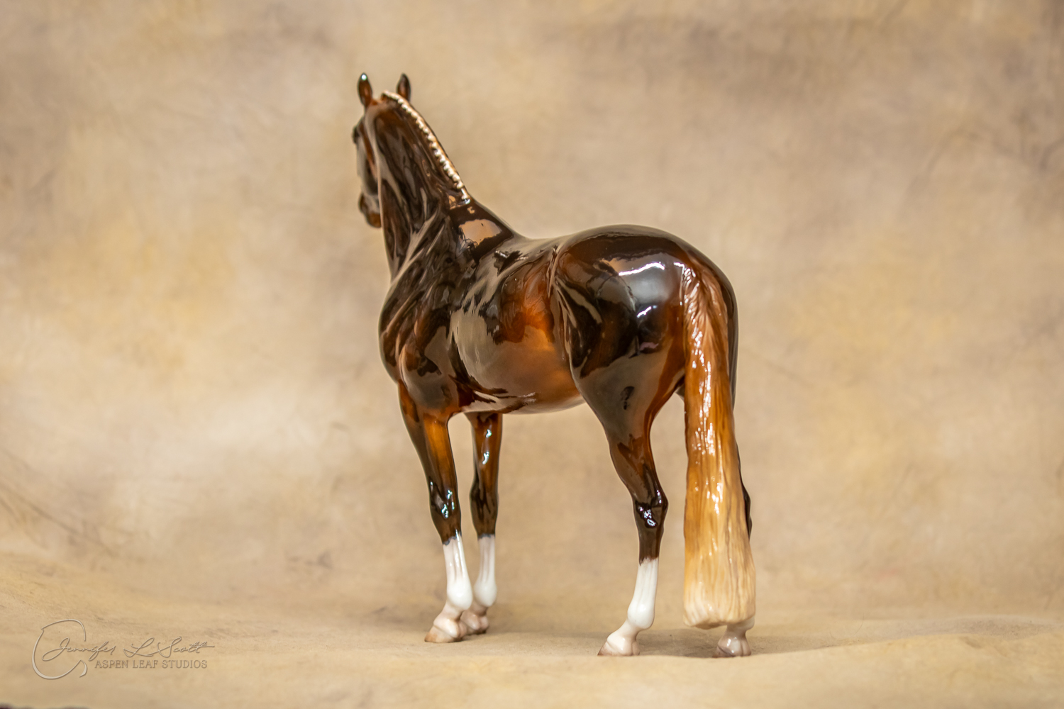 Traditional Scale "Lancelot" bone china sculpted by Brigitte Eberl and produced by Horsing around. Glossy finish, overglazed flaxen dark liver chestnut in 2020.