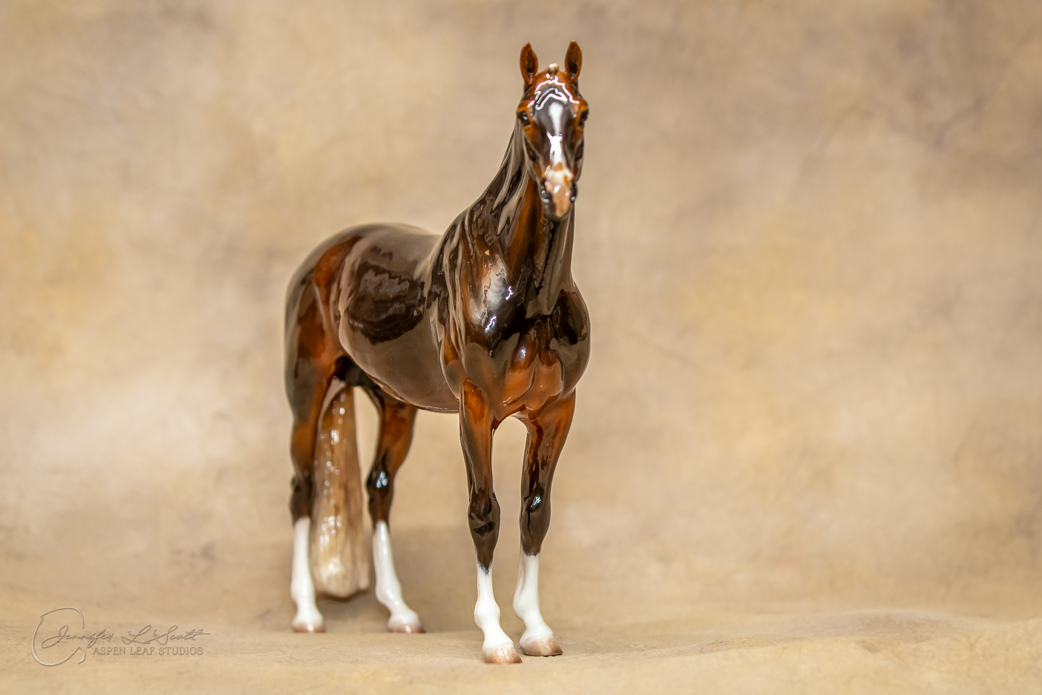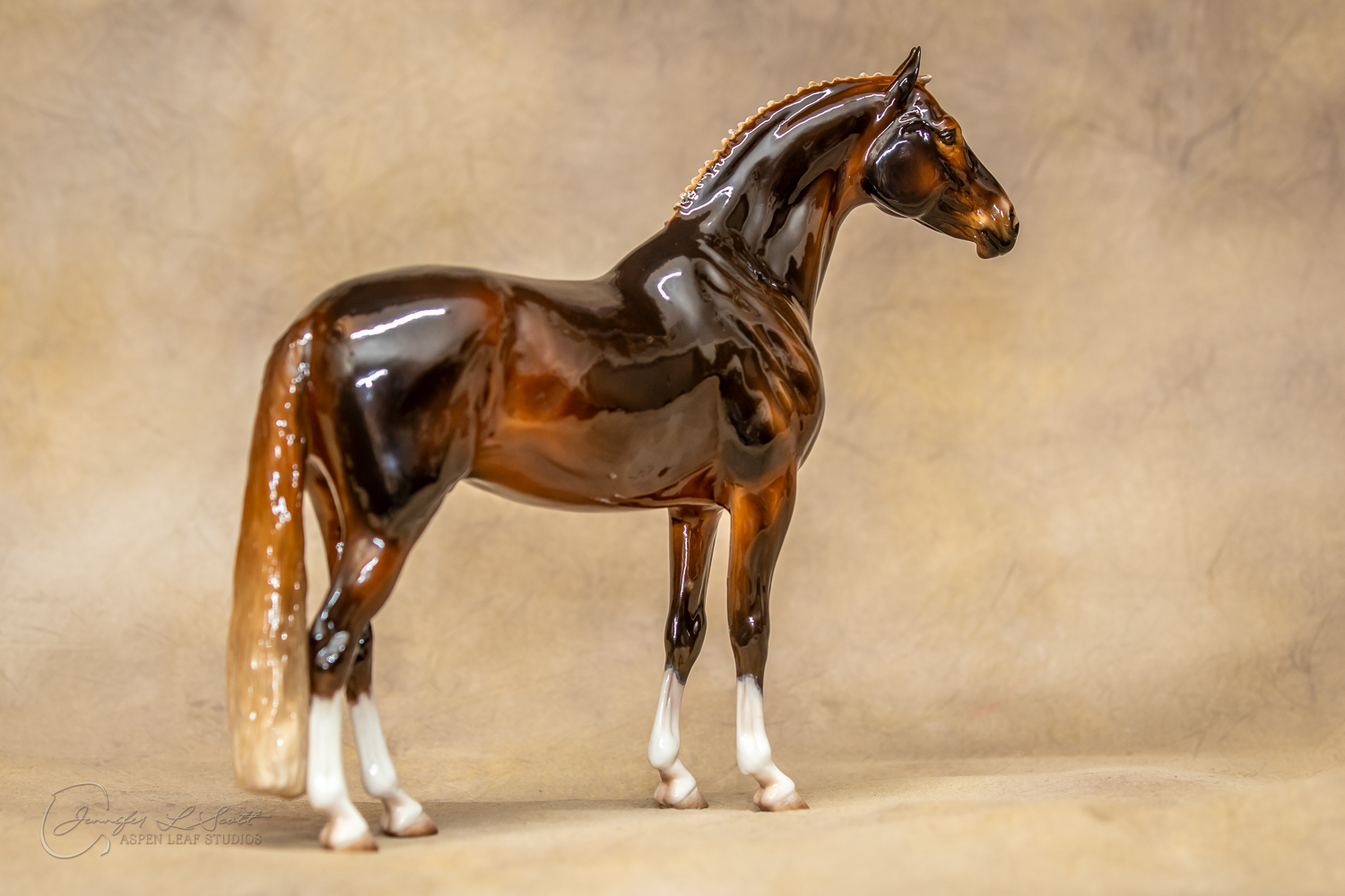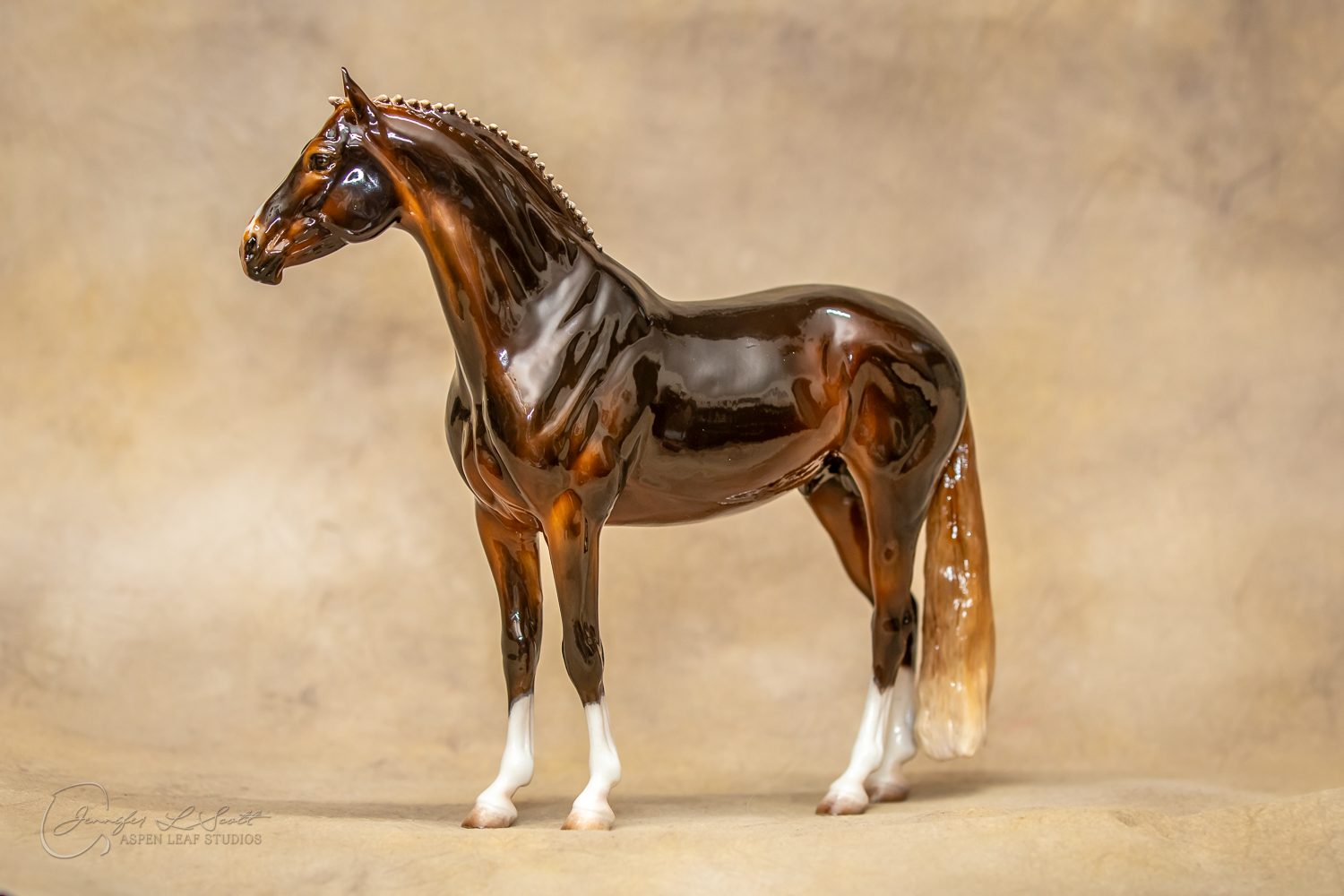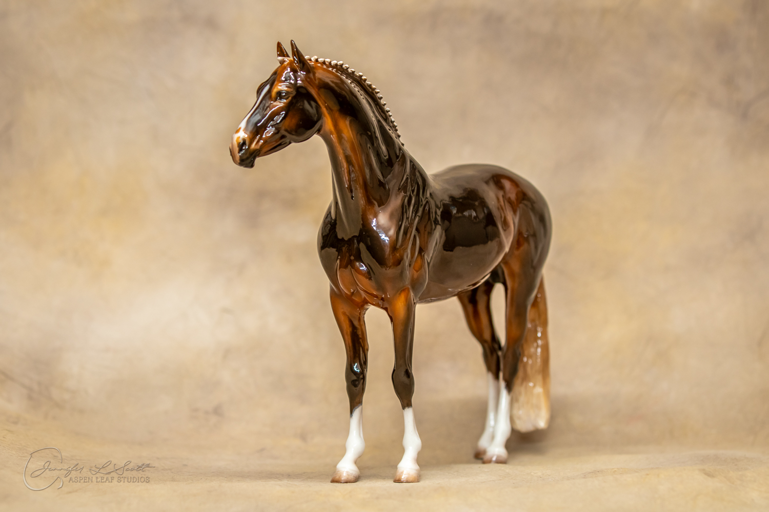 Traditional Scale "Lancelot" bone china sculpted by Brigitte Eberl and produced by Horsing around. Glossy finish, overglazed flaxen dark liver chestnut in 2020.