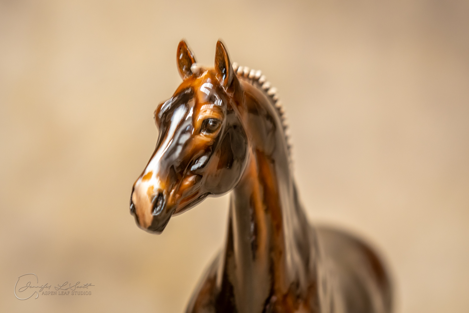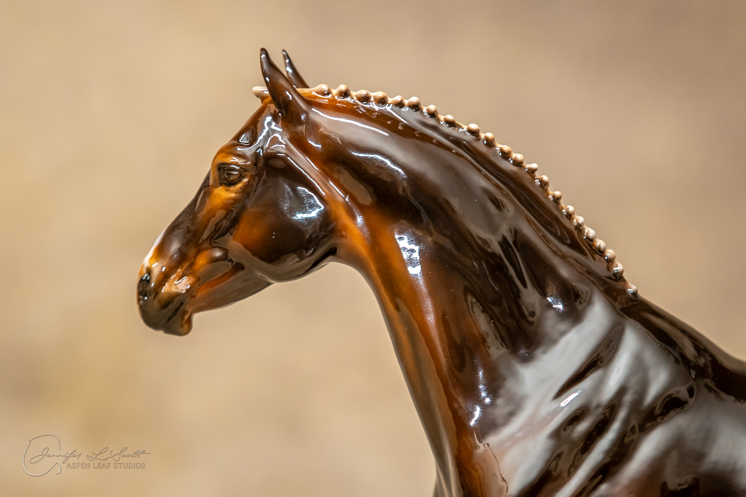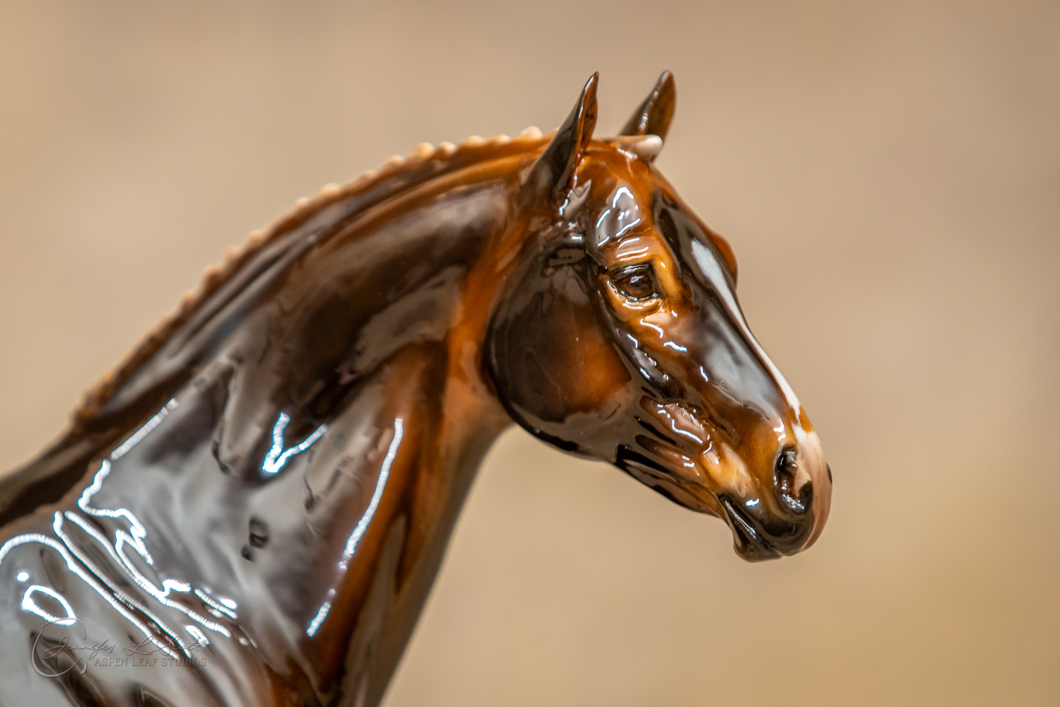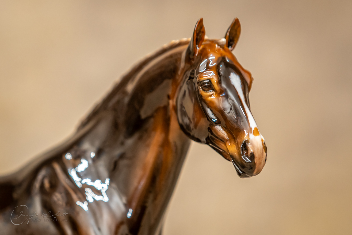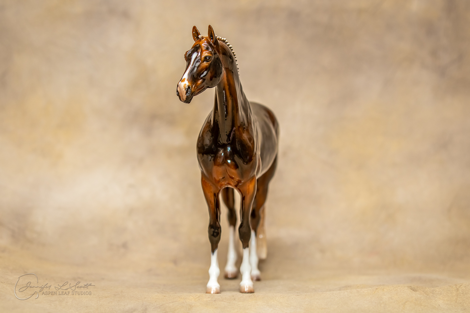 Traditional Scale "Lancelot" bone china sculpted by Brigitte Eberl and produced by Horsing around. Glossy finish, overglazed flaxen dark liver chestnut in 2020.