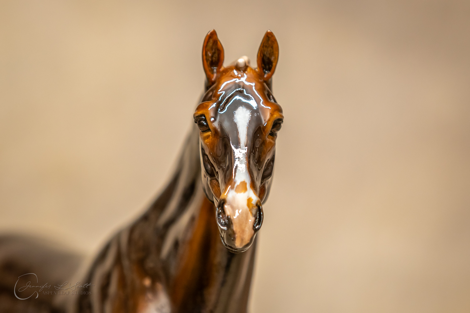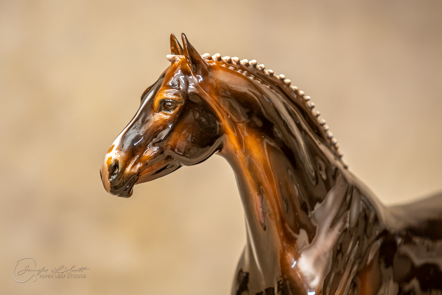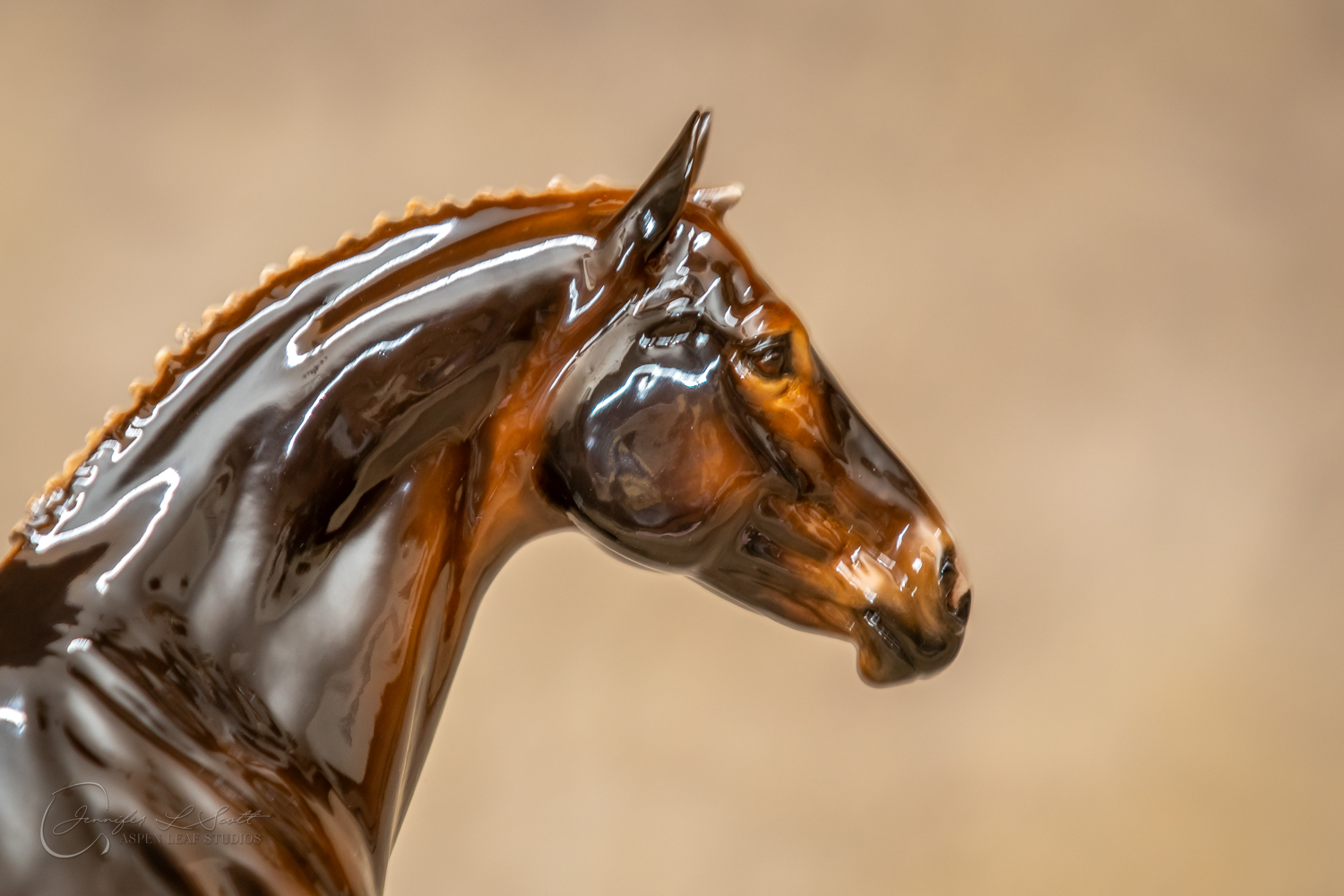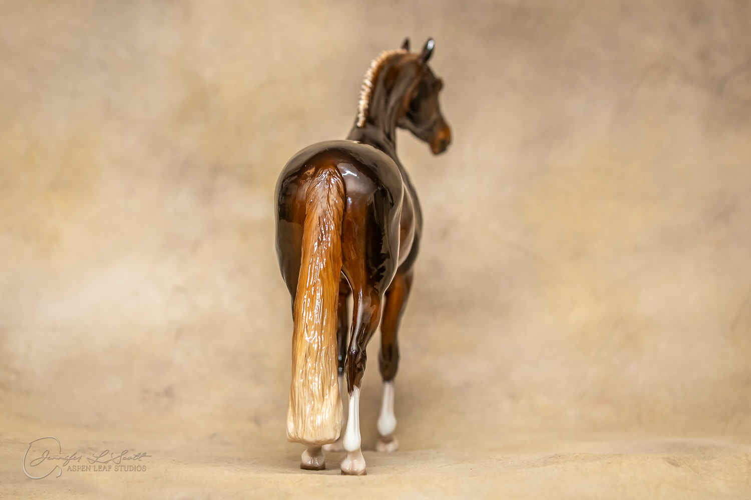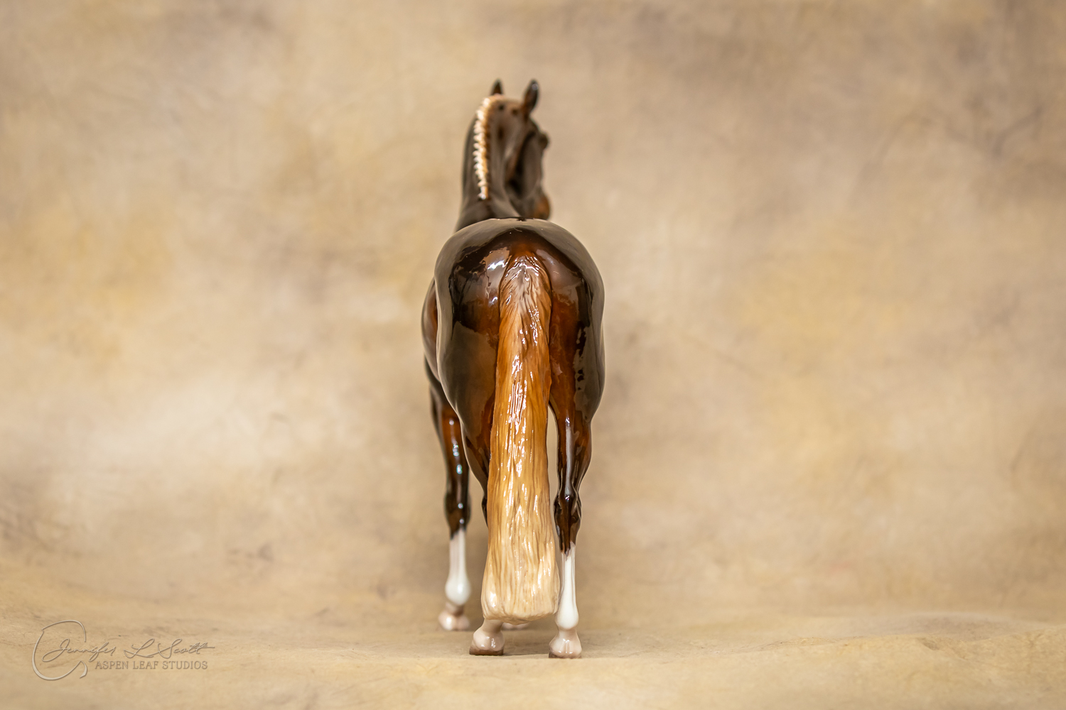 Traditional Scale "Lancelot" bone china sculpted by Brigitte Eberl and produced by Horsing around. Glossy finish, overglazed flaxen dark liver chestnut in 2020.