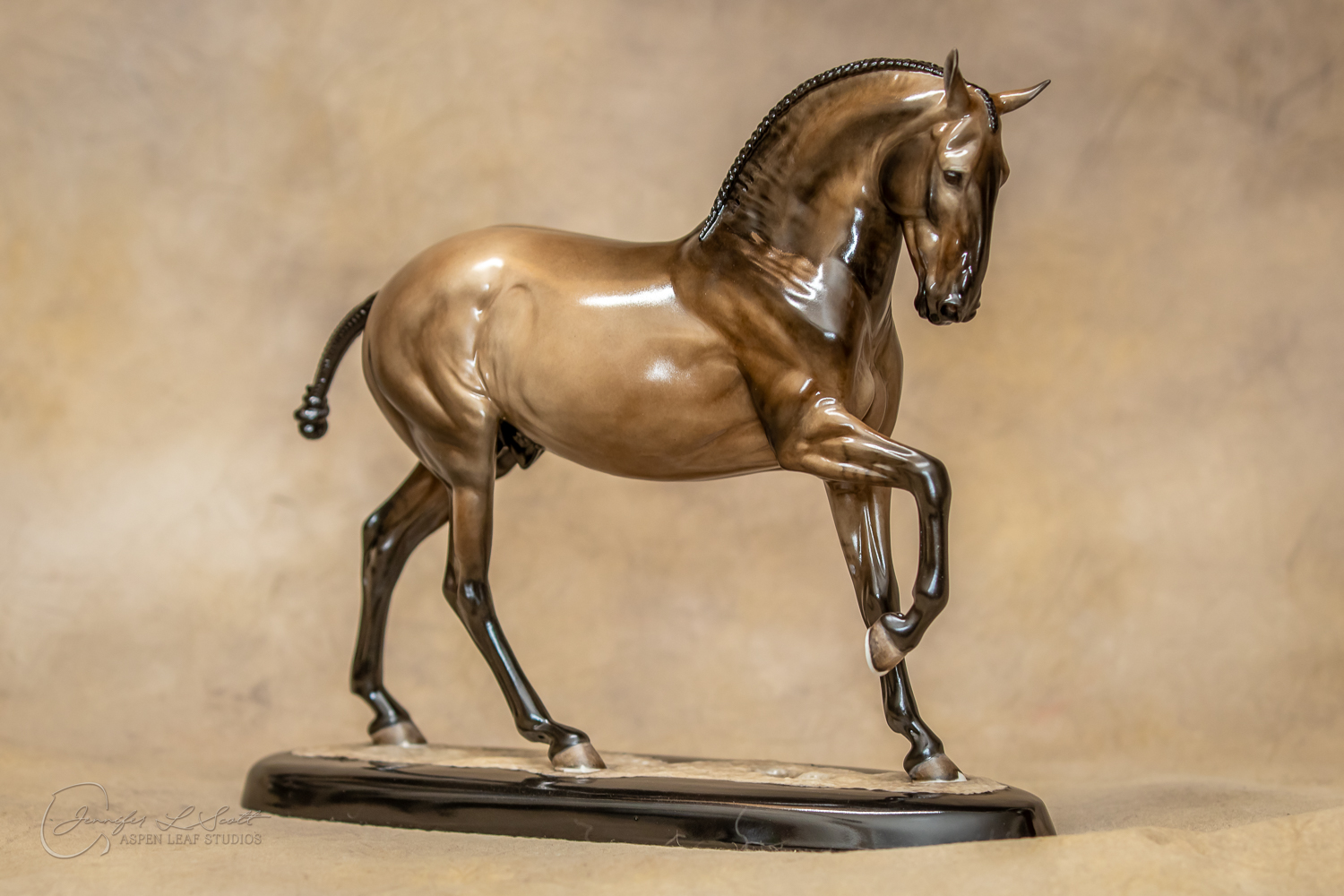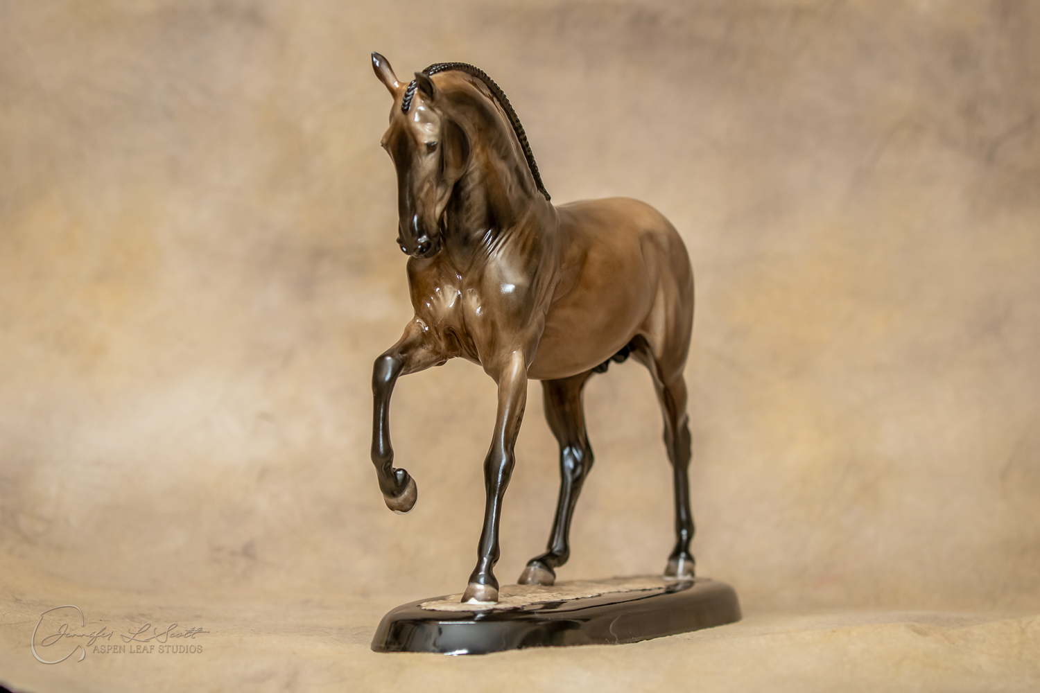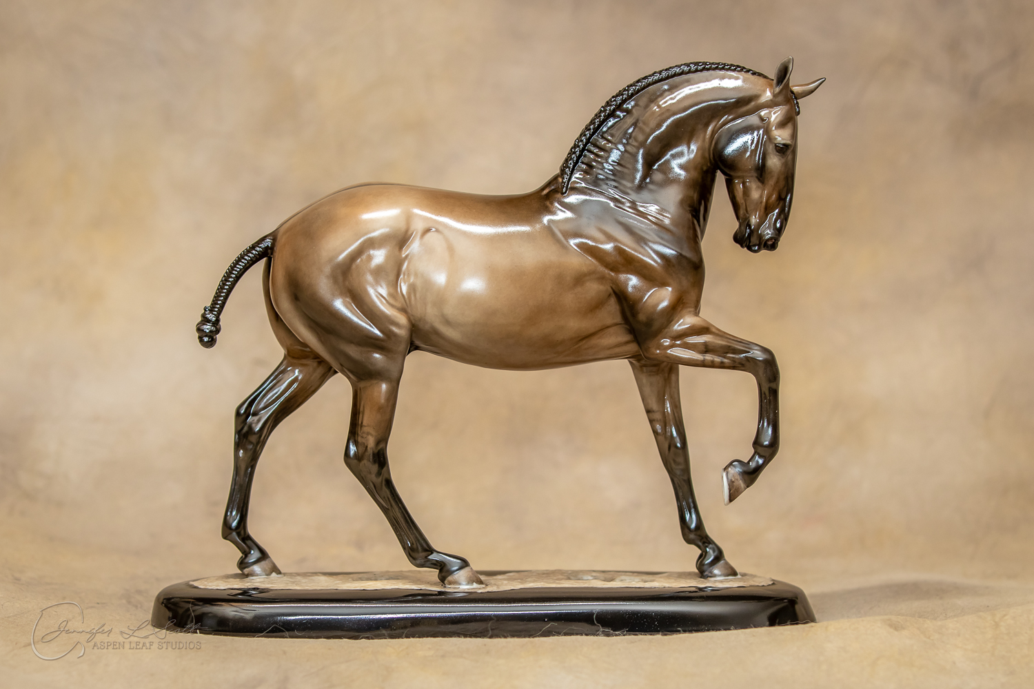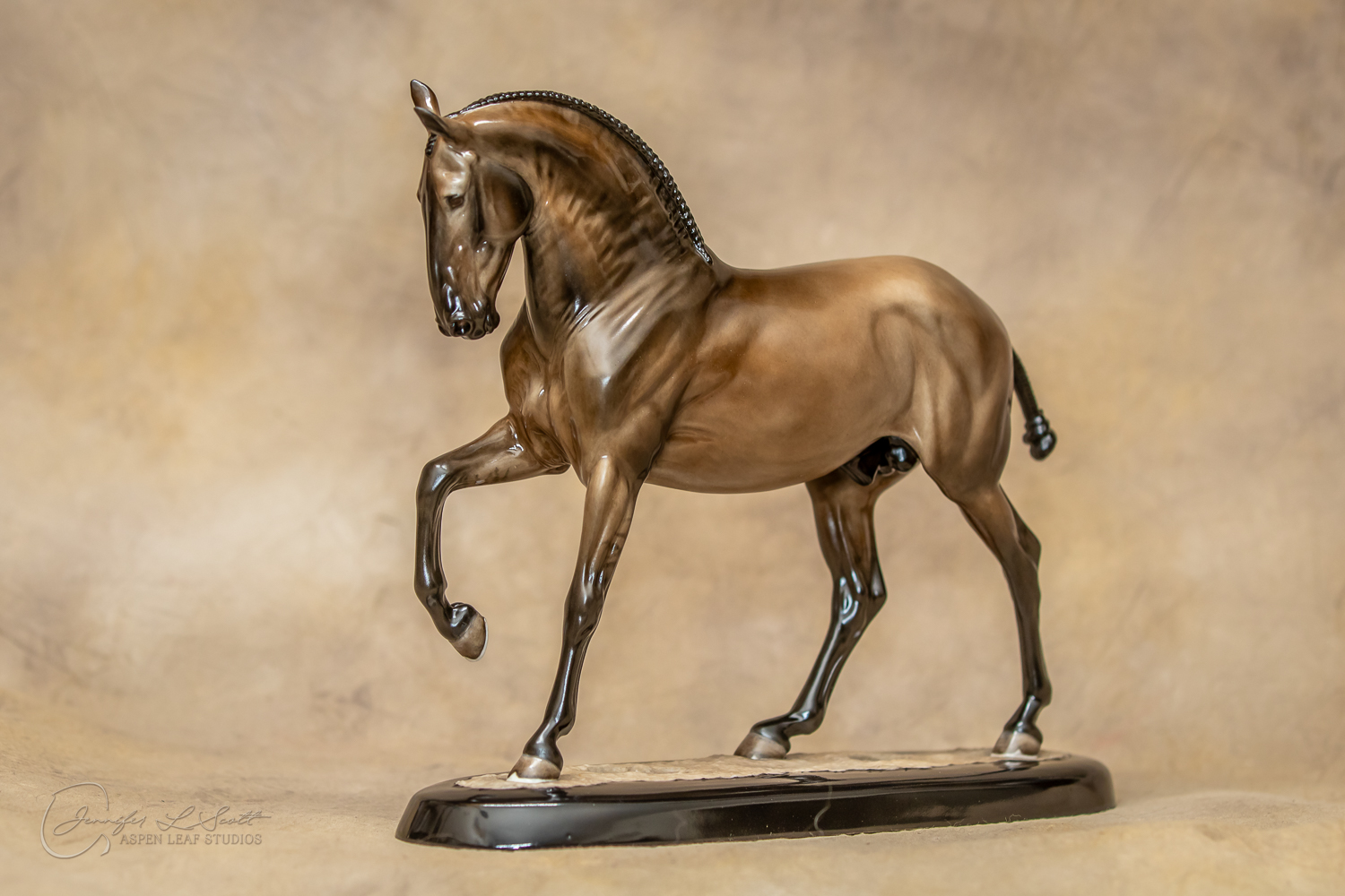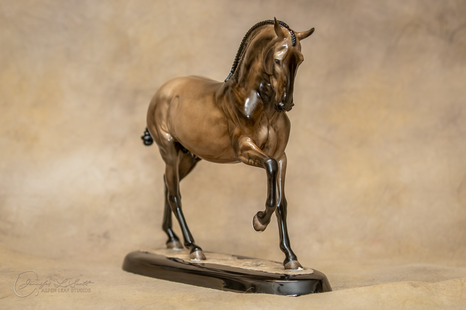 Traditional Scale "Leonardo" bone china sculpted by Emilia Kurilla and produced by Animal Artistry on behalf of Thomas Bainbridge. This is the Spanish knot tail version and officially number GA24 of the run. Satin finish, overglazed grulla in 2020. His base is glossy black with satin sand.