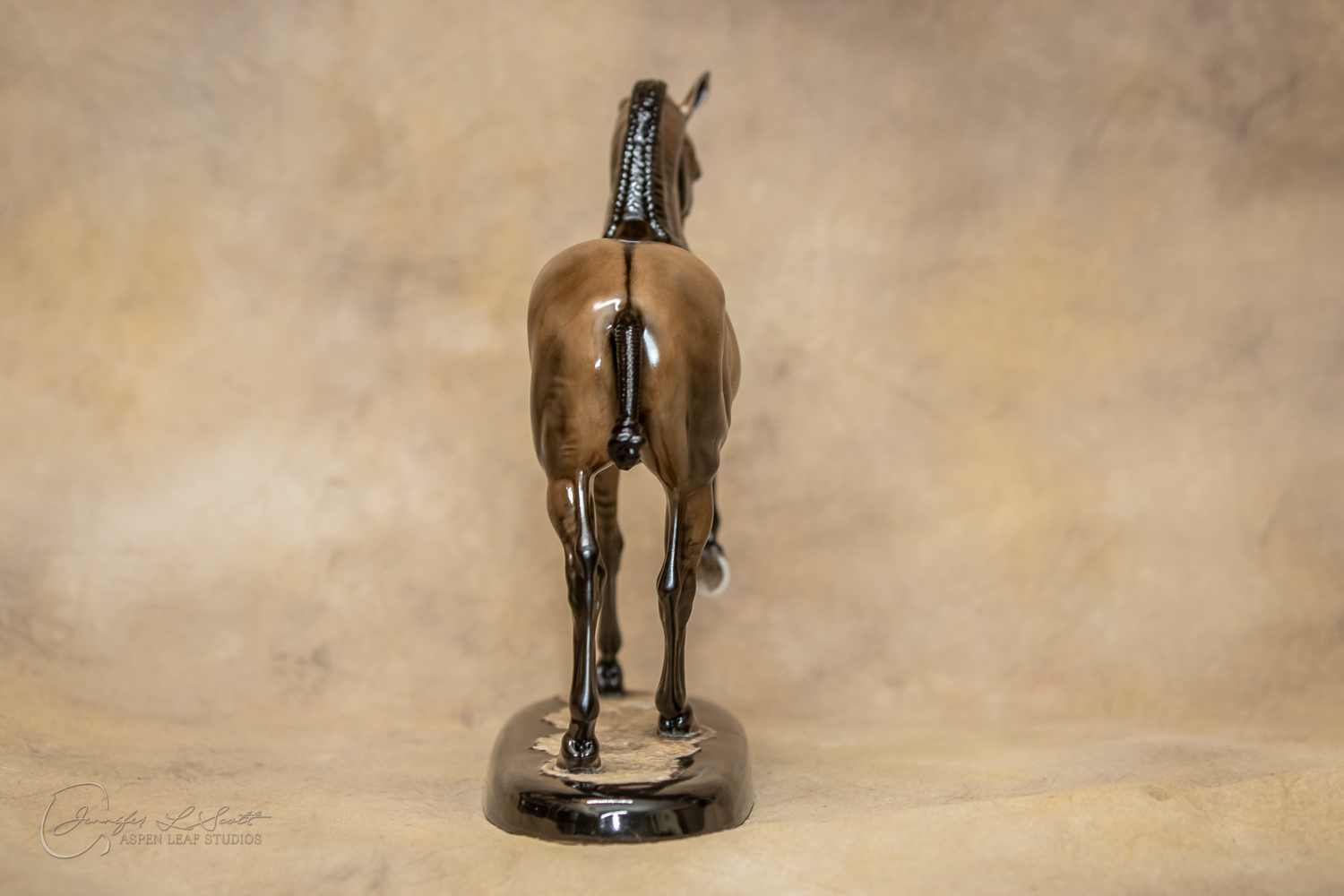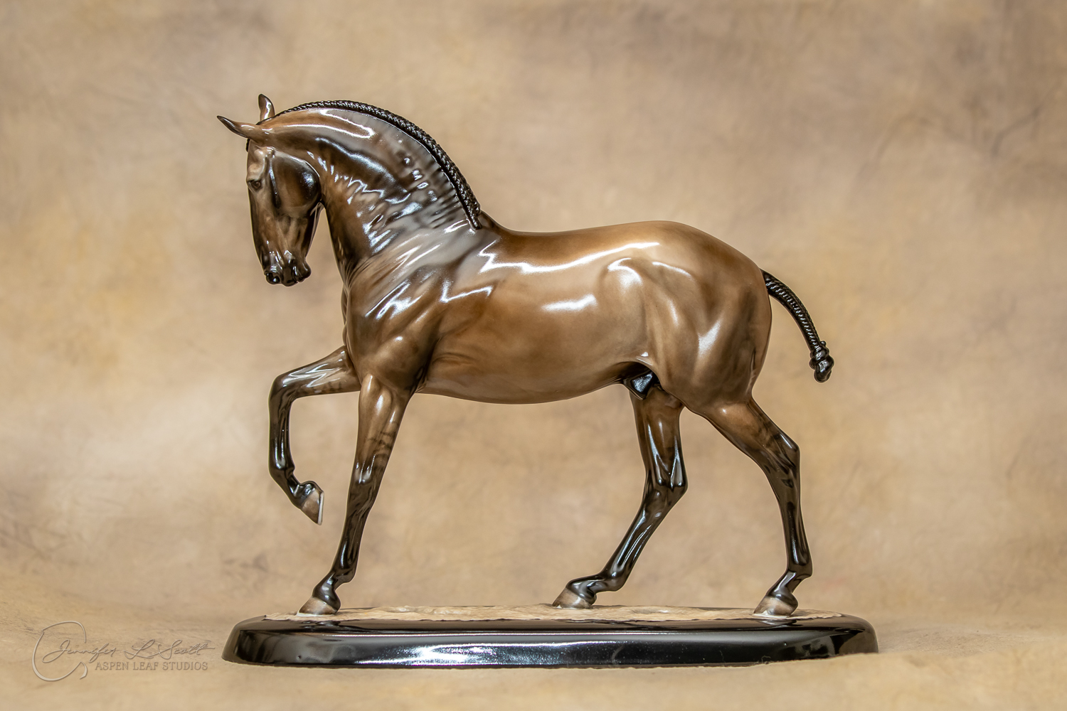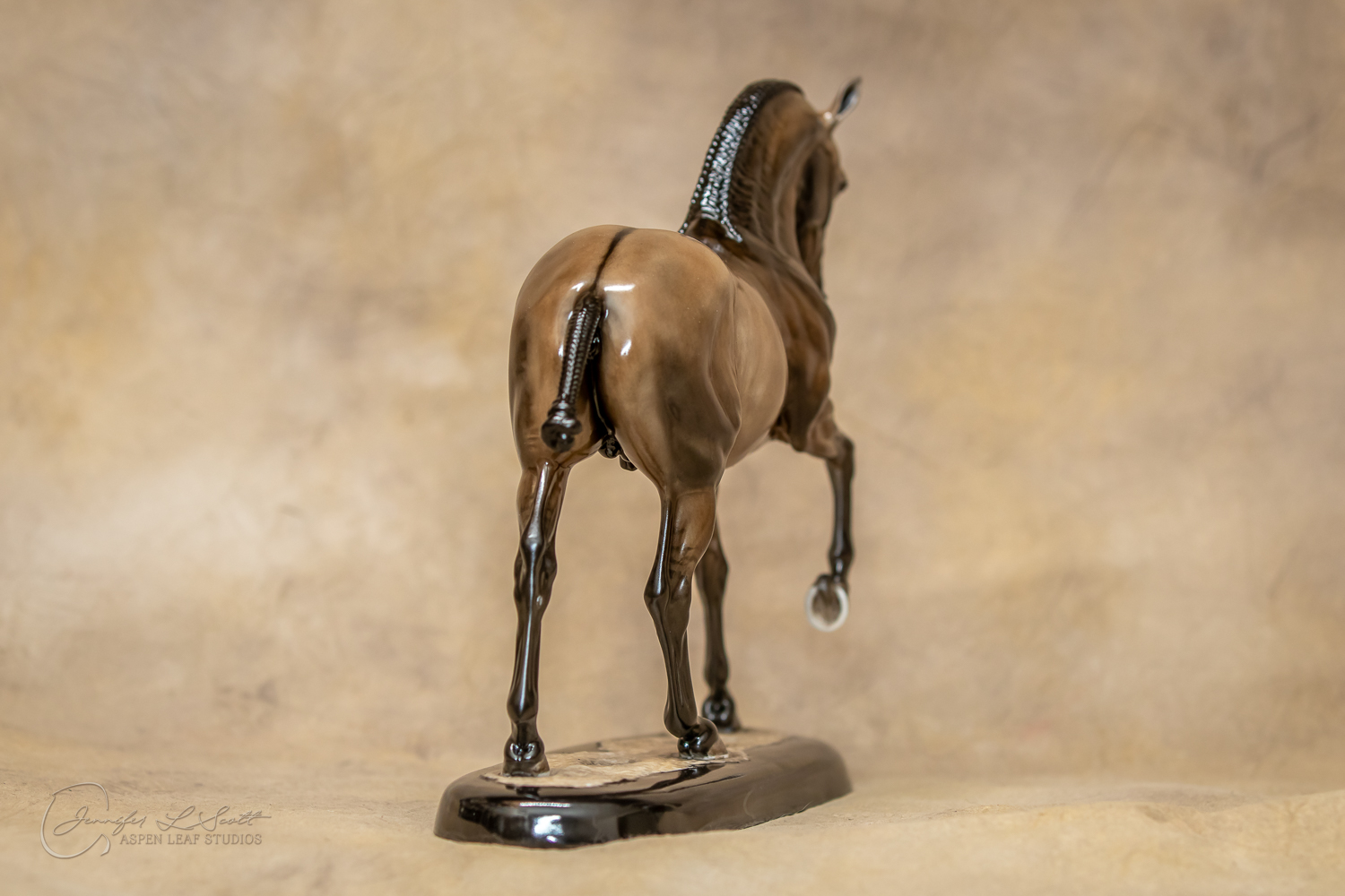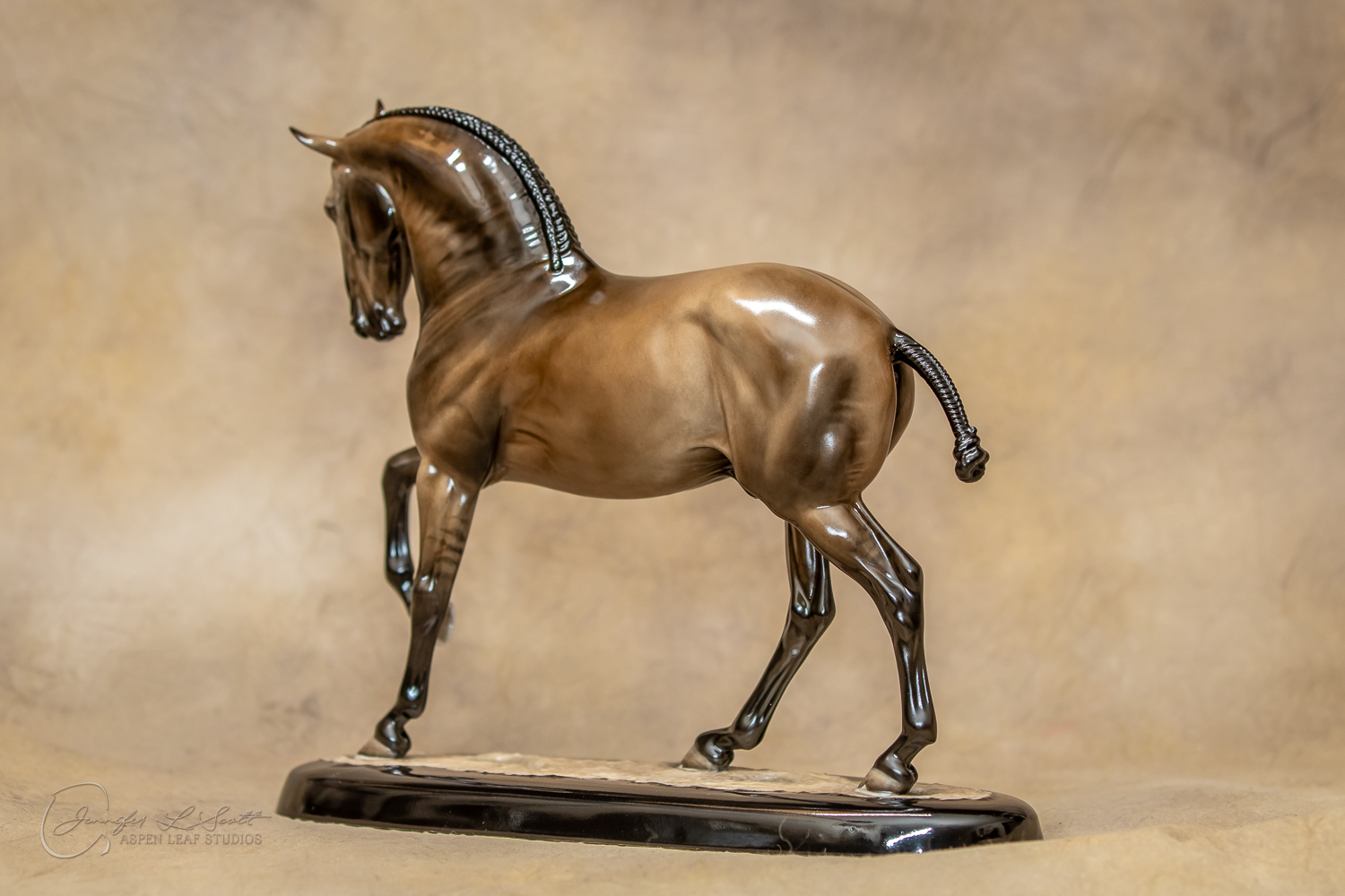 Traditional Scale "Leonardo" bone china sculpted by Emilia Kurilla and produced by Animal Artistry on behalf of Thomas Bainbridge. This is the Spanish knot tail version and officially number GA24 of the run. Satin finish, overglazed grulla in 2020. His base is glossy black with satin sand.