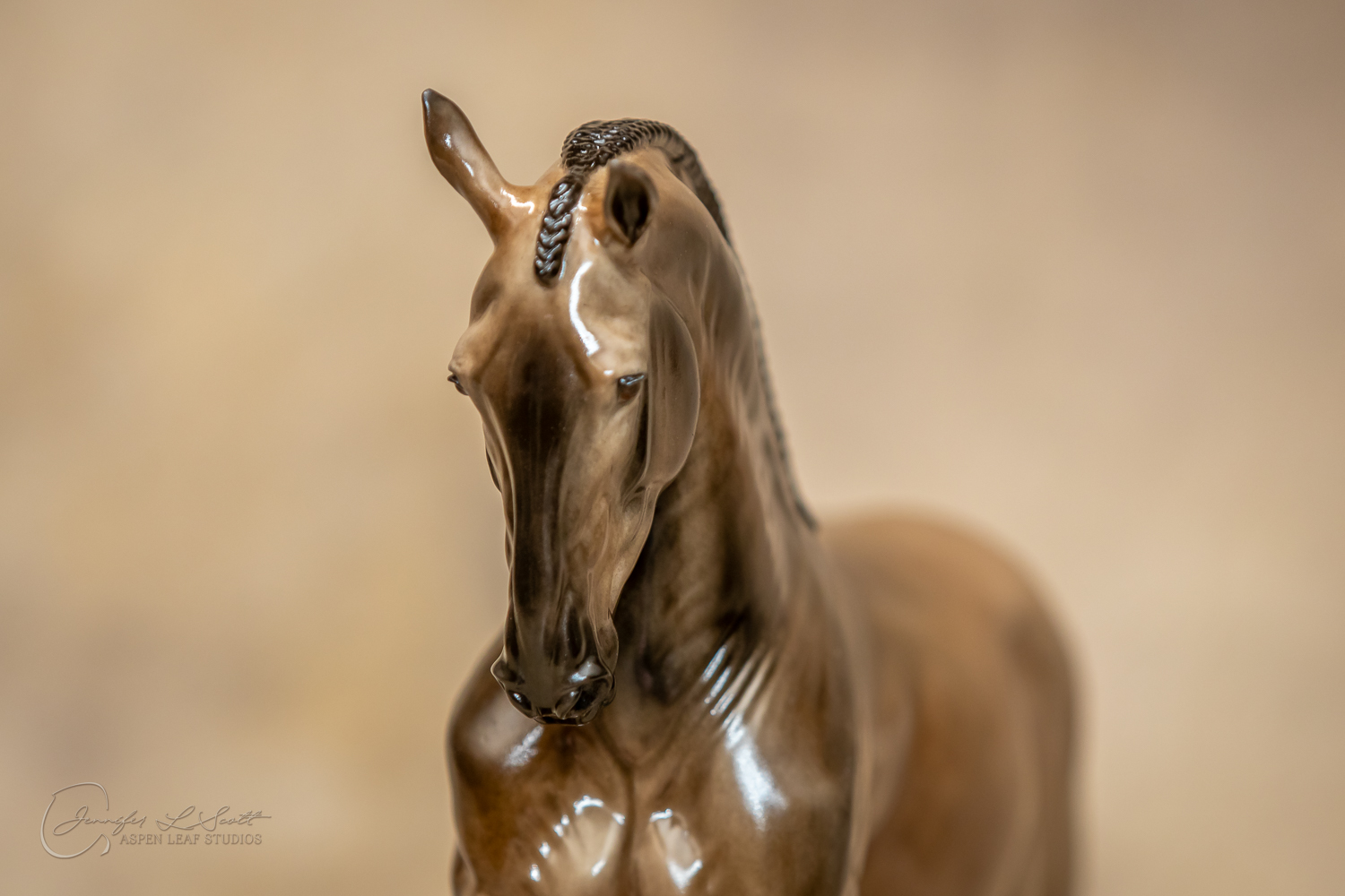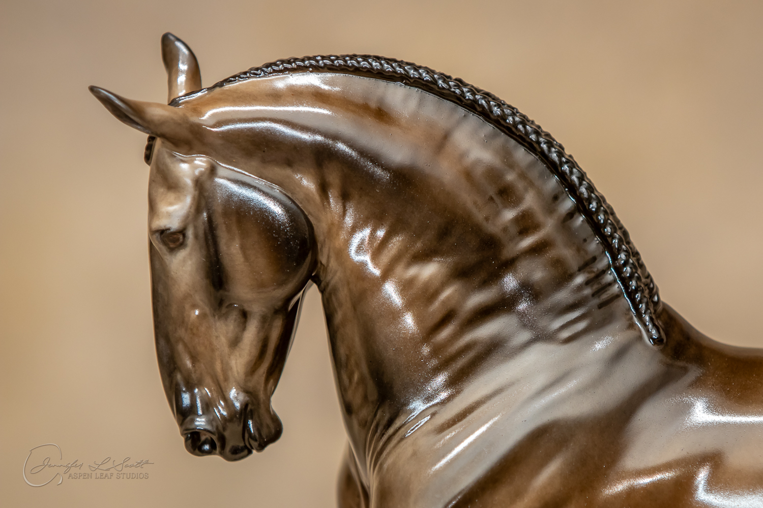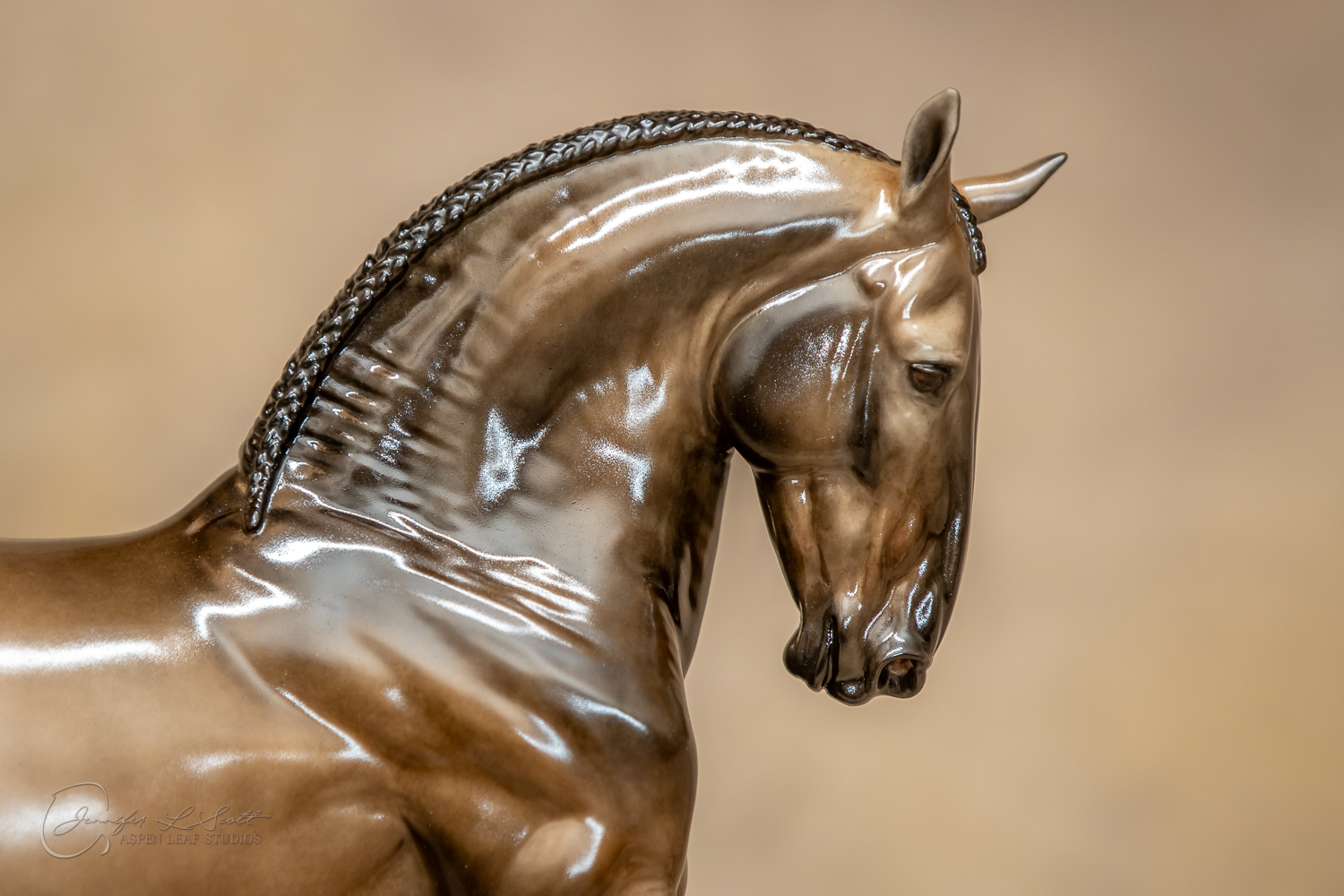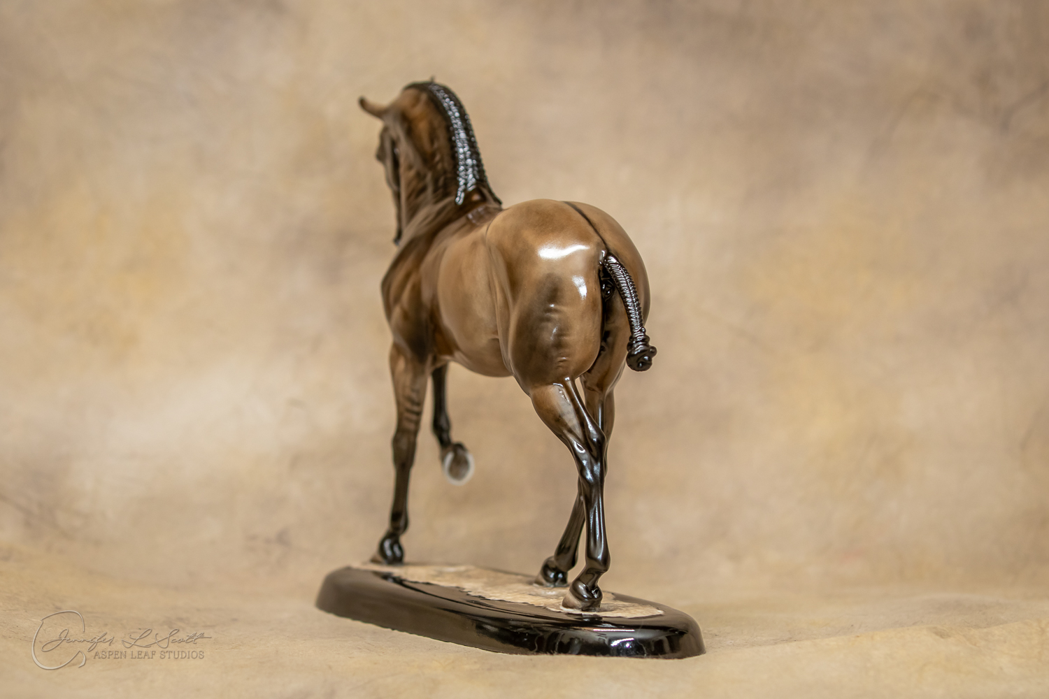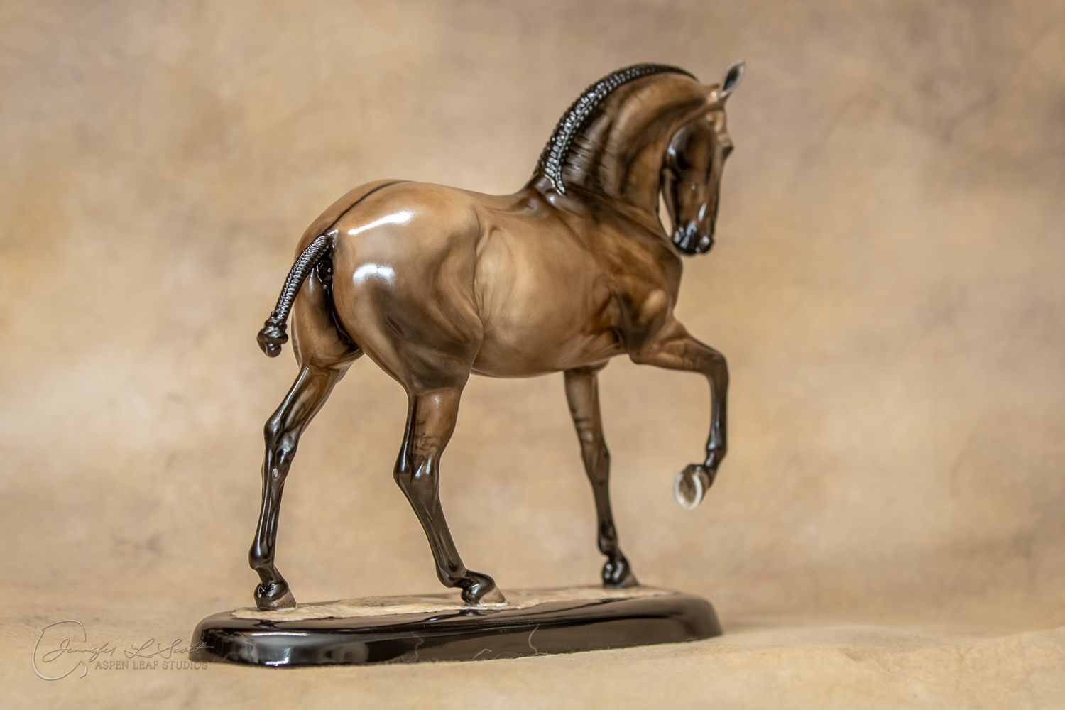 Traditional Scale "Leonardo" bone china sculpted by Emilia Kurilla and produced by Animal Artistry on behalf of Thomas Bainbridge. This is the Spanish knot tail version and officially number GA24 of the run. Satin finish, overglazed grulla in 2020. His base is glossy black with satin sand.