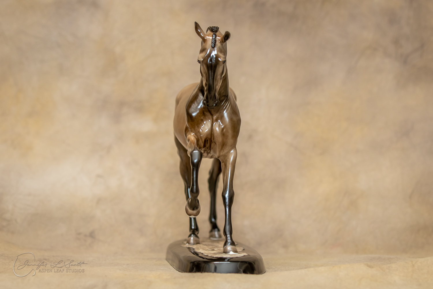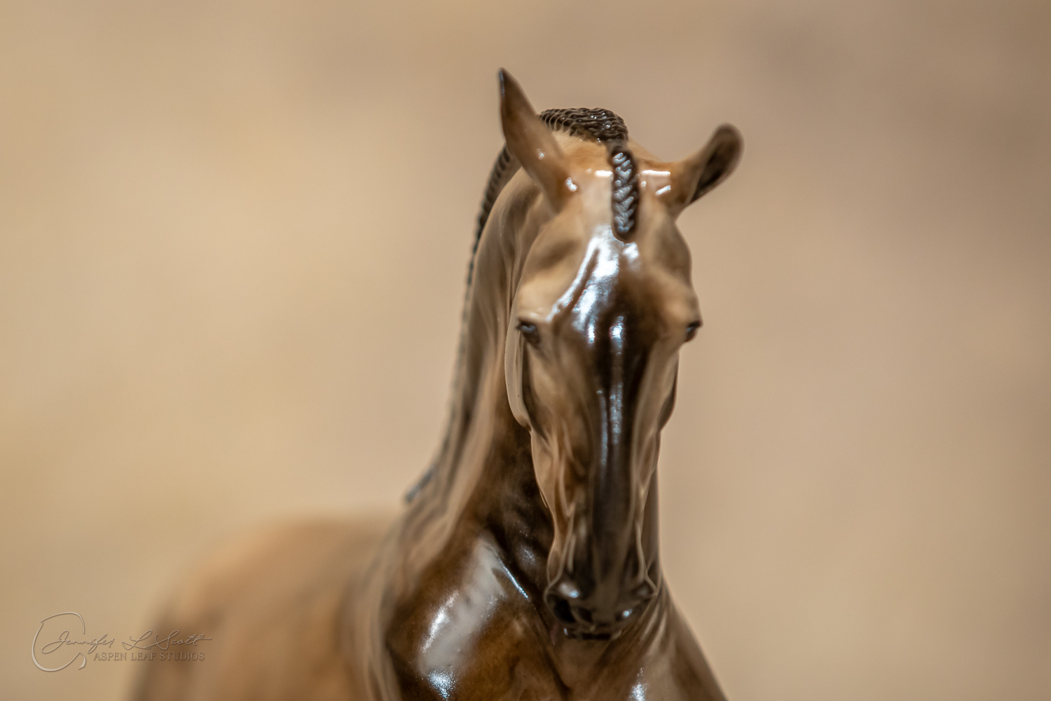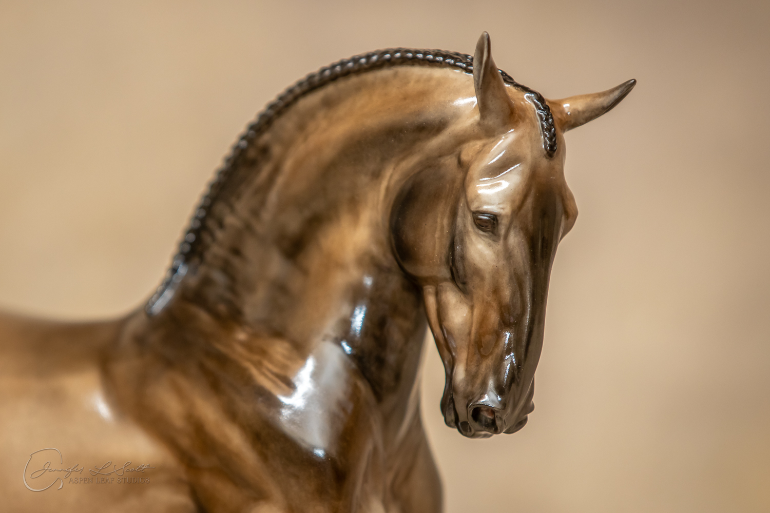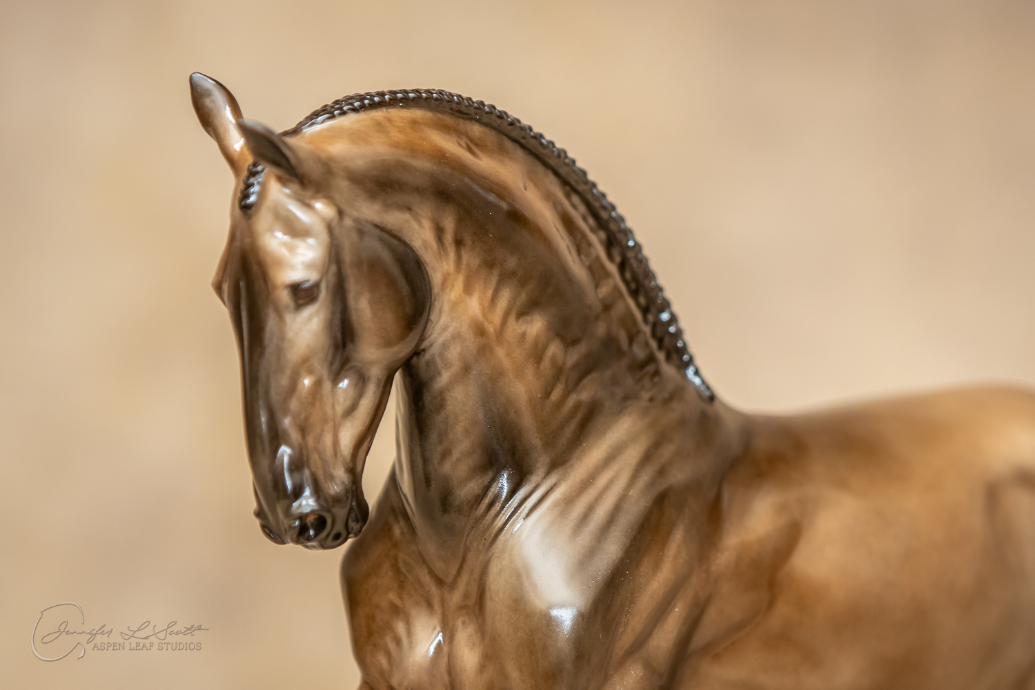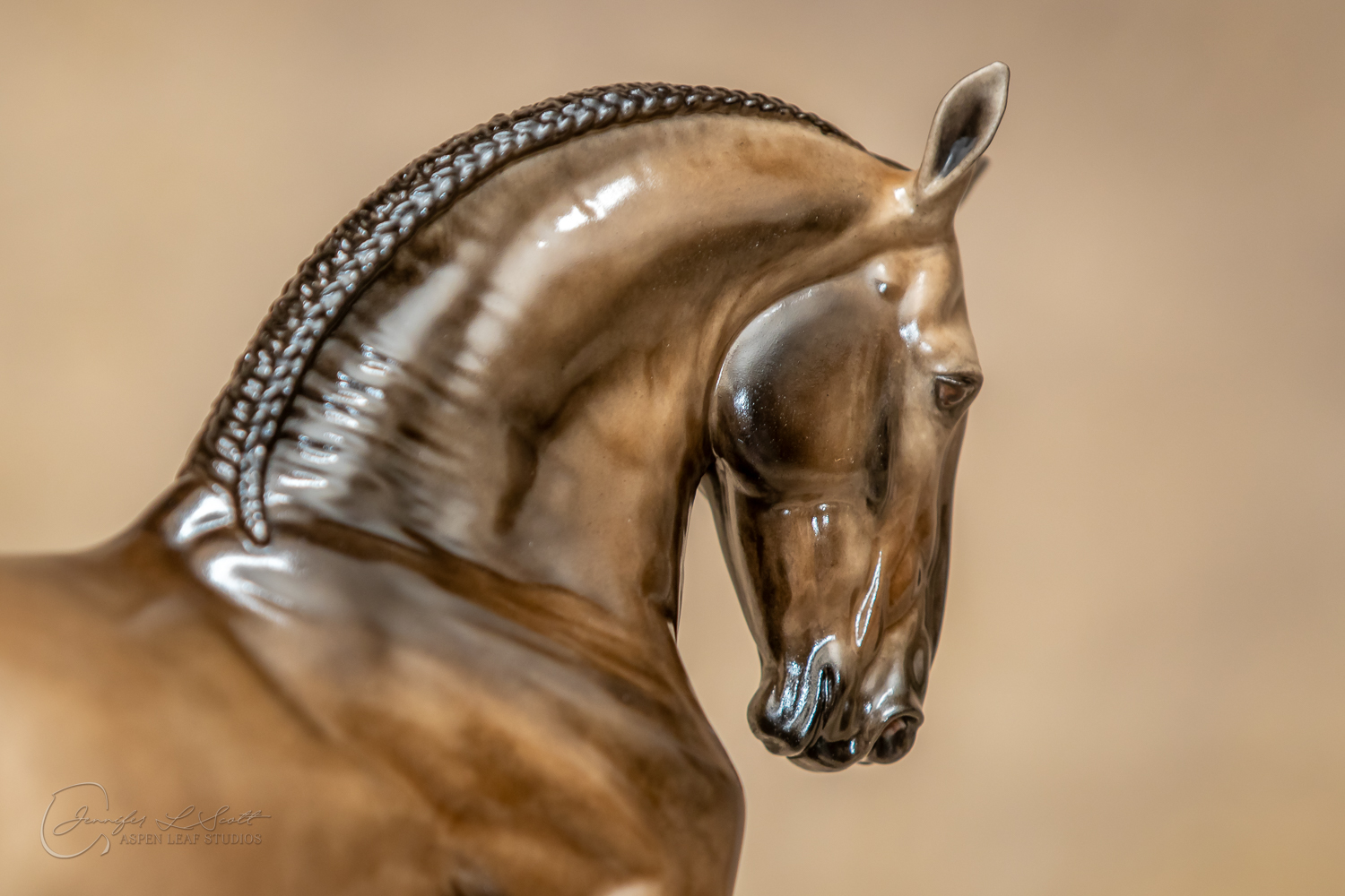 Traditional Scale "Leonardo" bone china sculpted by Emilia Kurilla and produced by Animal Artistry on behalf of Thomas Bainbridge. This is the Spanish knot tail version and officially number GA24 of the run. Satin finish, overglazed grulla in 2020. His base is glossy black with satin sand.