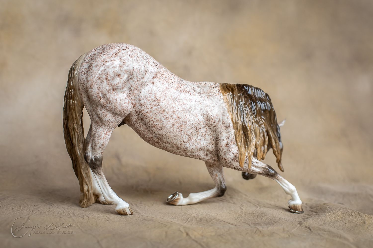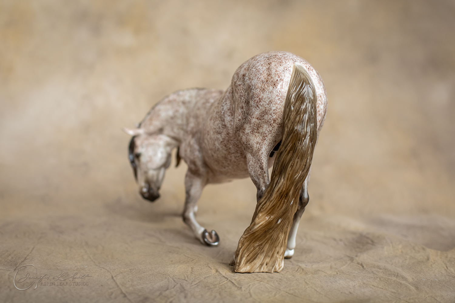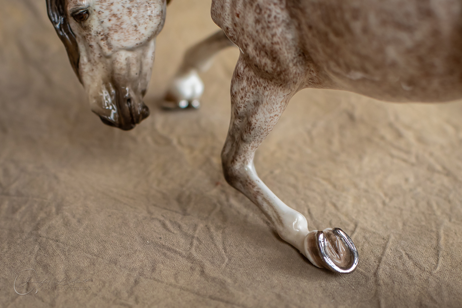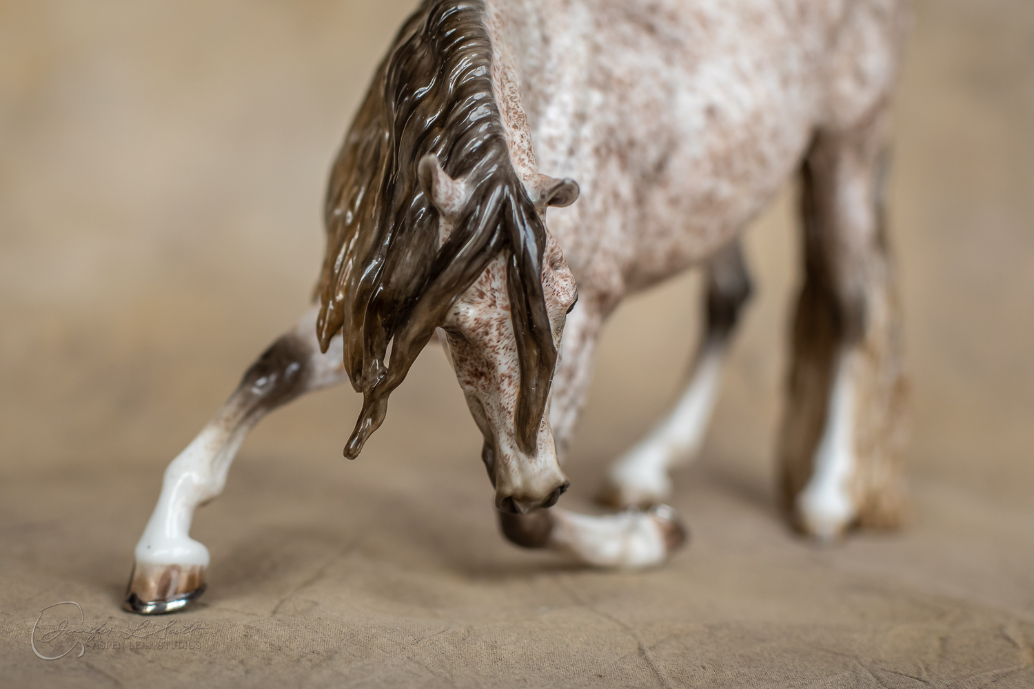 Traditional Scale "Vincenzo" bone china sculpted by Brigitte Eberl and produced by Horsing around. Glossy finish, overglazed extensive fleabitten gray in 2024.