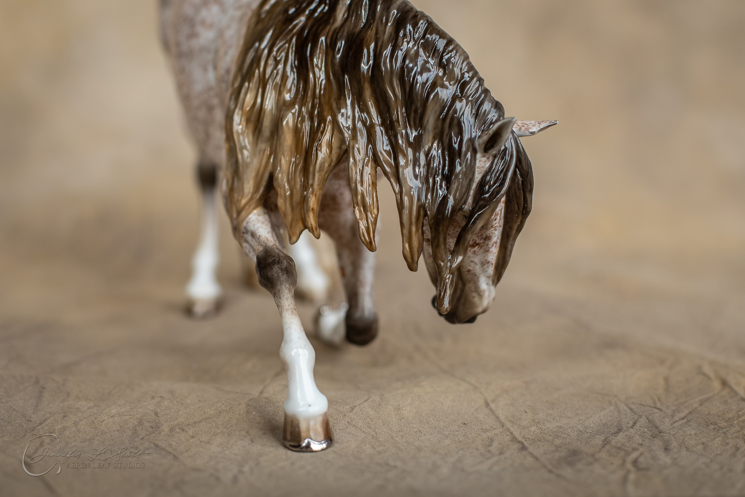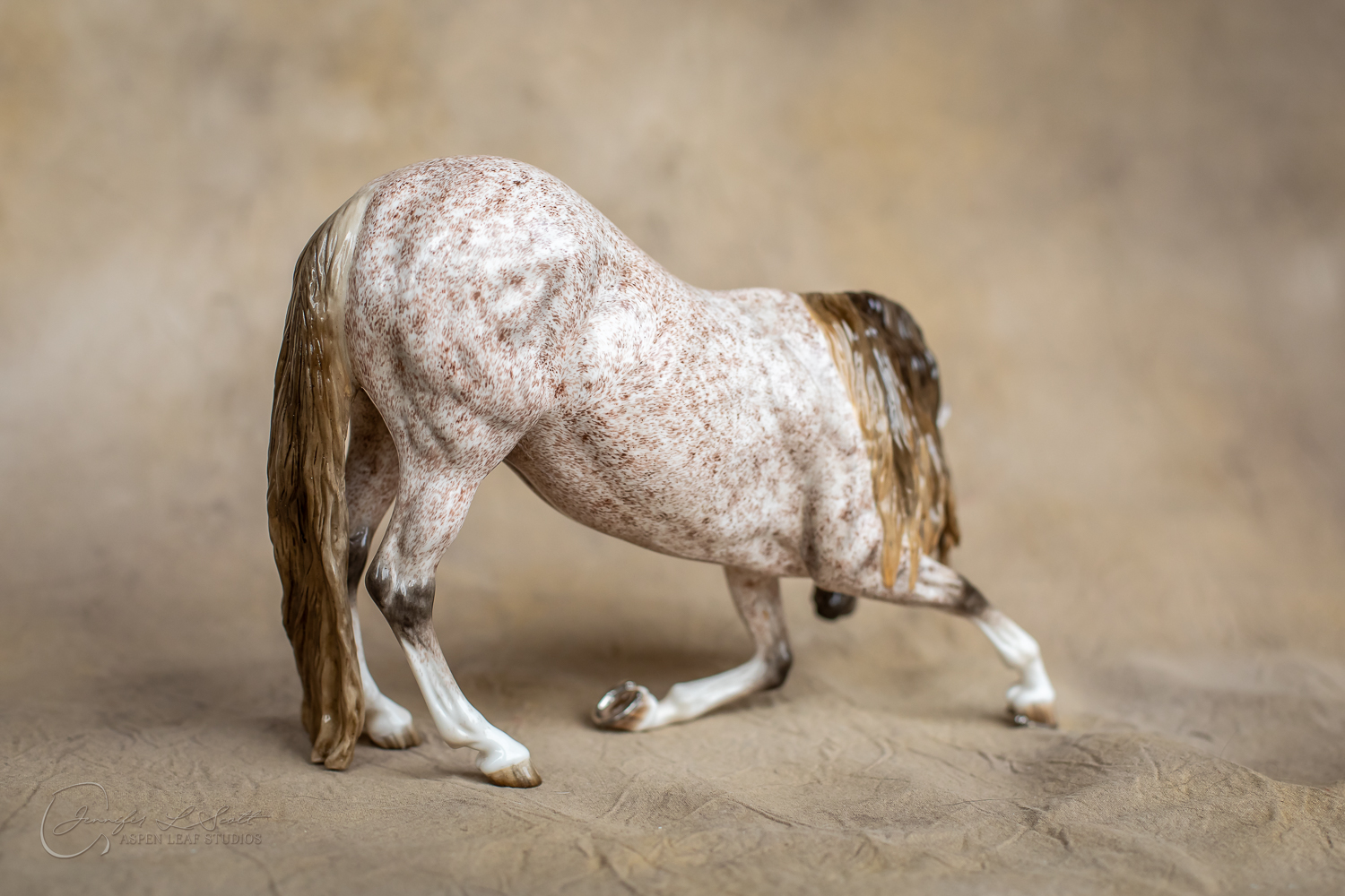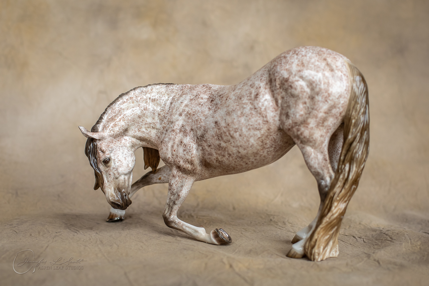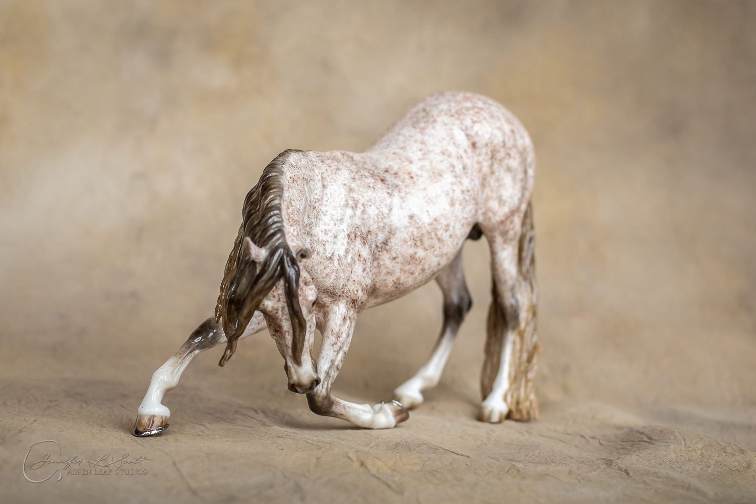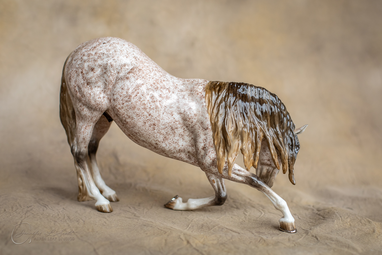 Traditional Scale "Vincenzo" bone china sculpted by Brigitte Eberl and produced by Horsing around. Glossy finish, overglazed extensive fleabitten gray in 2024.
