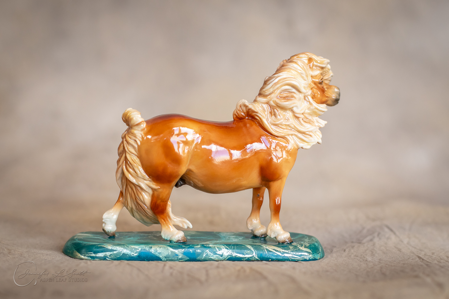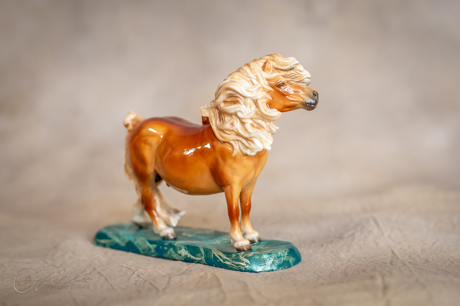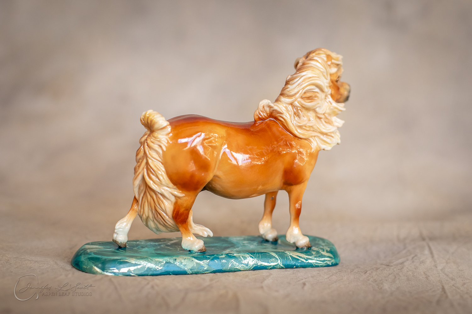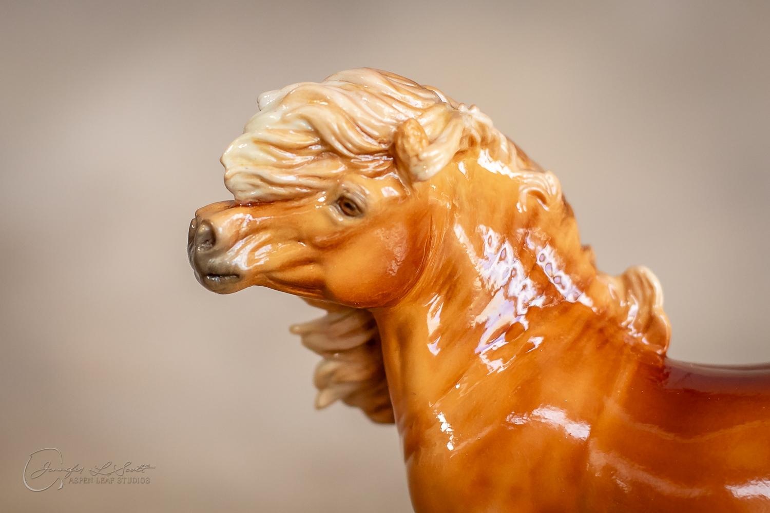 Porcelain Tadpole custom glazed in glossy finish to a light flaxen chestnut in overlgazes with a teal and white gold-leafed base. Finished in 2024.