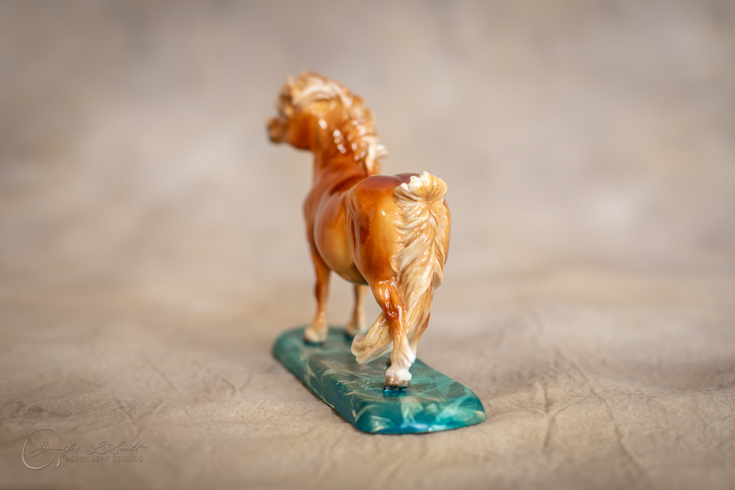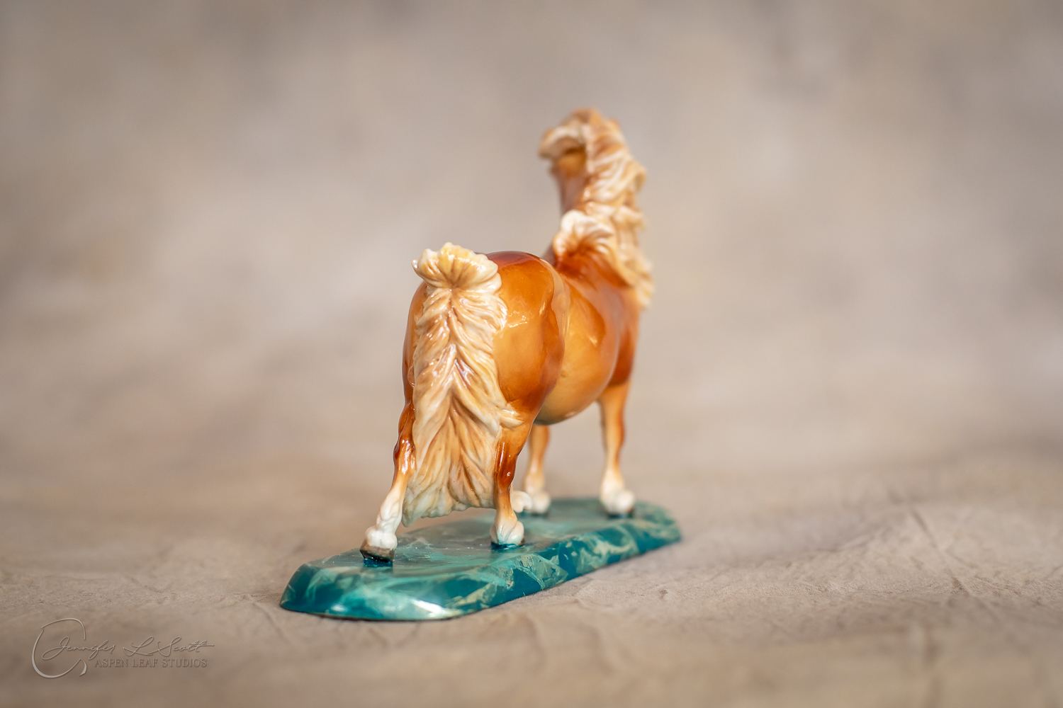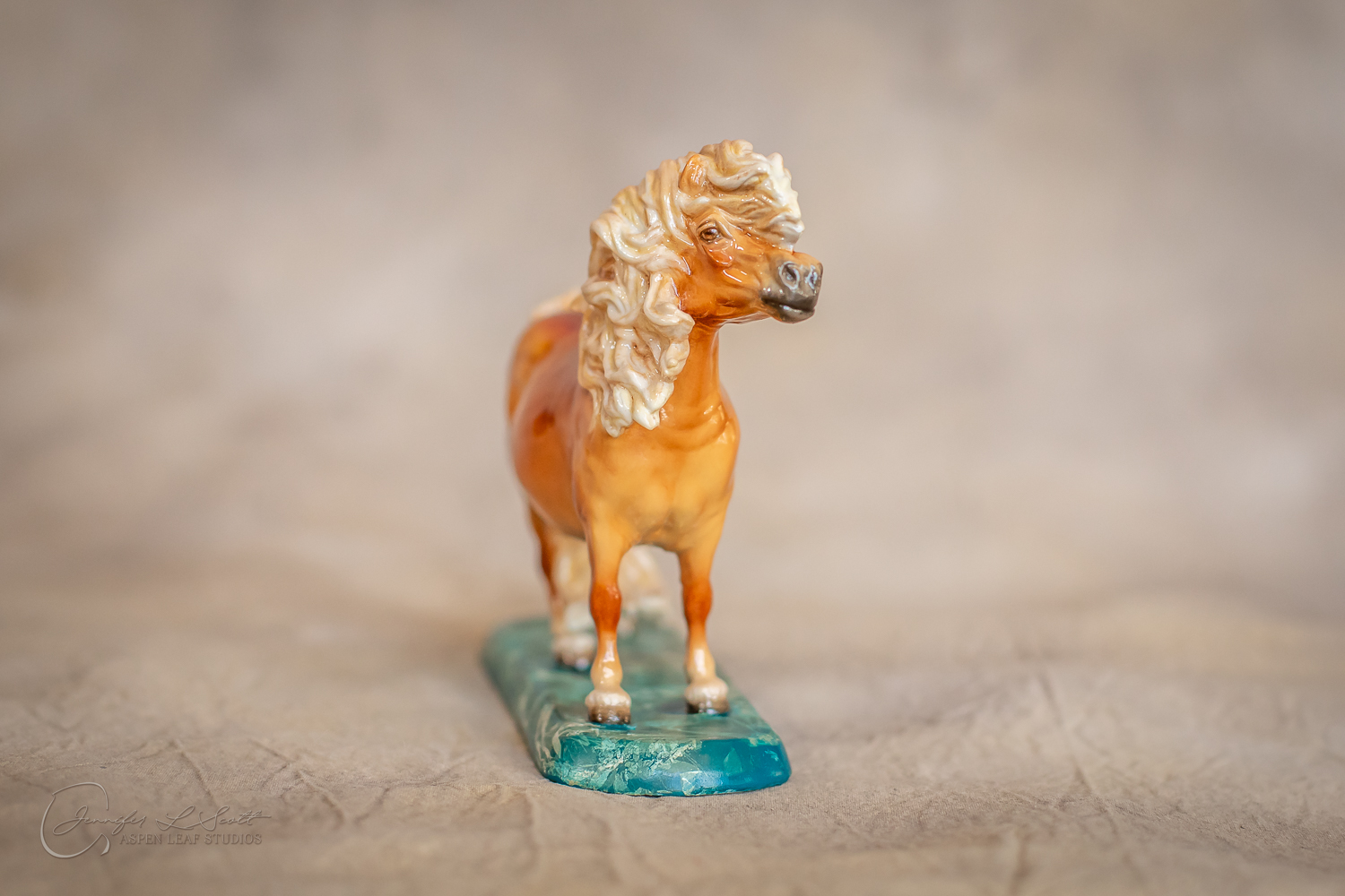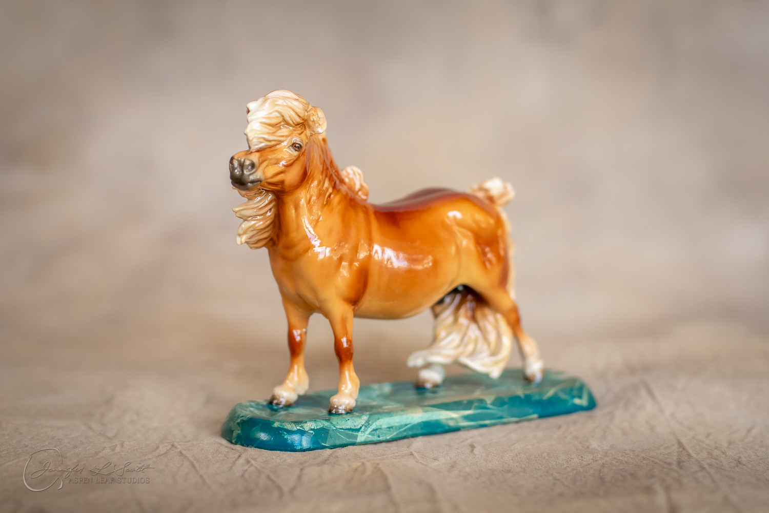 Porcelain Tadpole custom glazed in glossy finish to a light flaxen chestnut in overlgazes with a teal and white gold-leafed base. Finished in 2024.