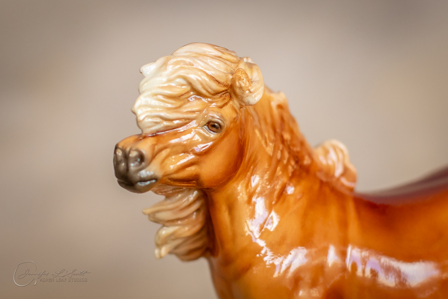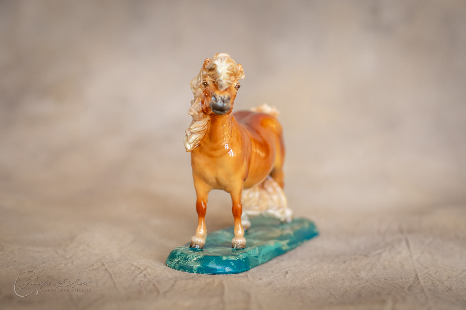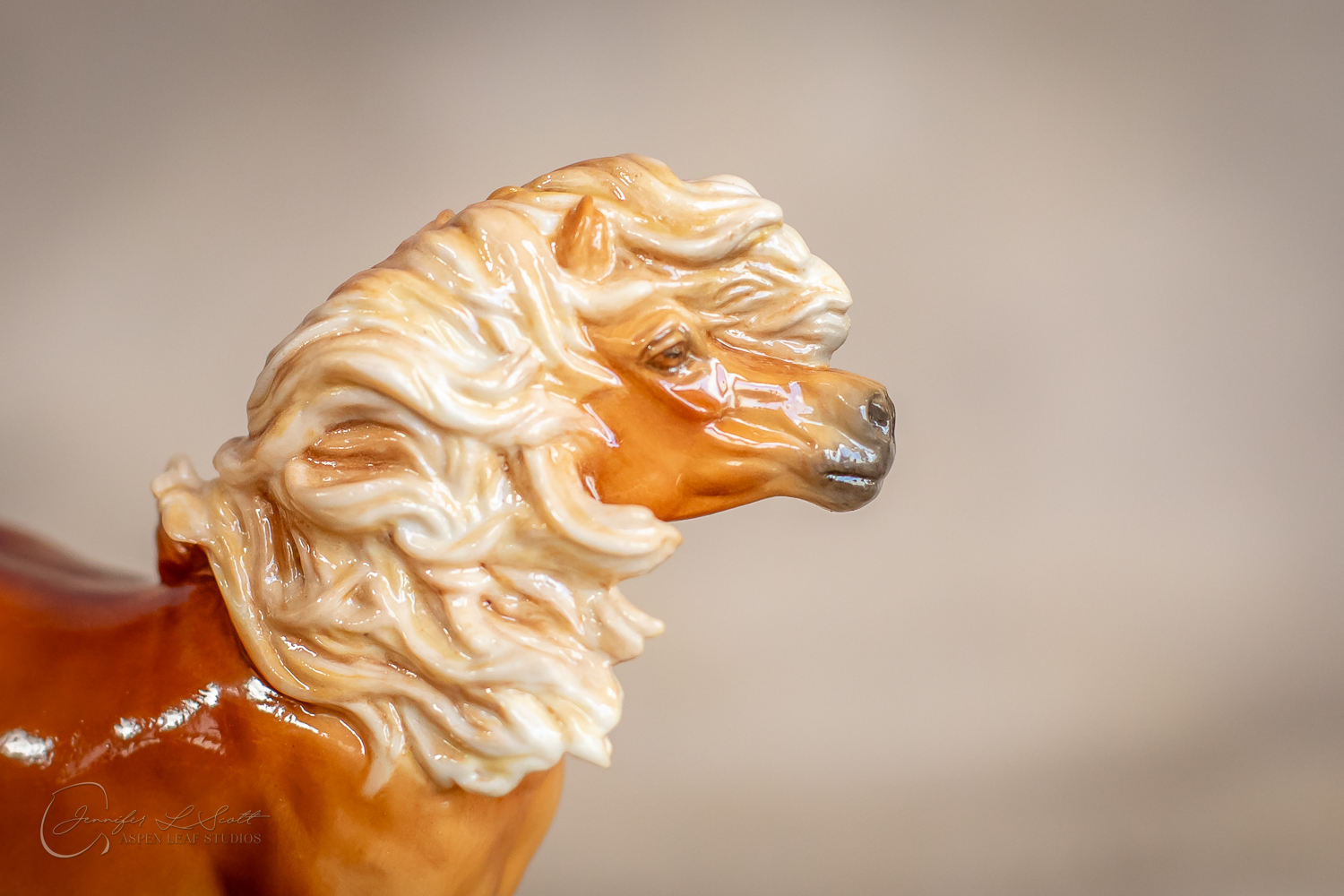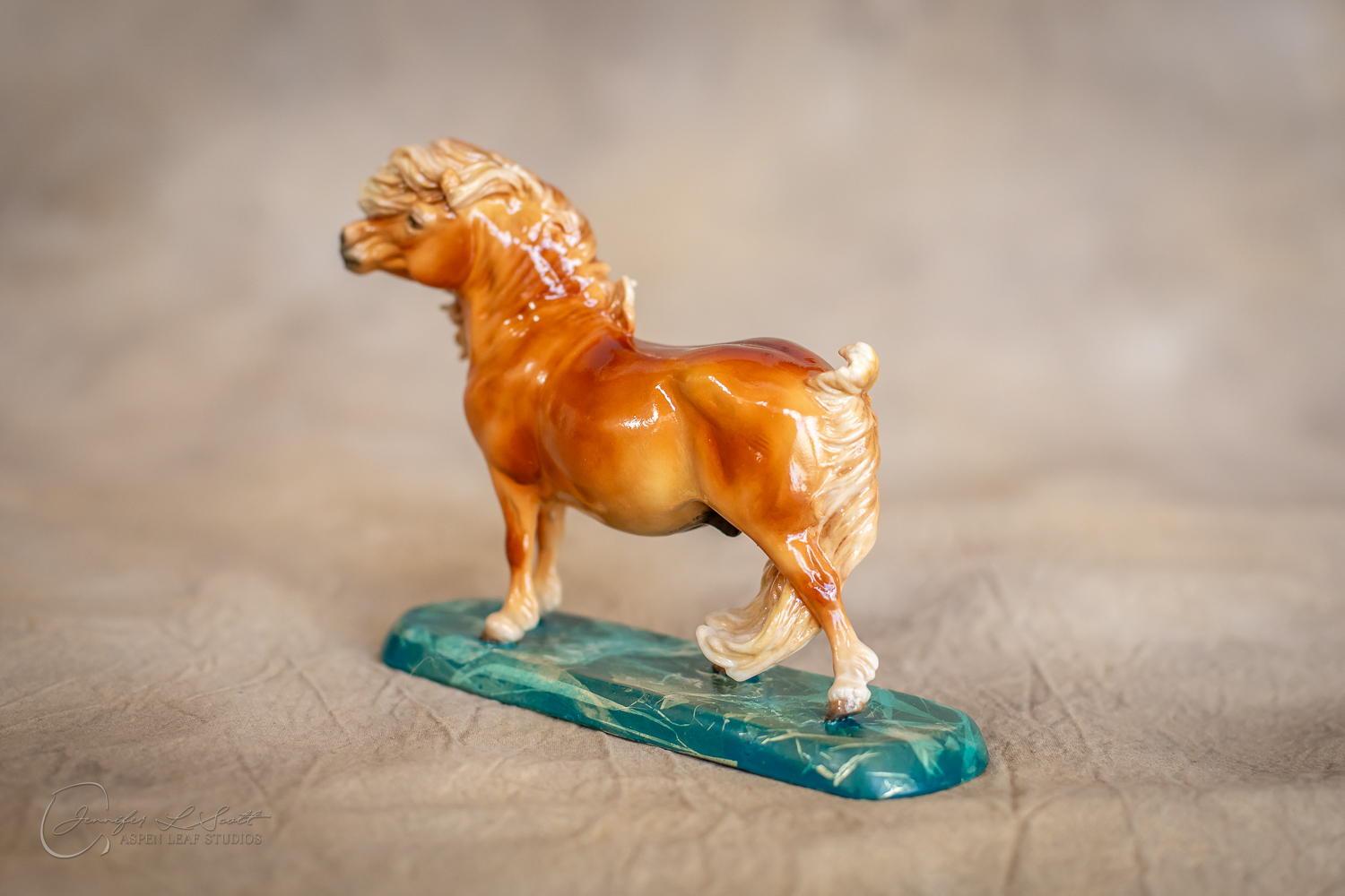 Porcelain Tadpole custom glazed in glossy finish to a light flaxen chestnut in overlgazes with a teal and white gold-leafed base. Finished in 2024.