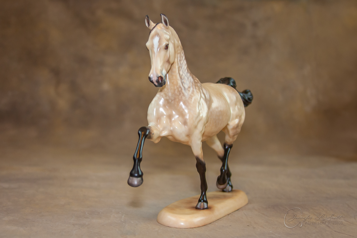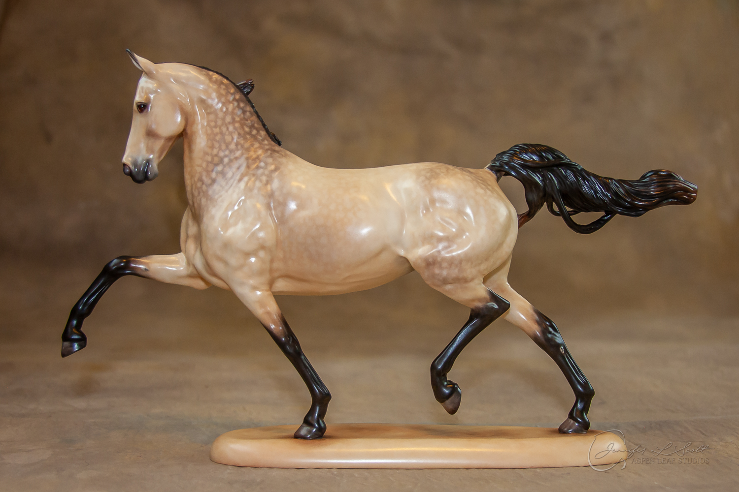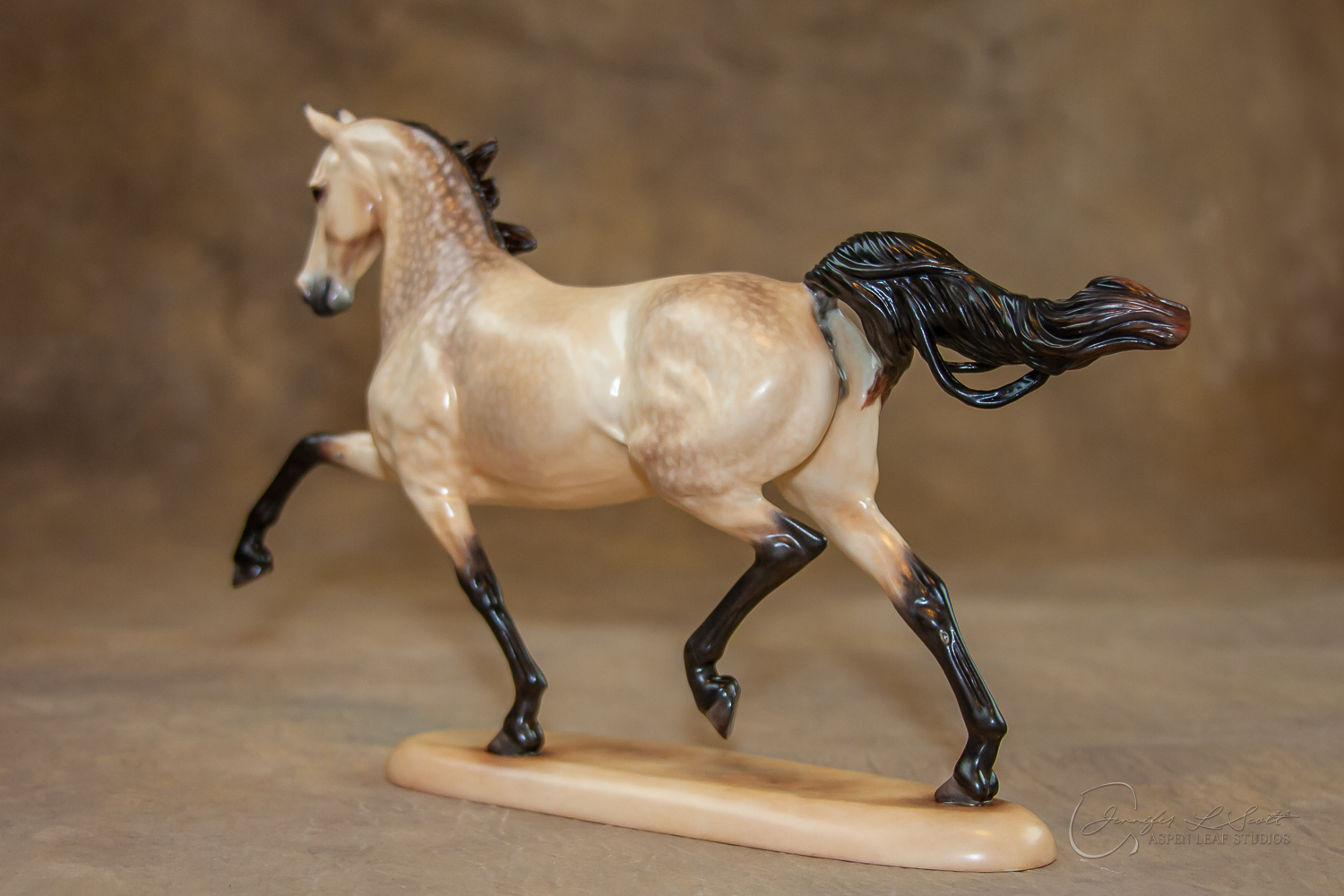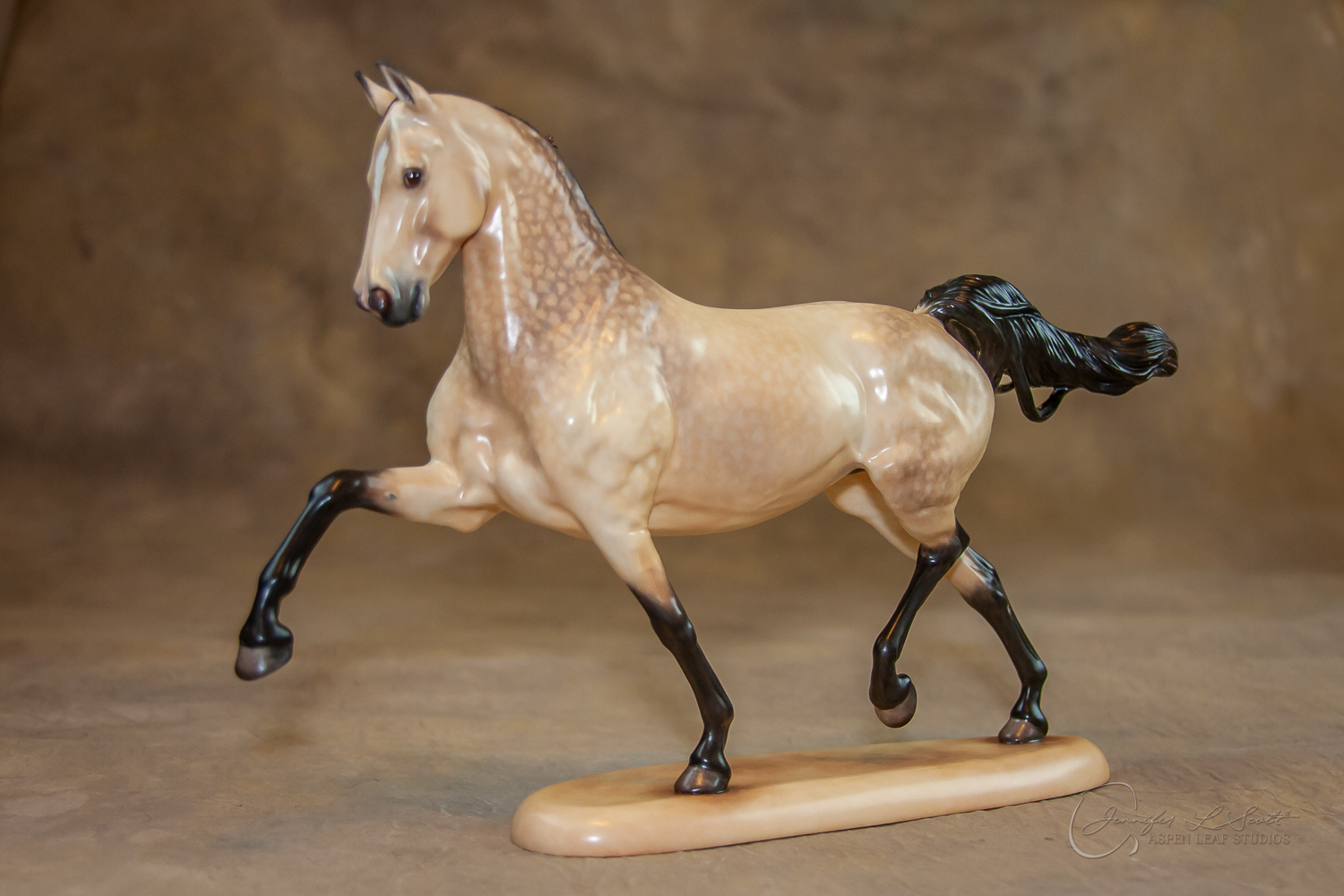 Satin finish, overglazed dappled sooty buttermilk buckskin.