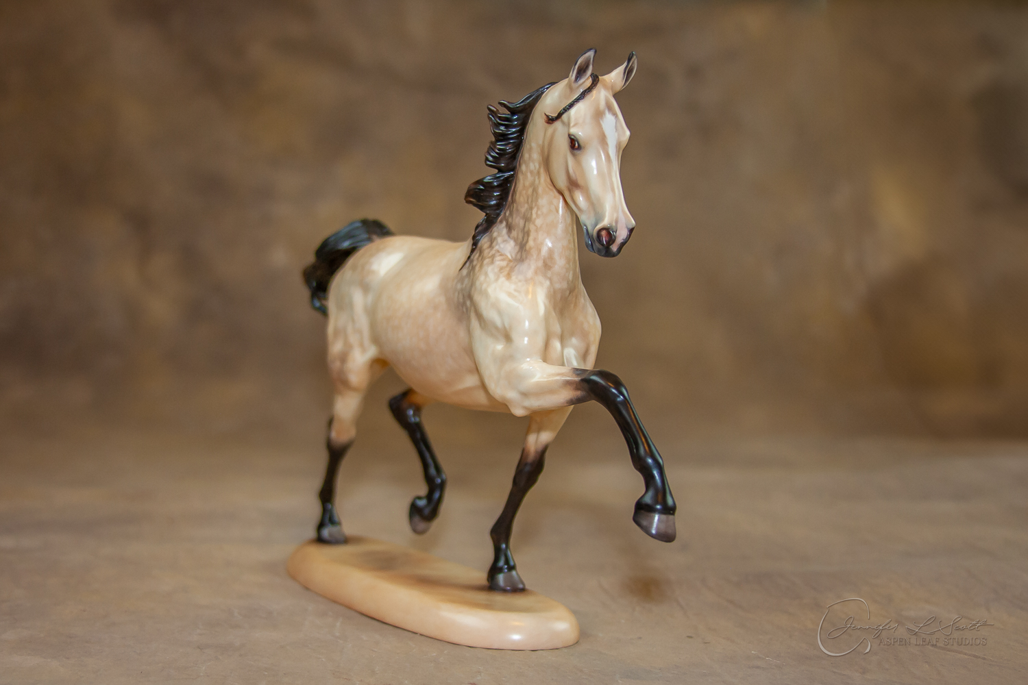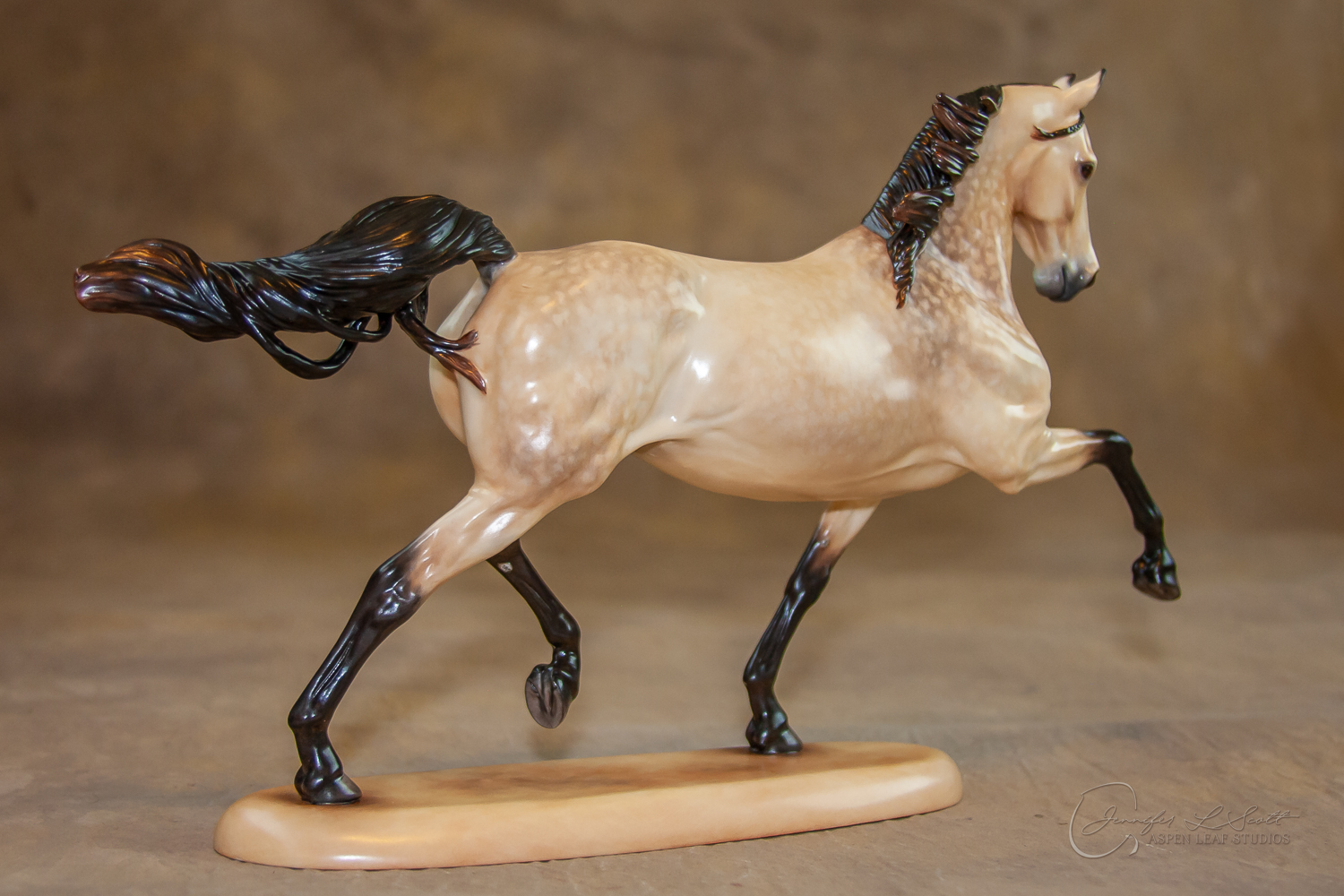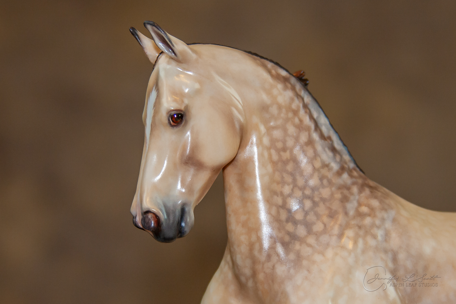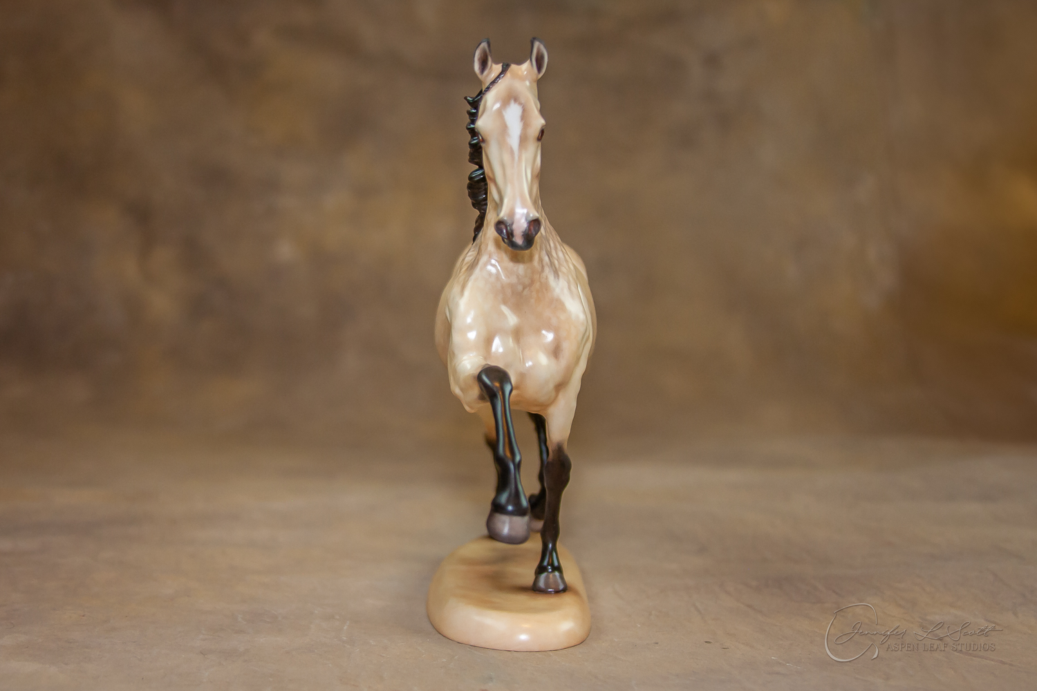 Satin finish, overglazed dappled sooty buttermilk buckskin.