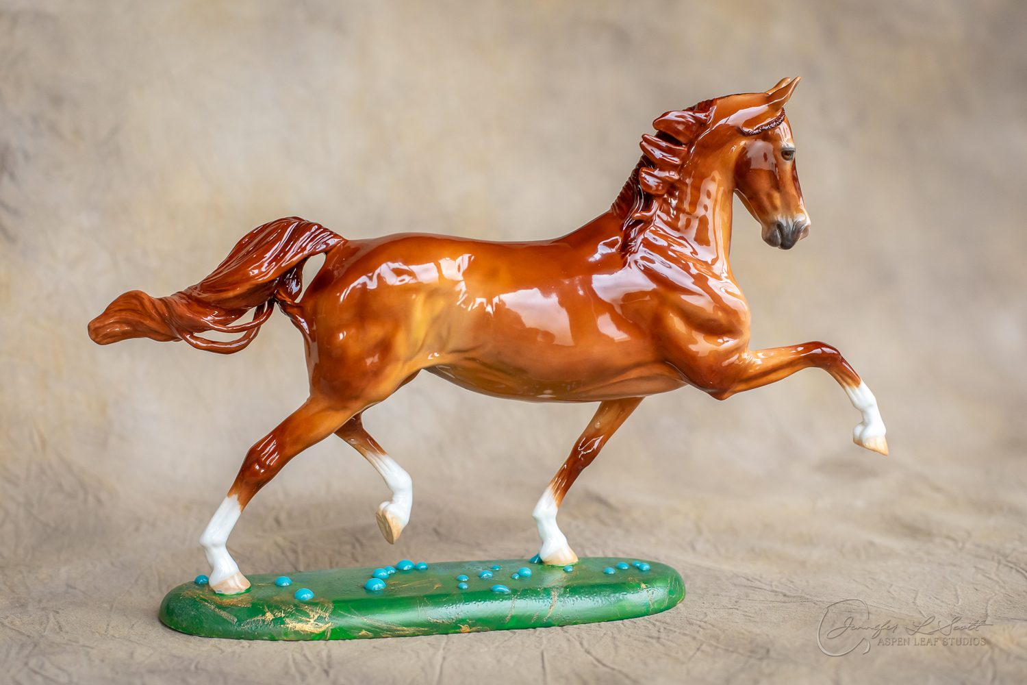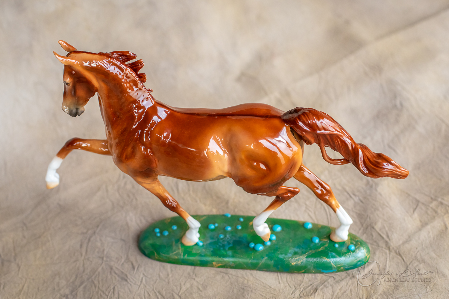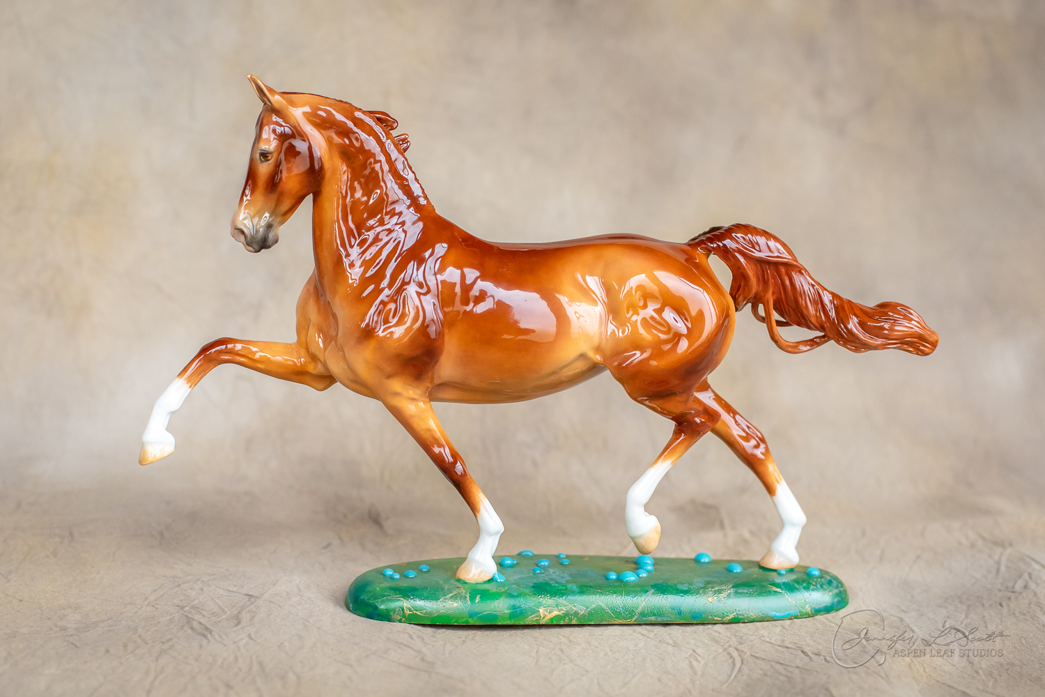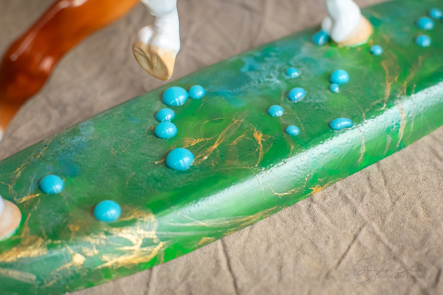 Glossy finish, overglazed bright red dun with chrome. Base has yellow gold leaf and teal bubbles for a funky and fun finish. Finished in 2024.