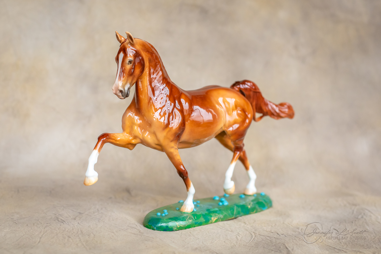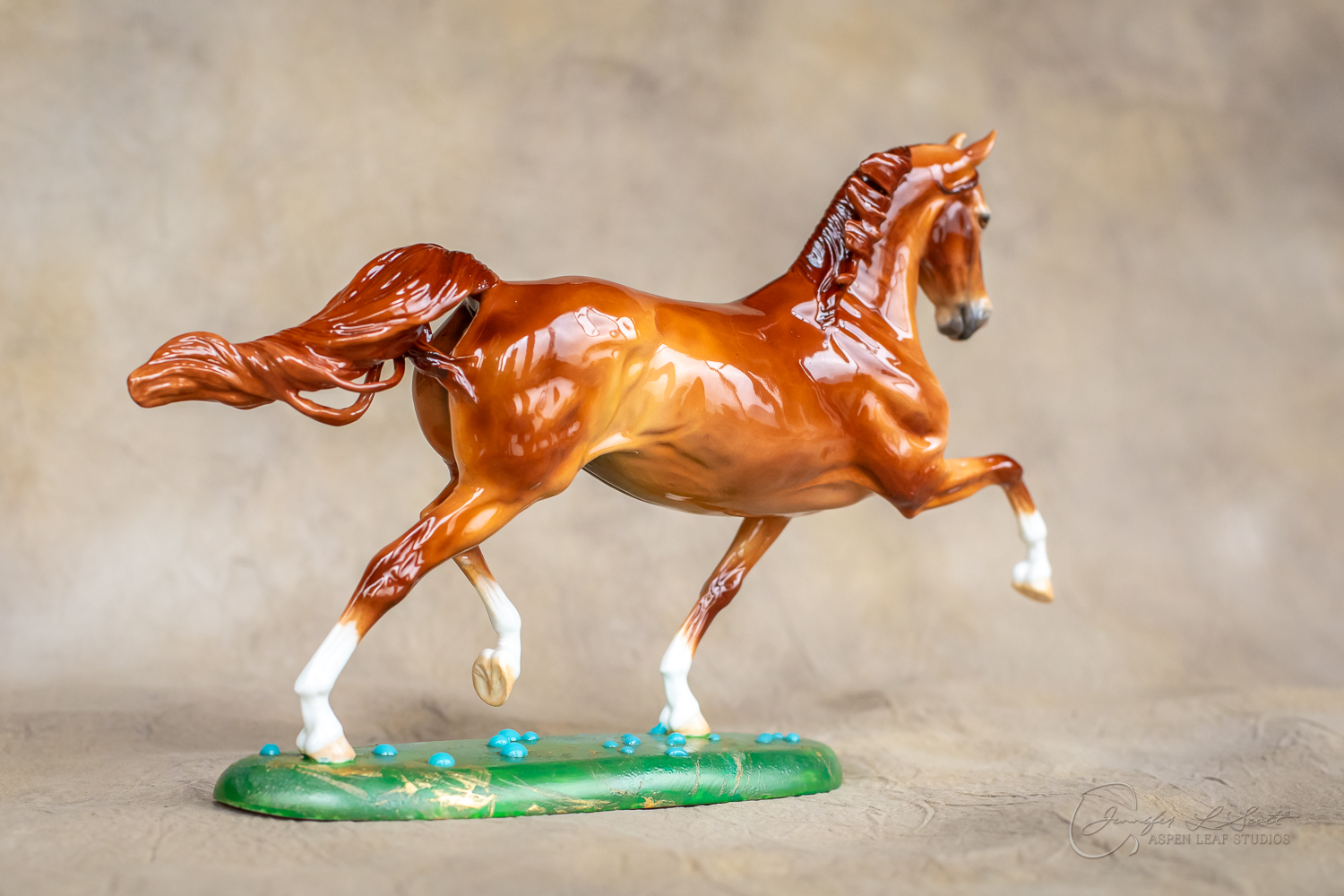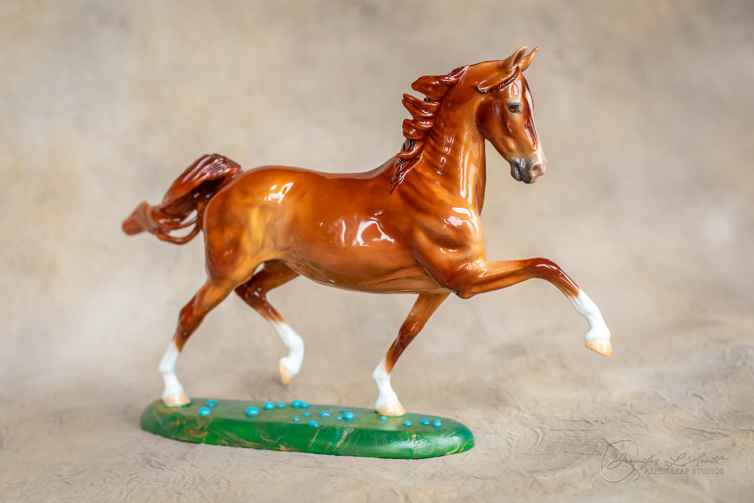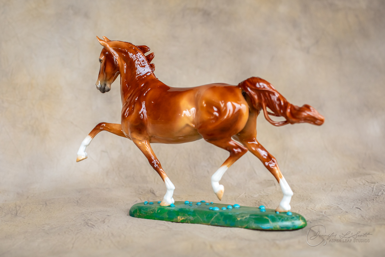 Glossy finish, overglazed bright red dun with chrome. Base has yellow gold leaf and teal bubbles for a funky and fun finish. Finished in 2024.