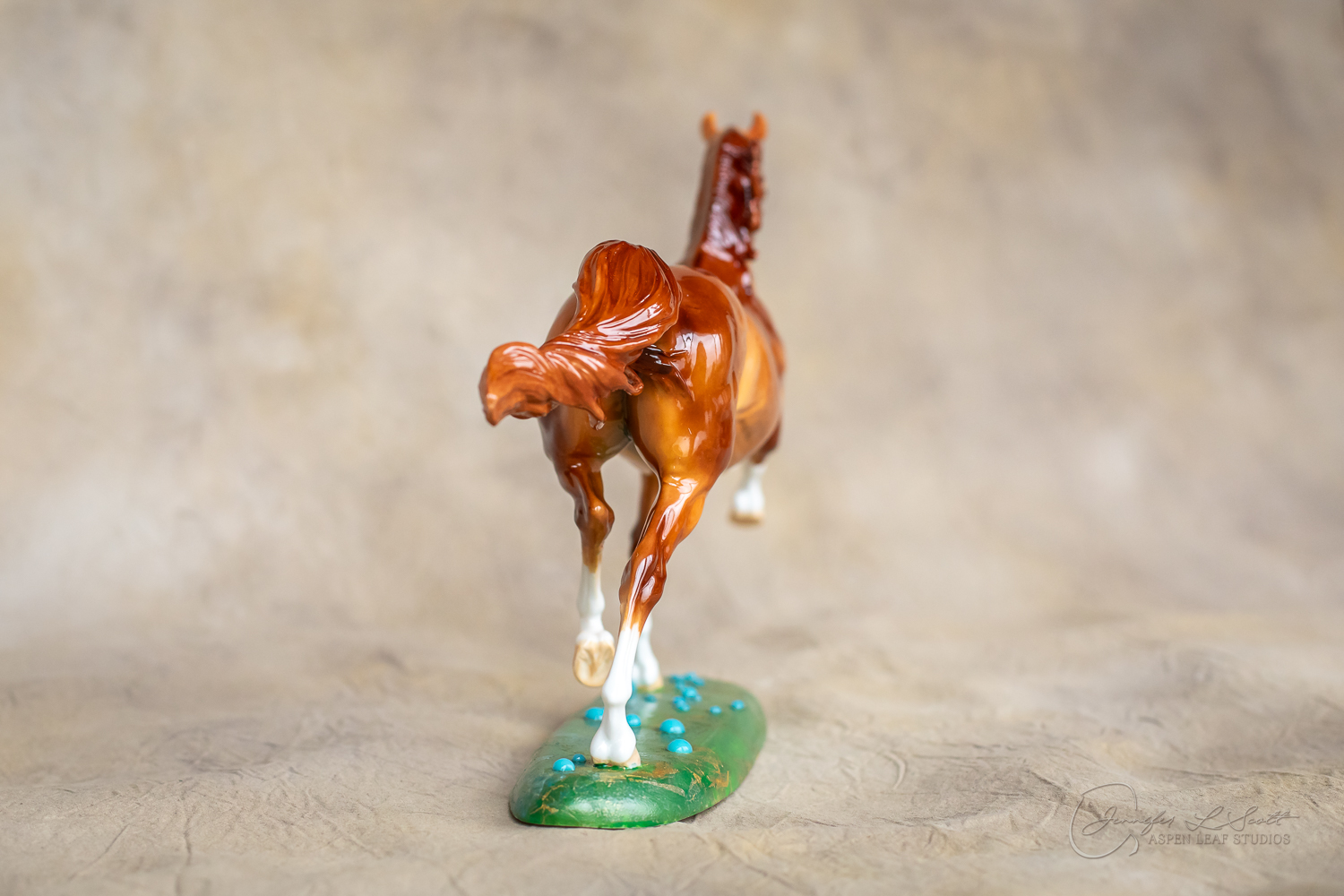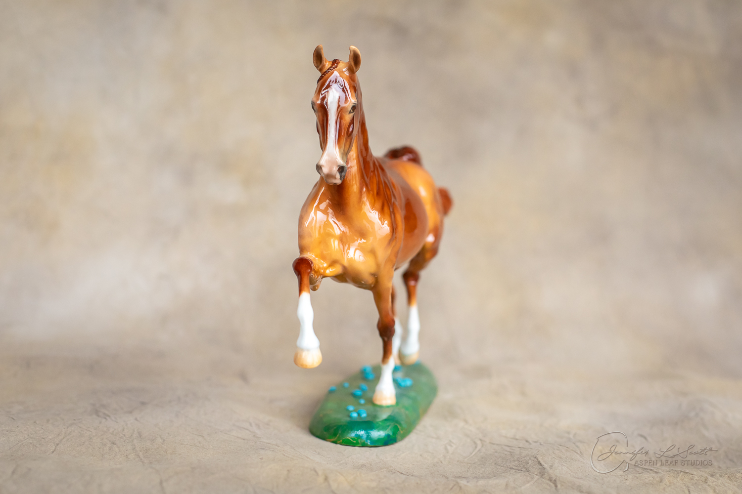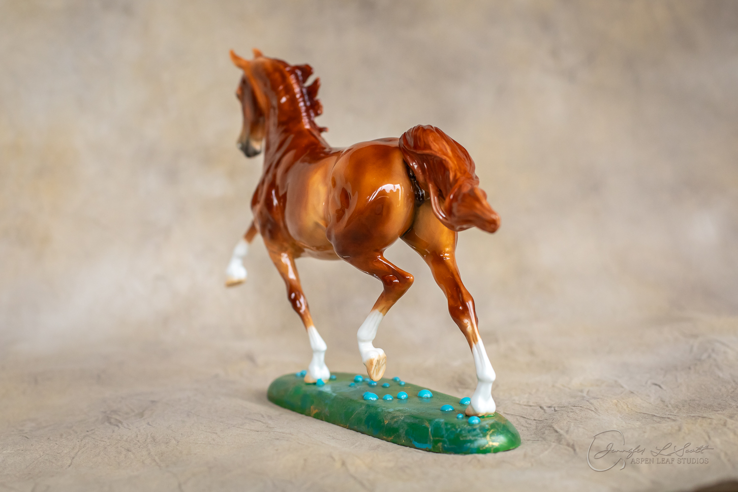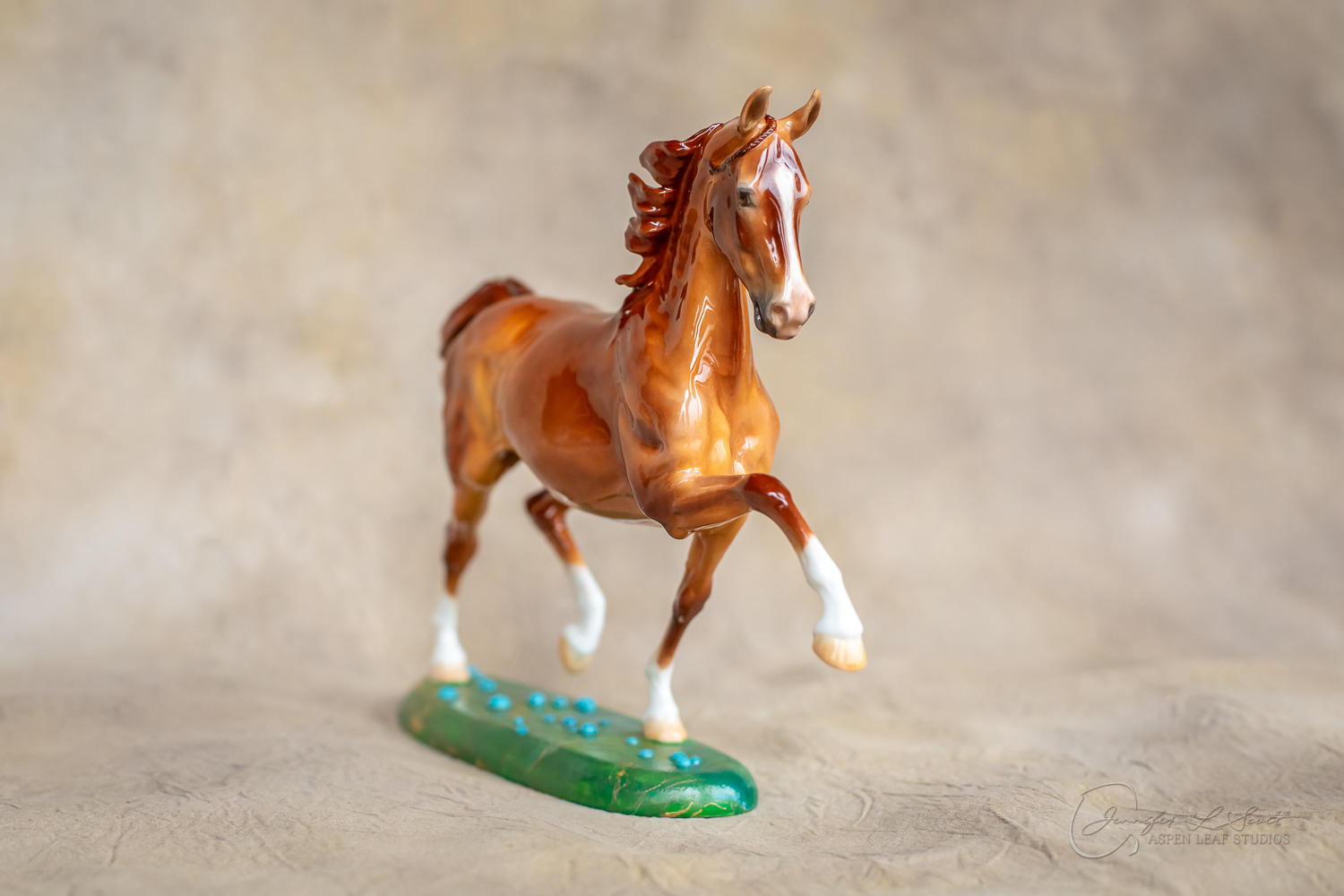 Glossy finish, overglazed bright red dun with chrome. Base has yellow gold leaf and teal bubbles for a funky and fun finish. Finished in 2024.