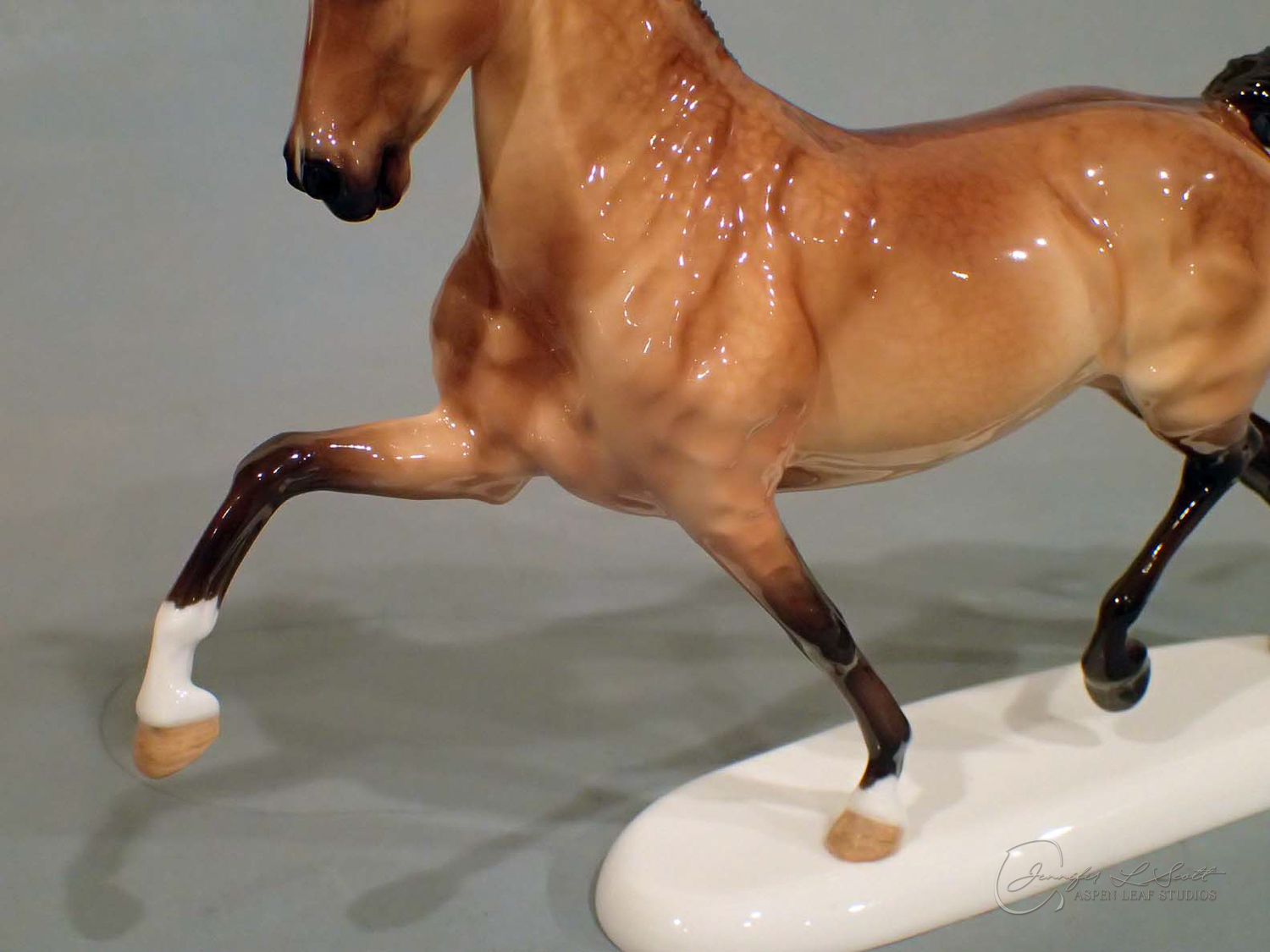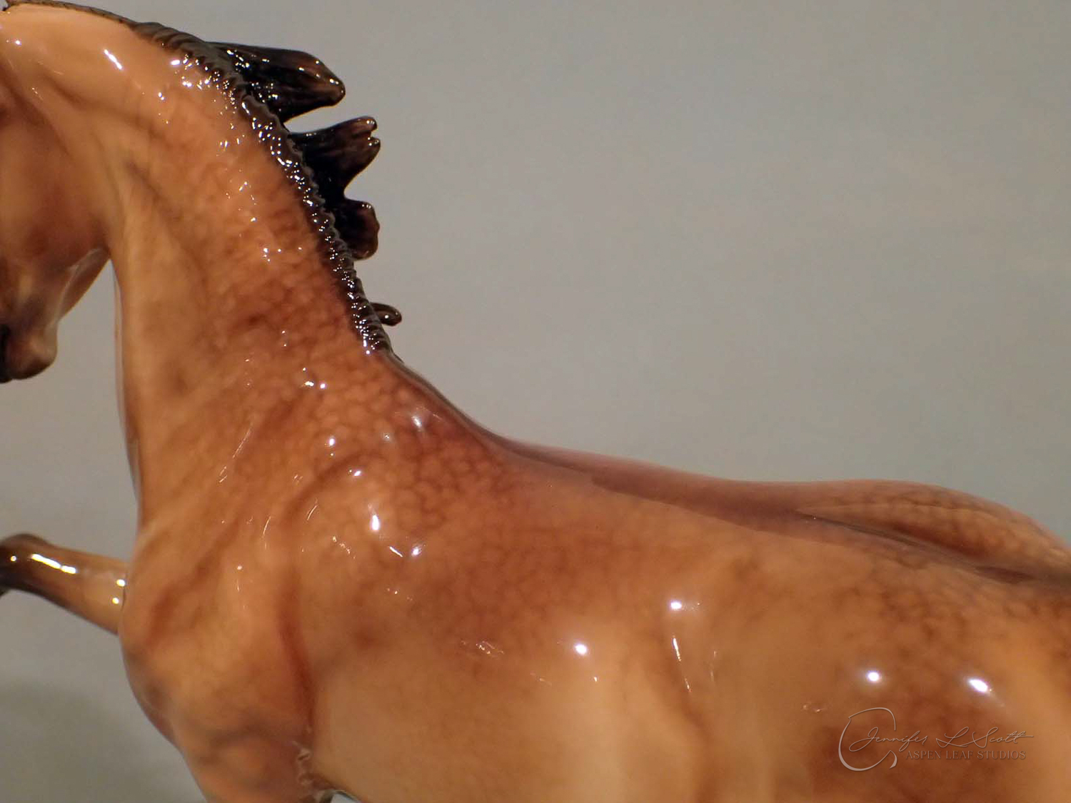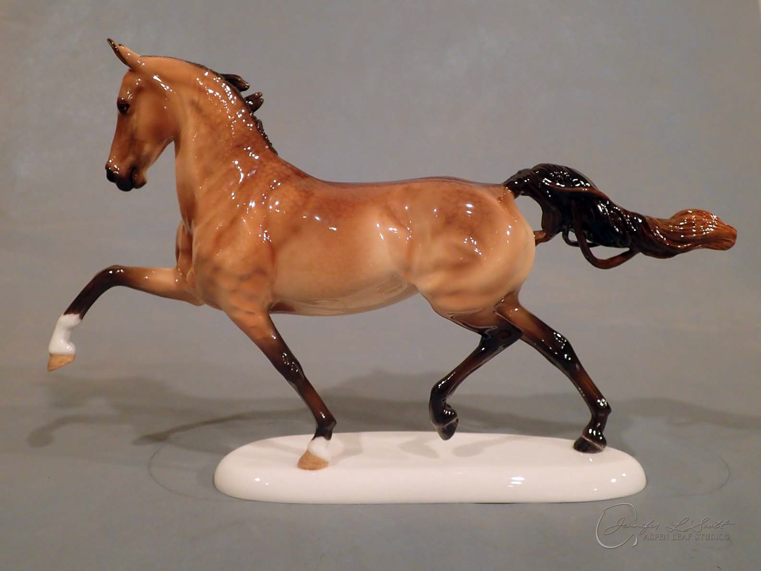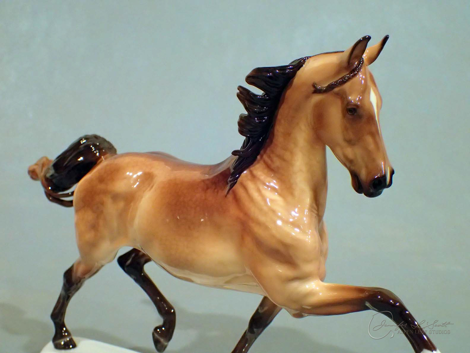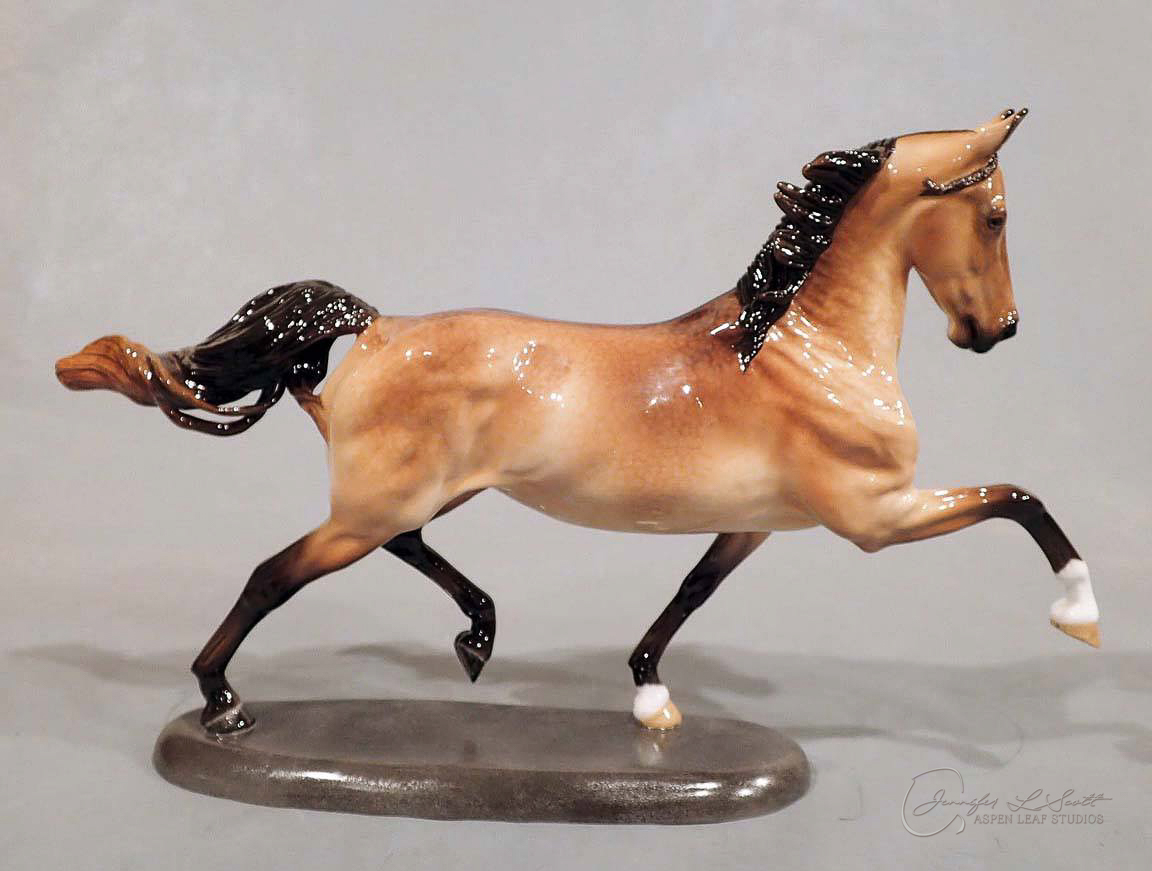 Glossy finish, overglazed by guest finisher Karen Gerhardt to dappled buckskin. Finished in 2016.