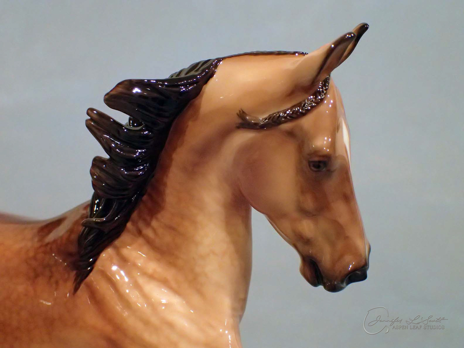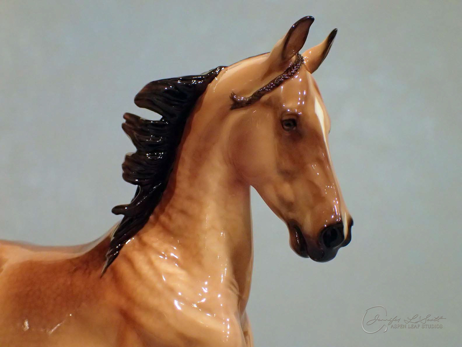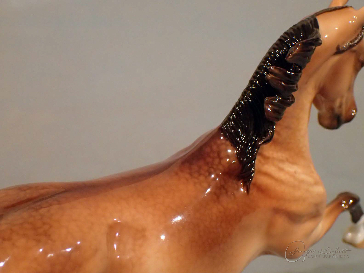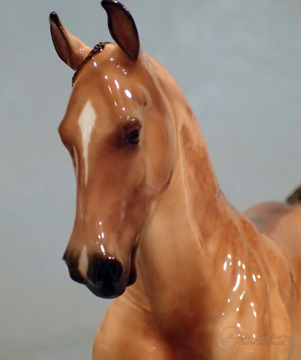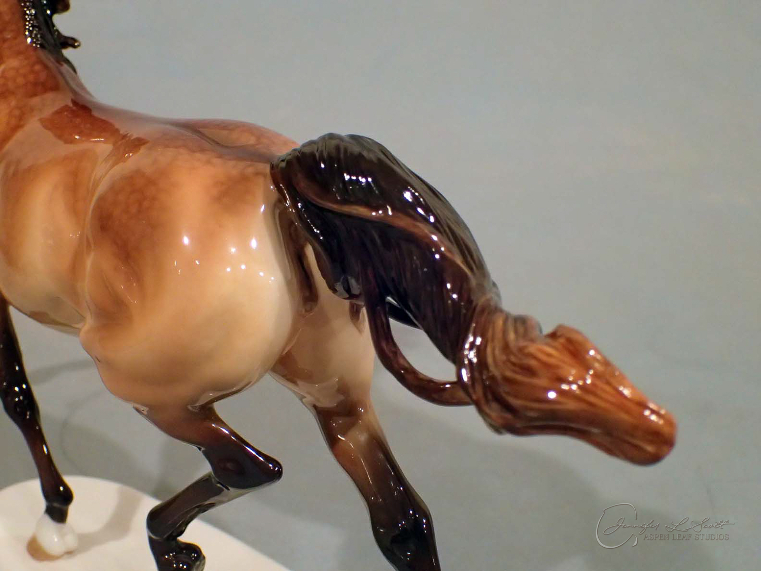 Glossy finish, overglazed by guest finisher Karen Gerhardt to dappled buckskin. Finished in 2016.