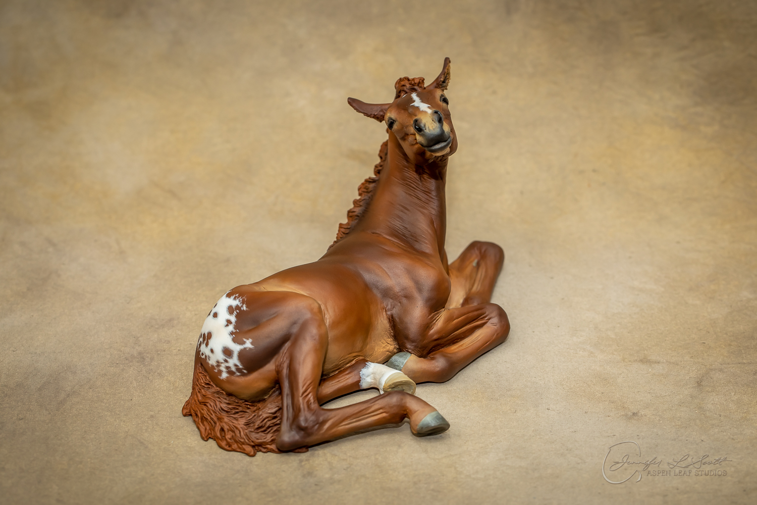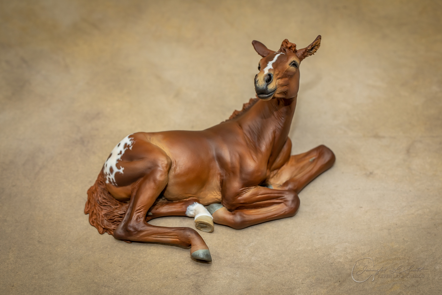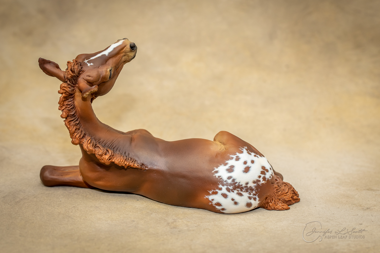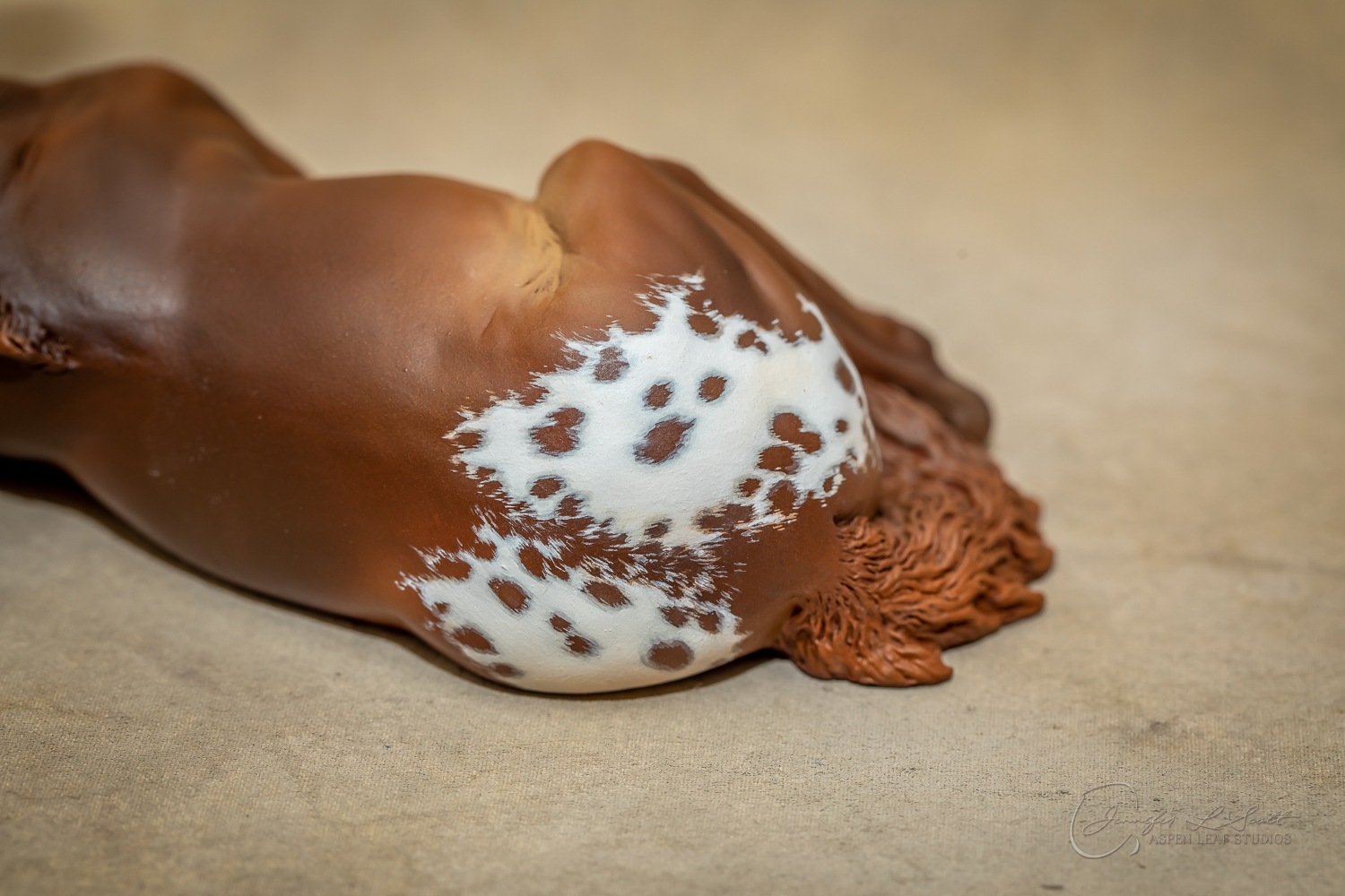 Traditional Scale "Little Man Mango" resin sculpted by Morgen Kilbourn painted to chestnut split-blanket appaloosa in 2022.