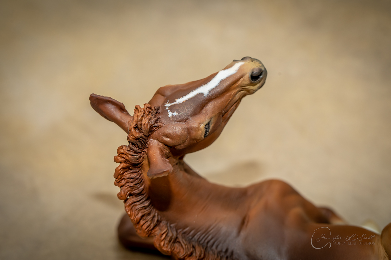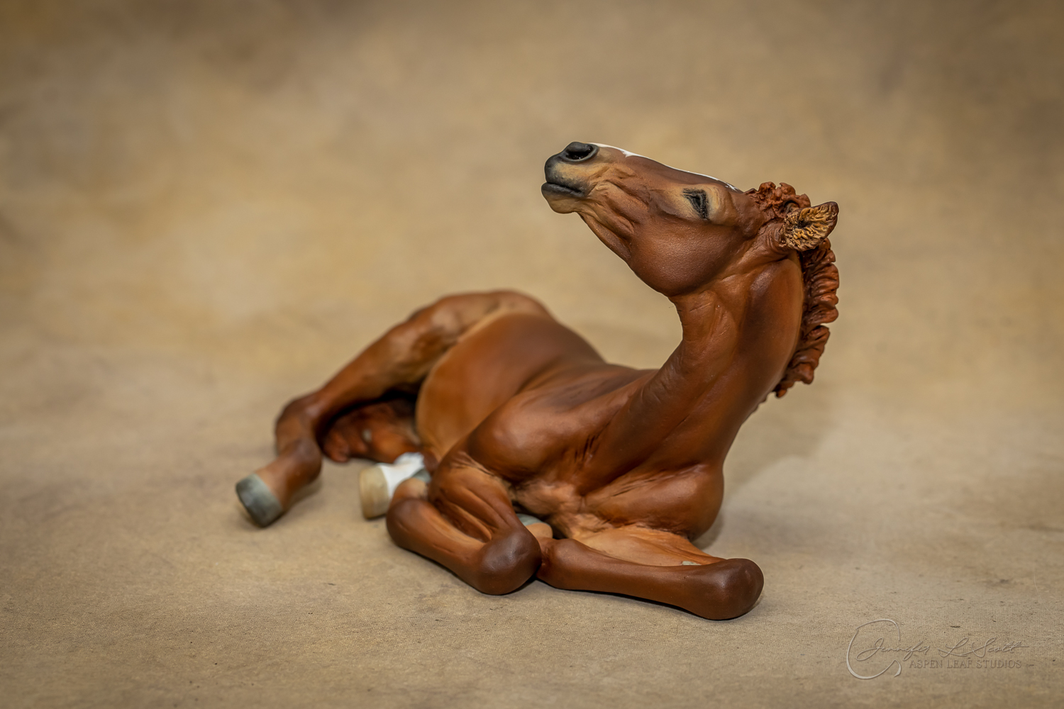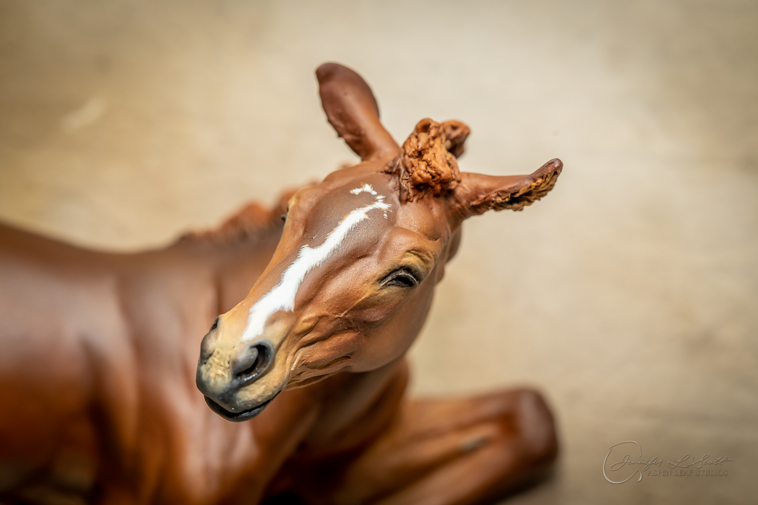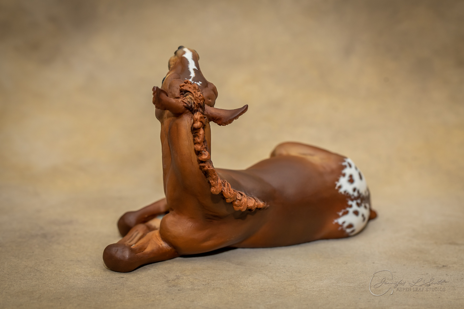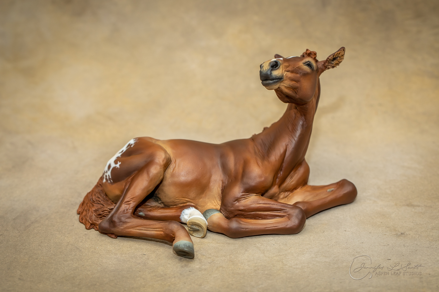 Traditional Scale "Little Man Mango" resin sculpted by Morgen Kilbourn painted to chestnut split-blanket appaloosa in 2022.