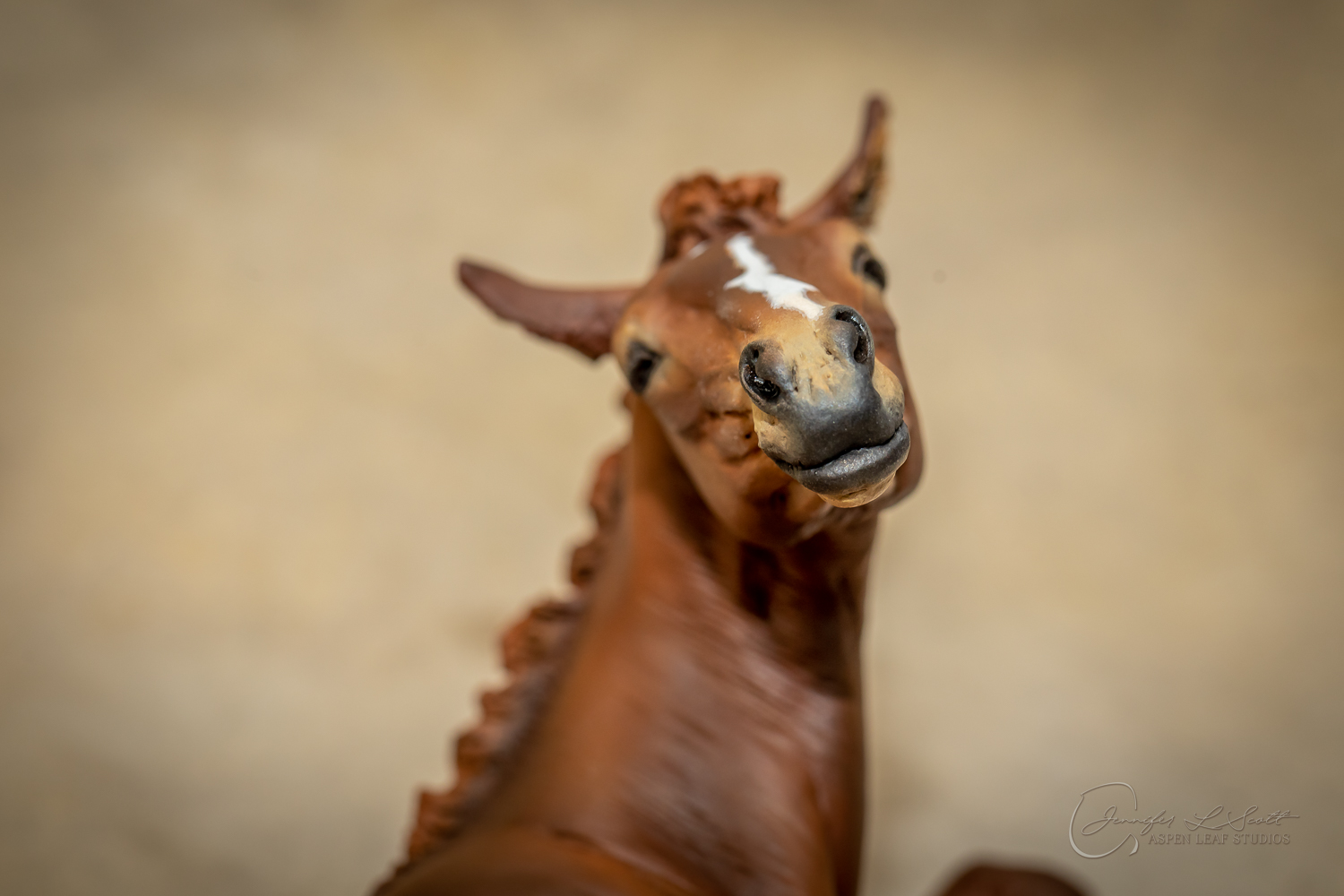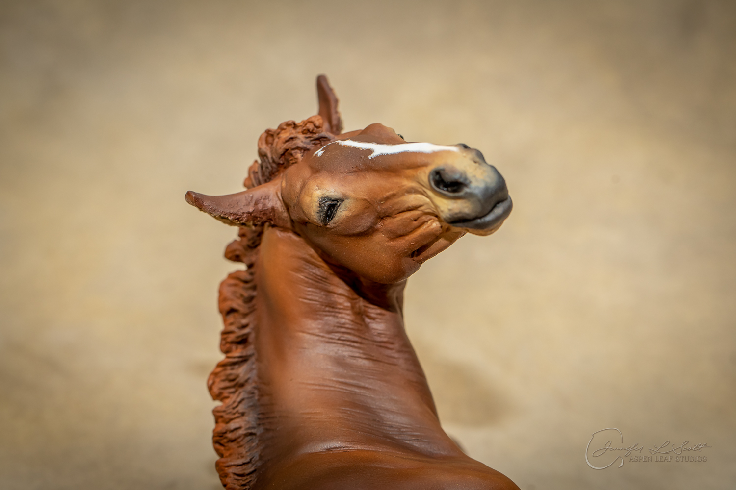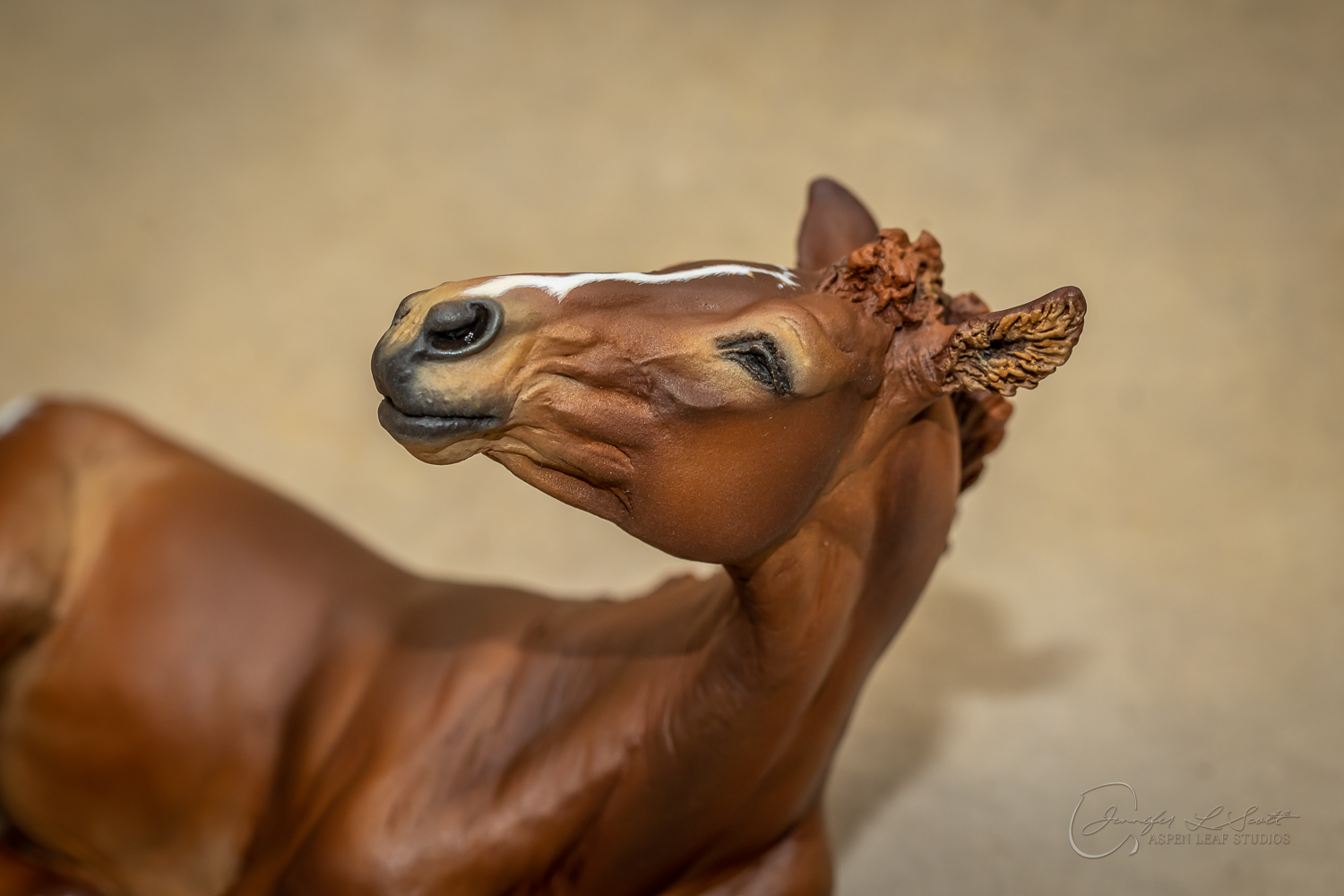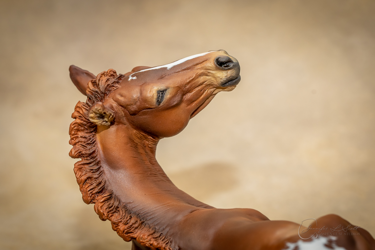 Traditional Scale "Little Man Mango" resin sculpted by Morgen Kilbourn painted to chestnut split-blanket appaloosa in 2022.