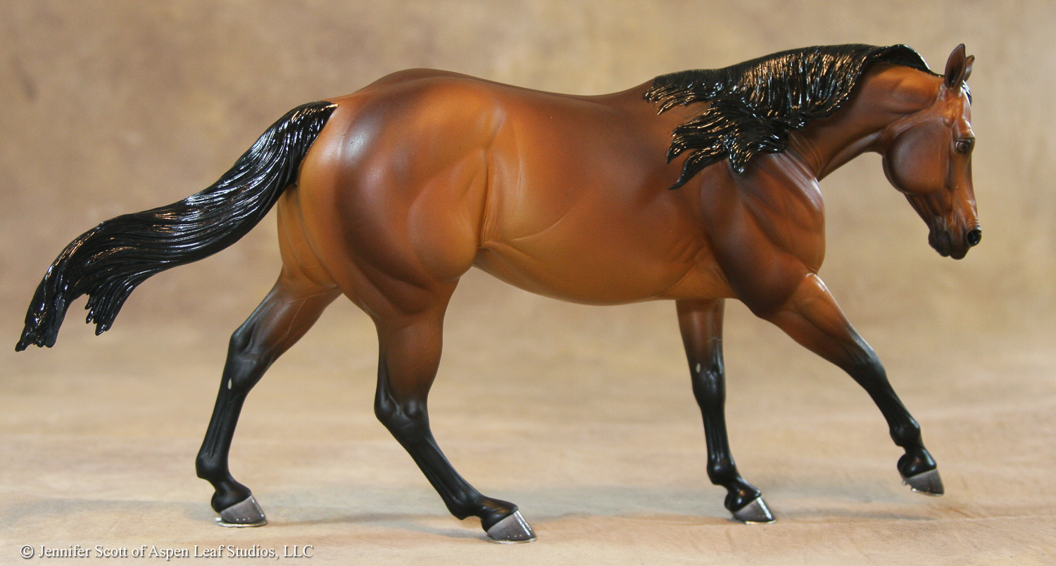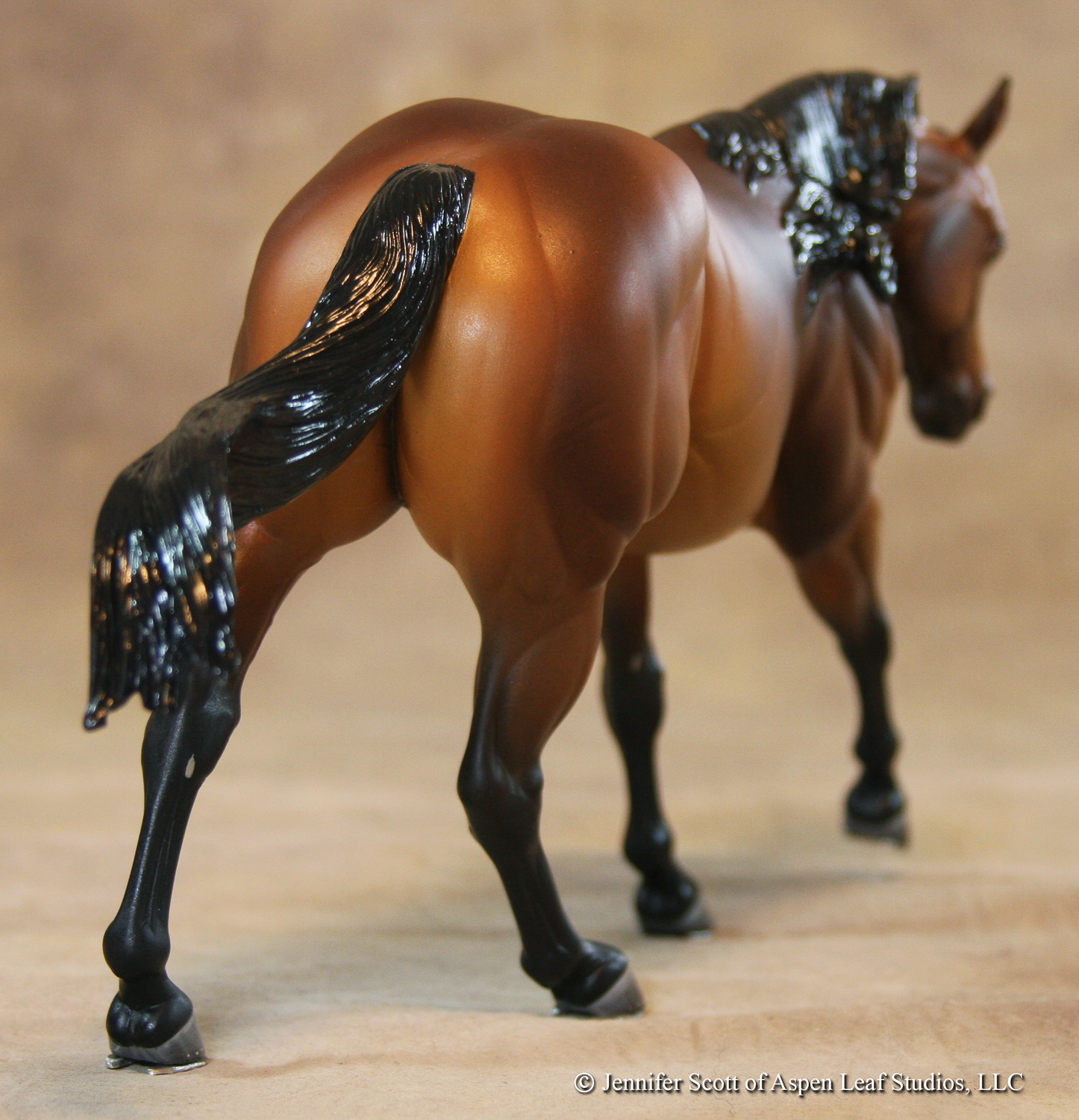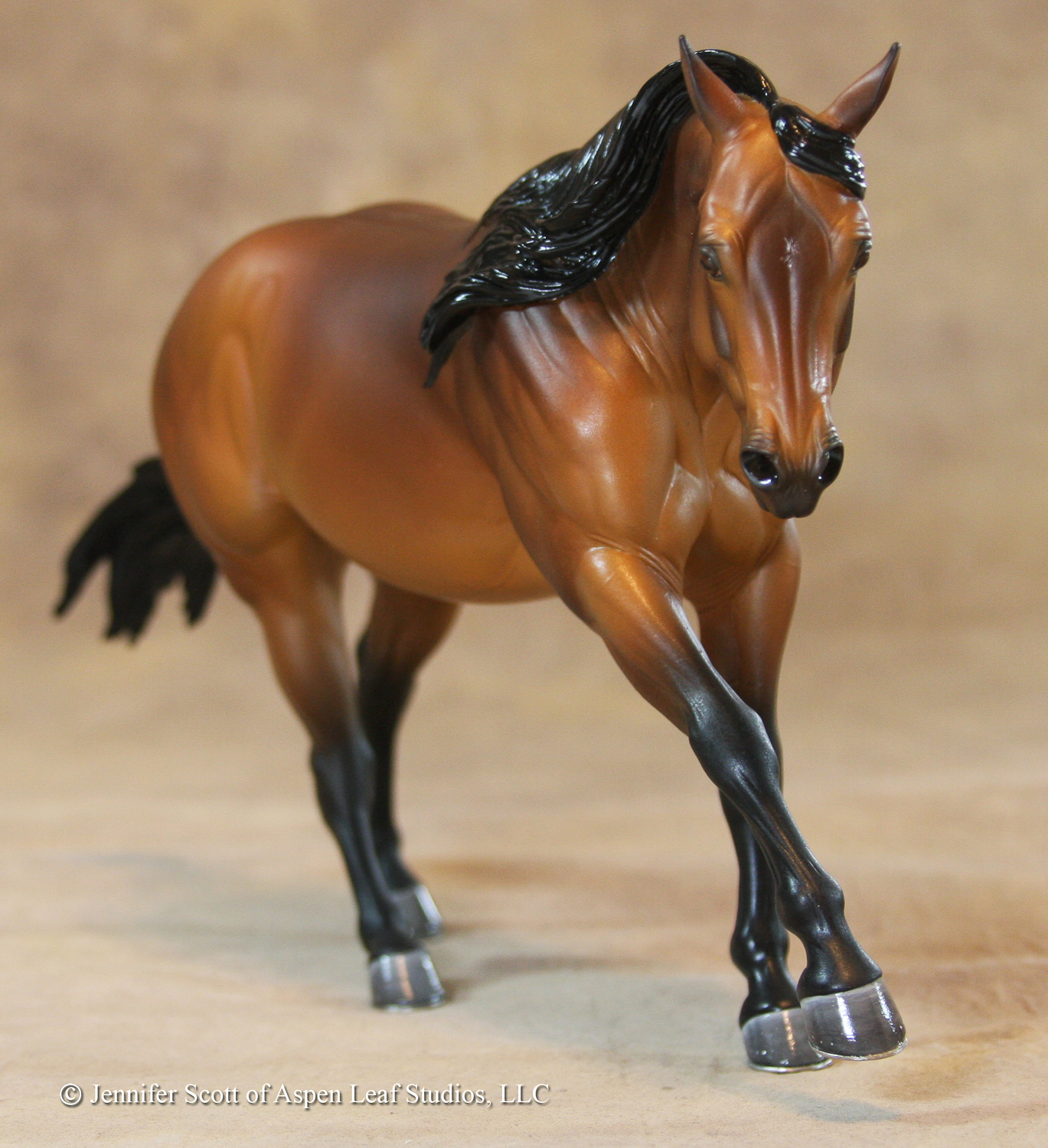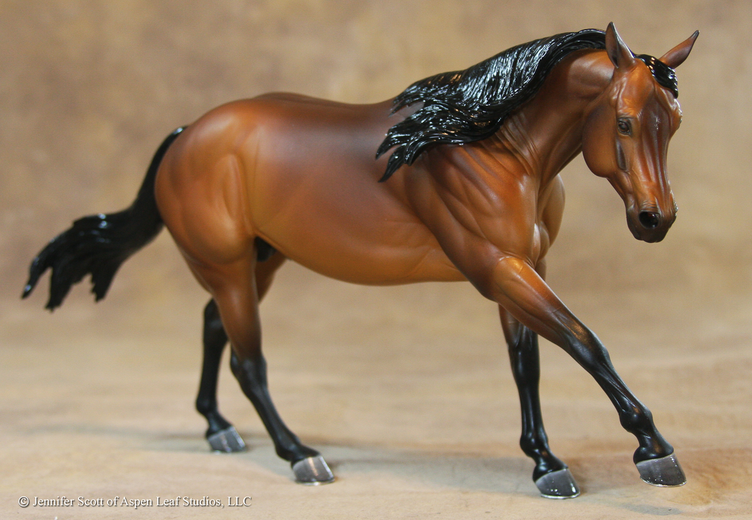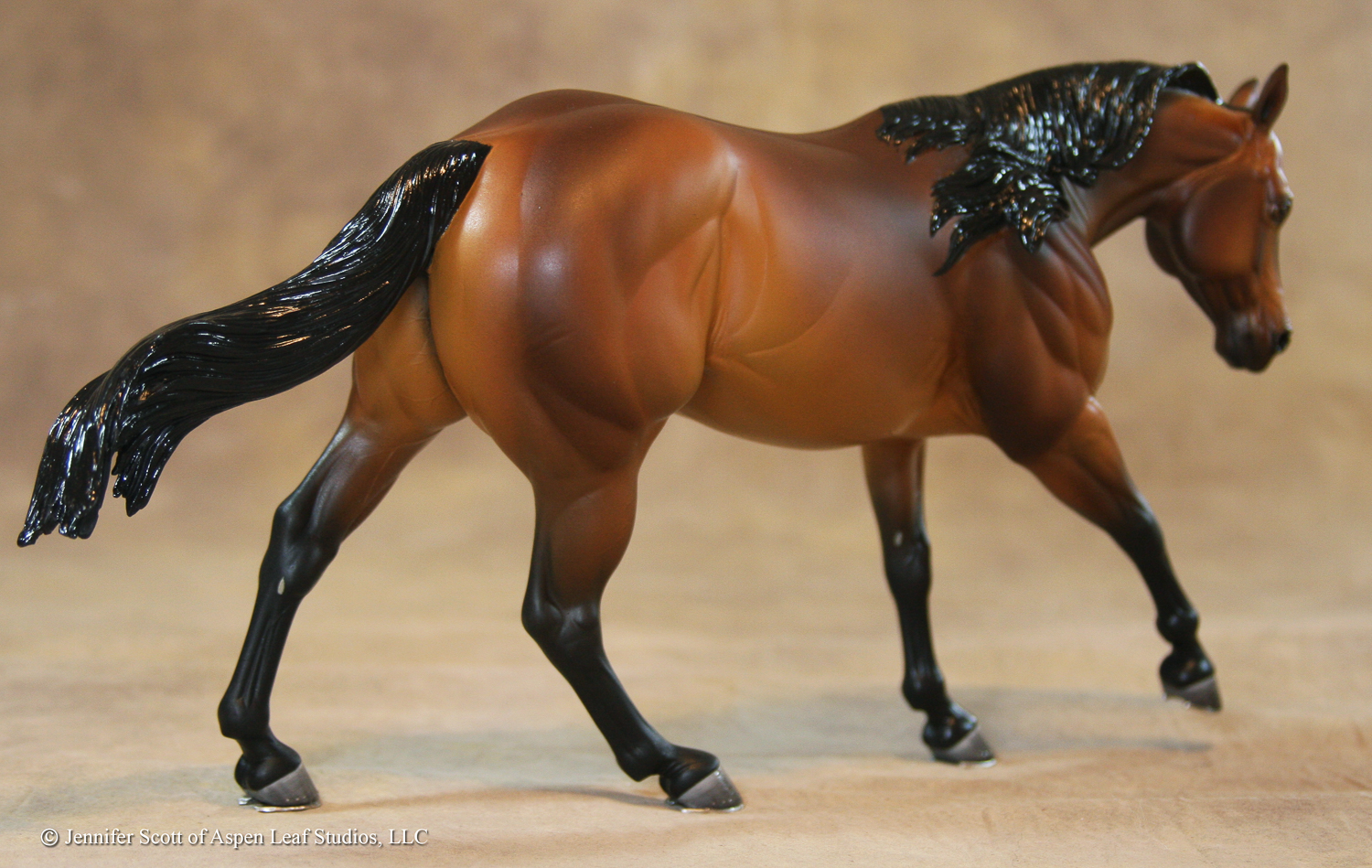 Traditional Scale "Reiner" resin by Sarah Rose painted black in 2013. Piece was also customized to stand off-base and metal shoes (sliders on back) were applied to complete the reining horse appearance.
