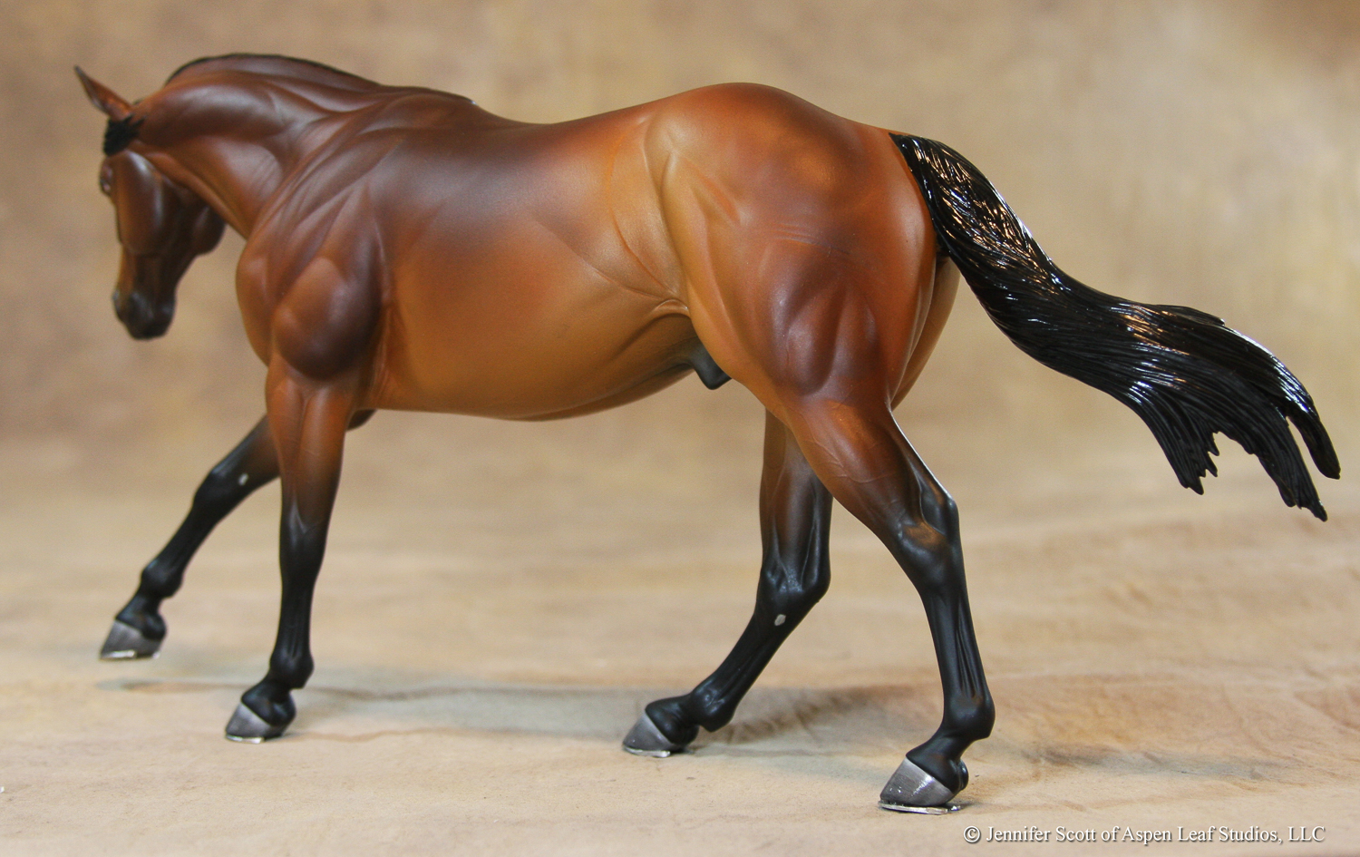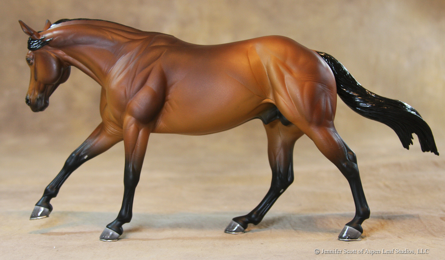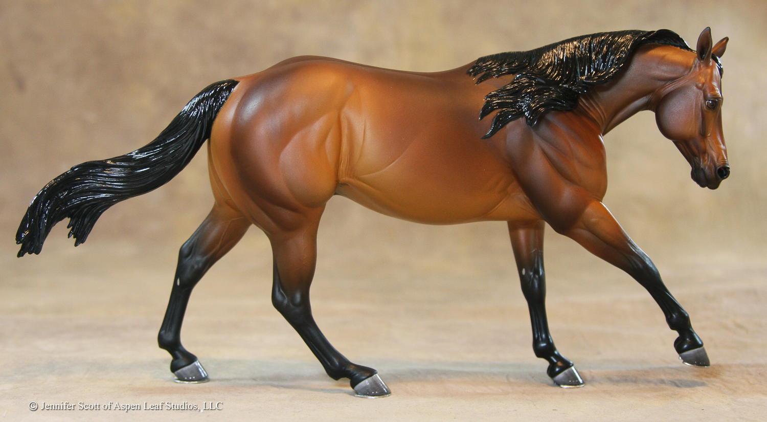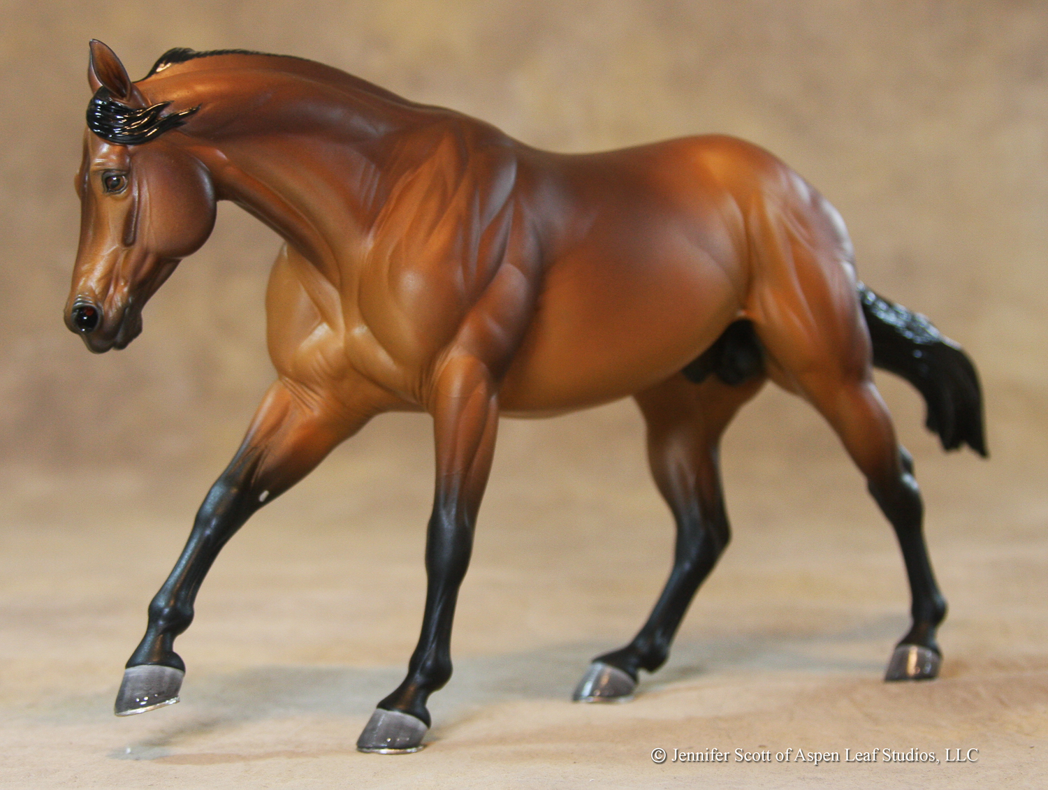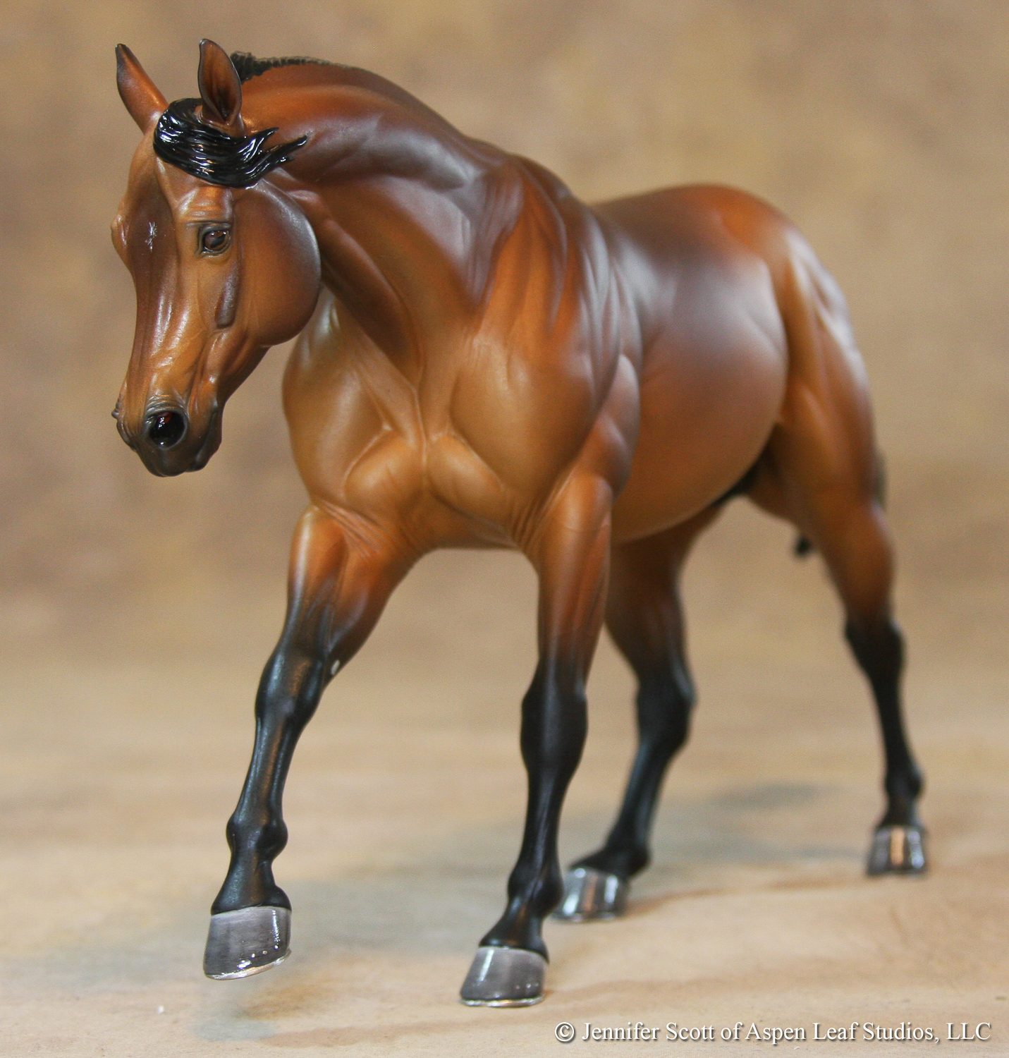 Traditional Scale "Reiner" resin by Sarah Rose painted black in 2013. Piece was also customized to stand off-base and metal shoes (sliders on back) were applied to complete the reining horse appearance.