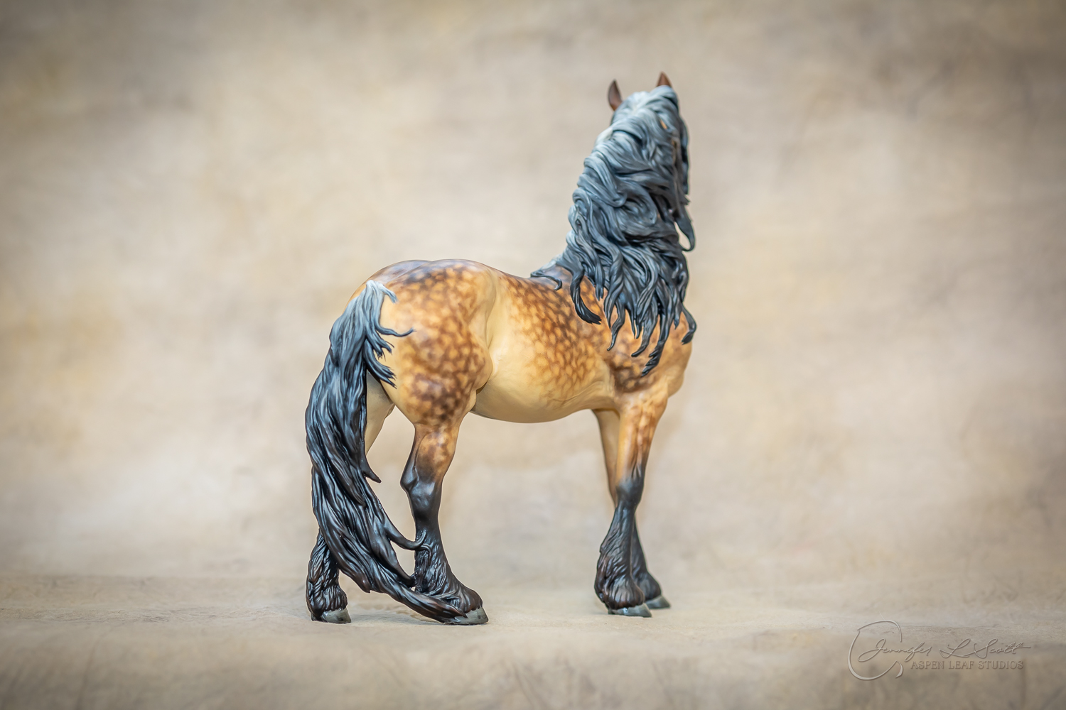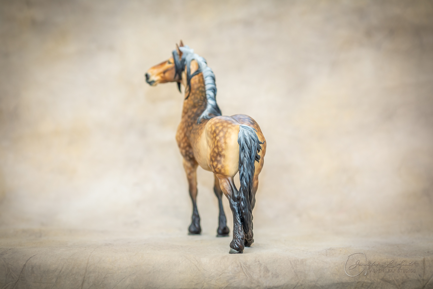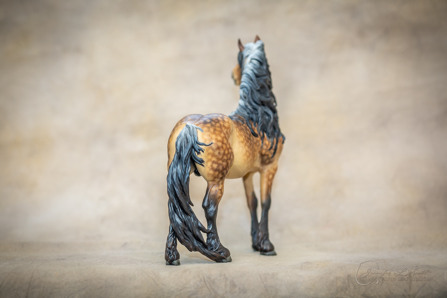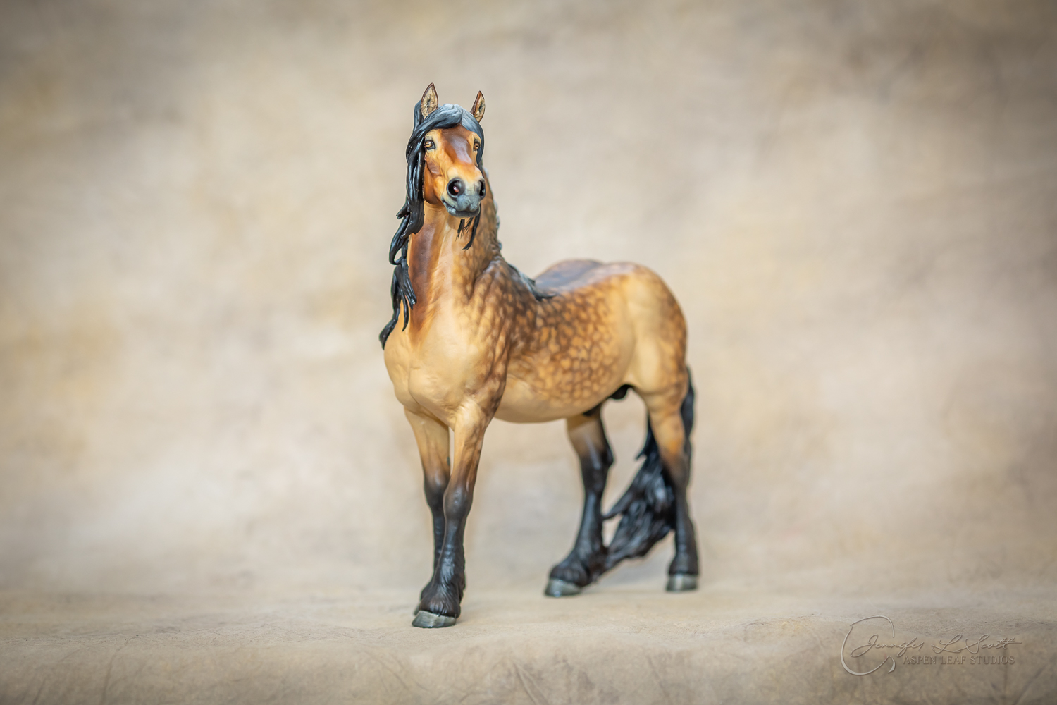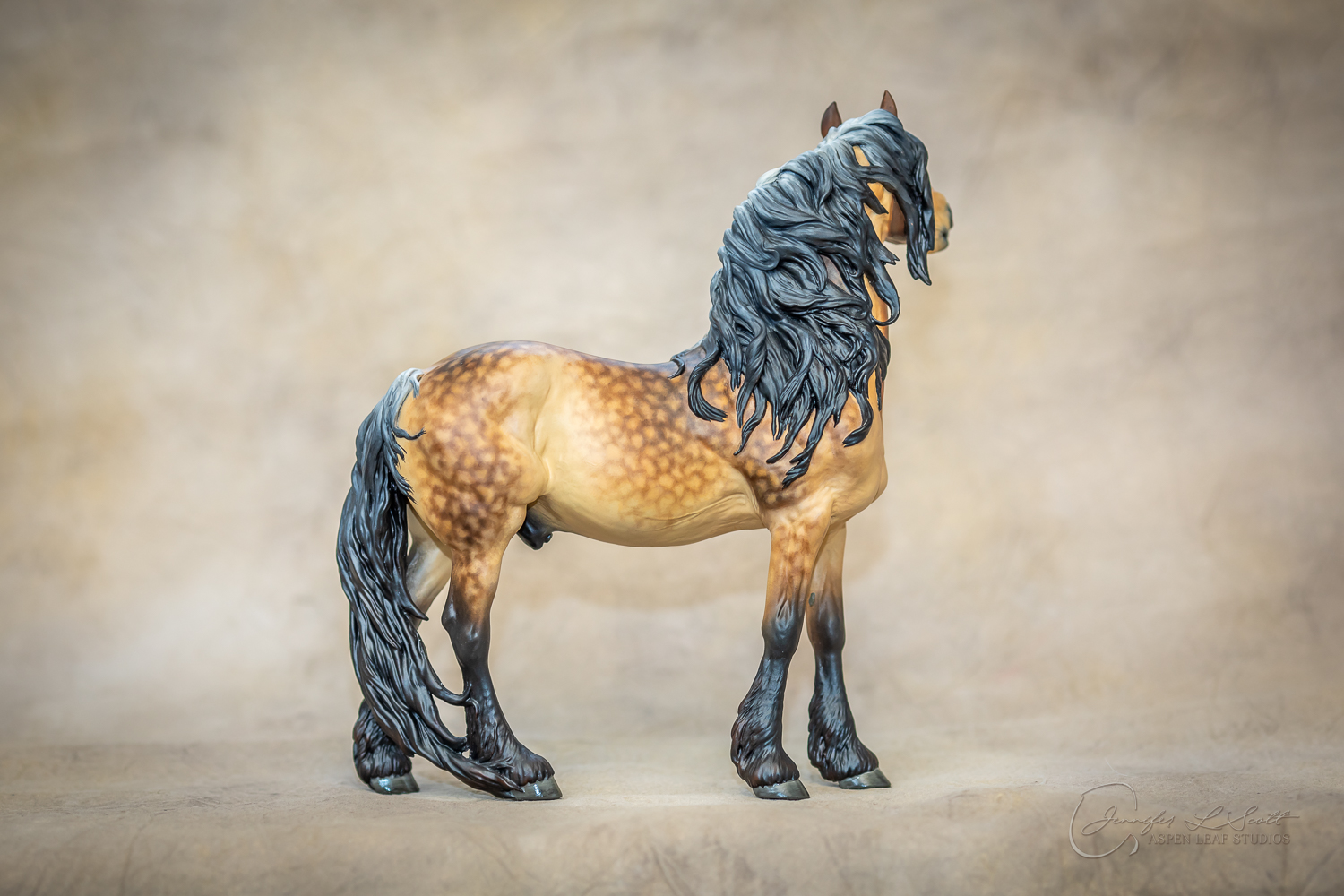 Small Traditional Scale "Fritz" resin by Sarah Minkiewicz-Breunig painted to a dappled sooty buckskin with mane and tail frosting in 2024.
