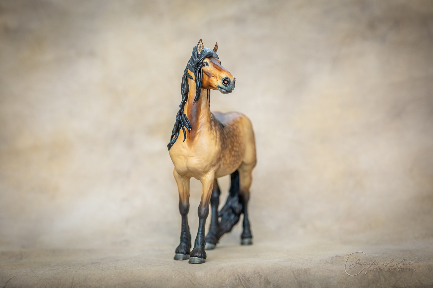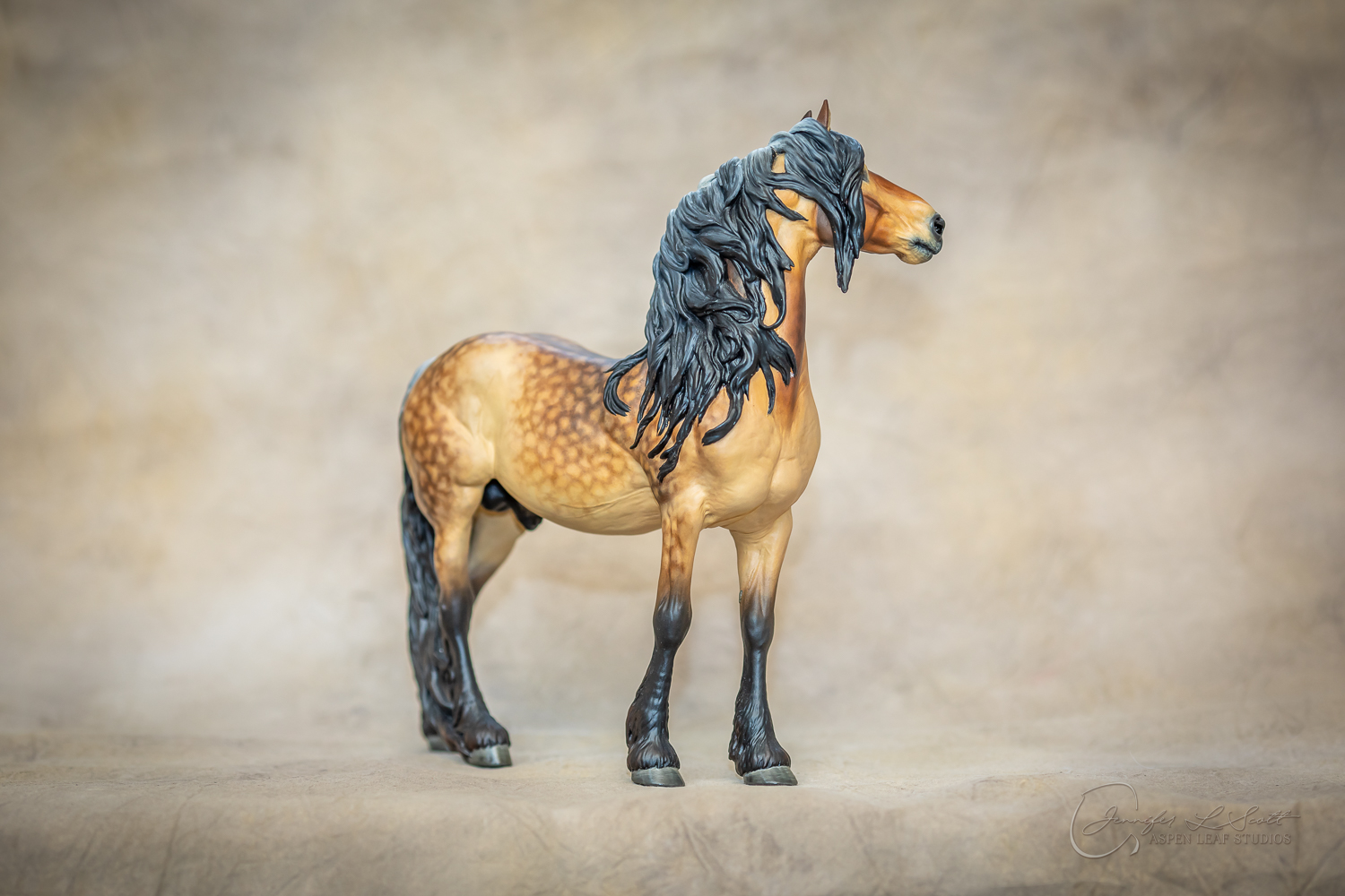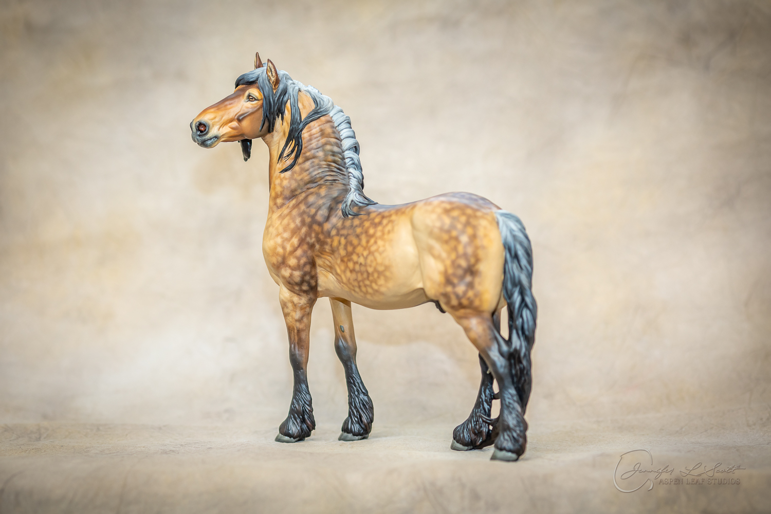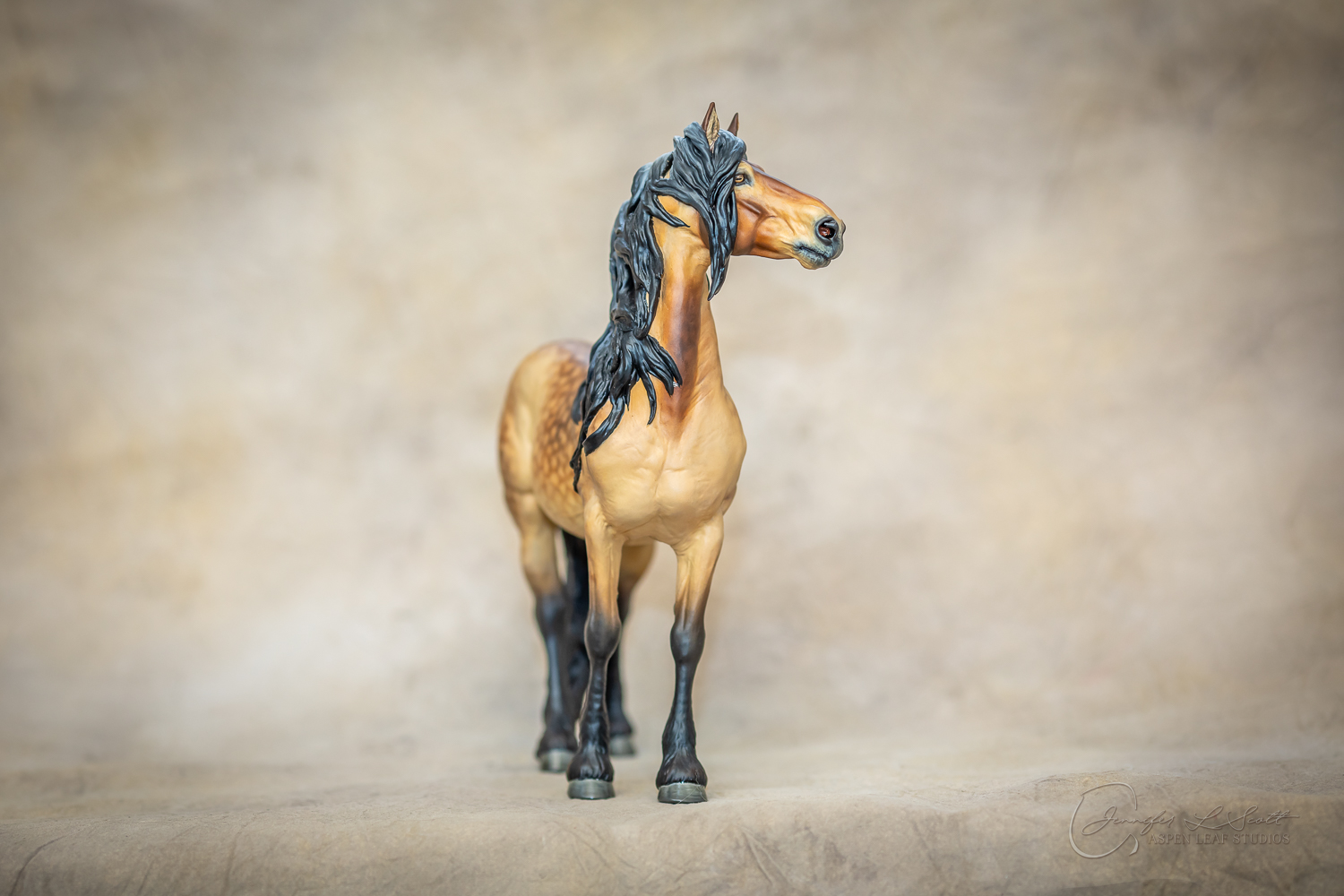 Small Traditional Scale "Fritz" resin by Sarah Minkiewicz-Breunig painted to a dappled sooty buckskin with mane and tail frosting in 2024.