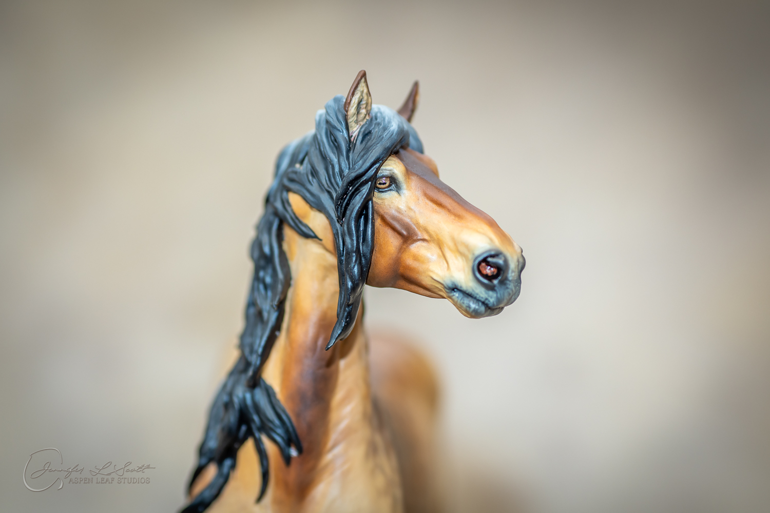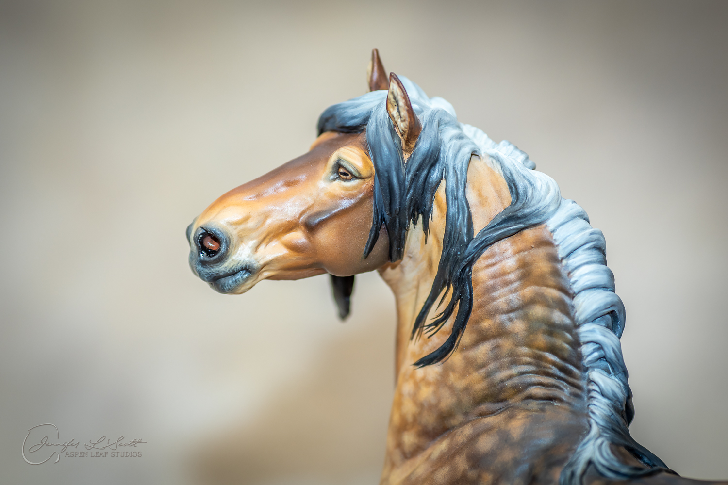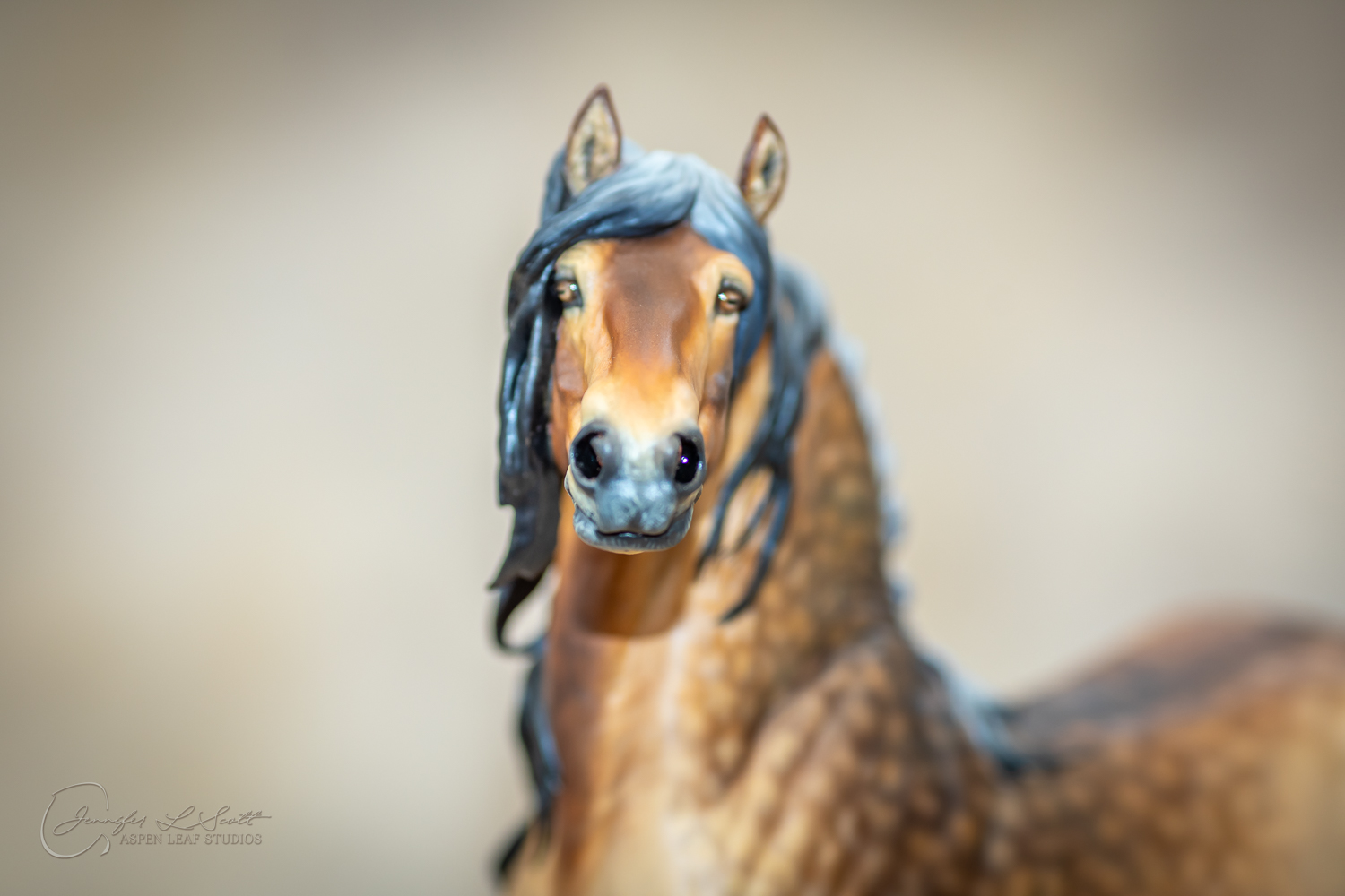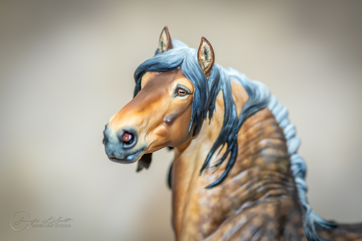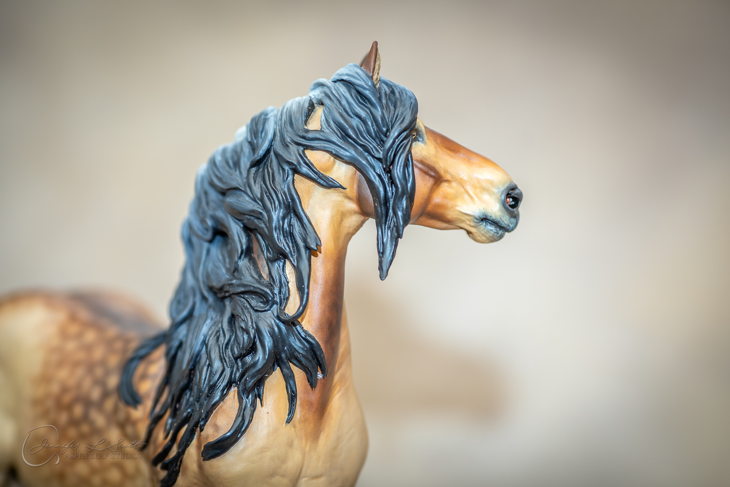 Small Traditional Scale "Fritz" resin by Sarah Minkiewicz-Breunig painted to a dappled sooty buckskin with mane and tail frosting in 2024.