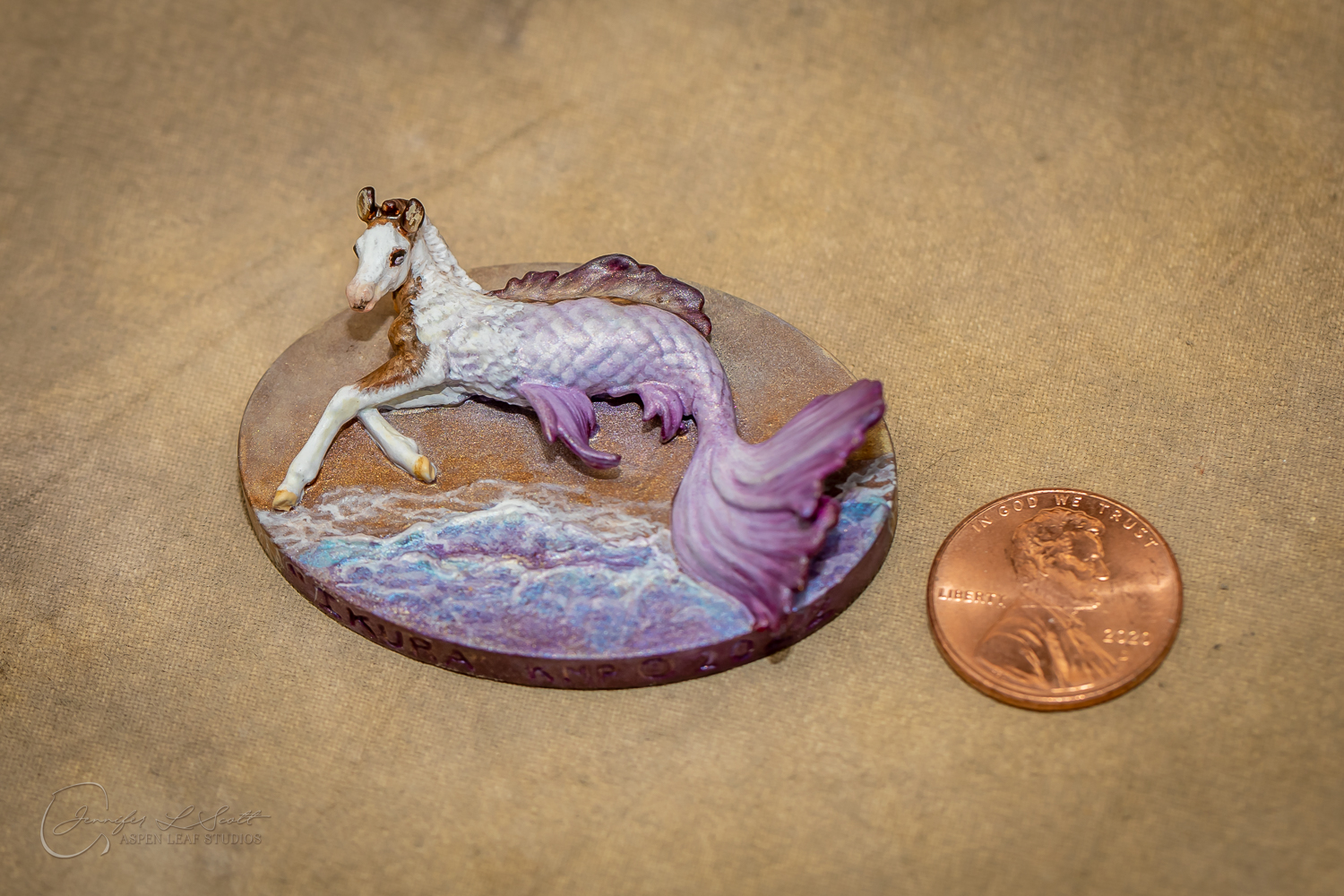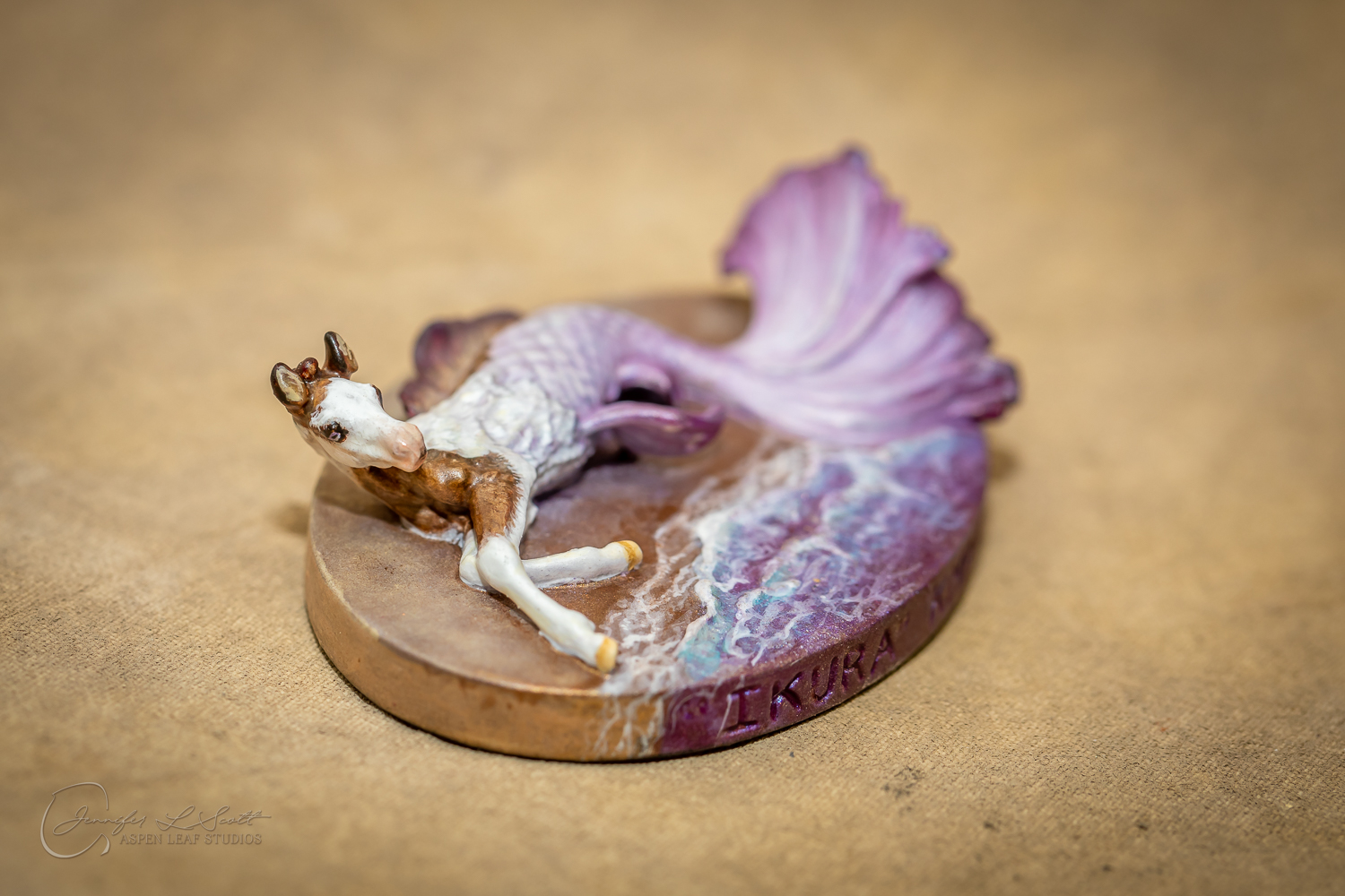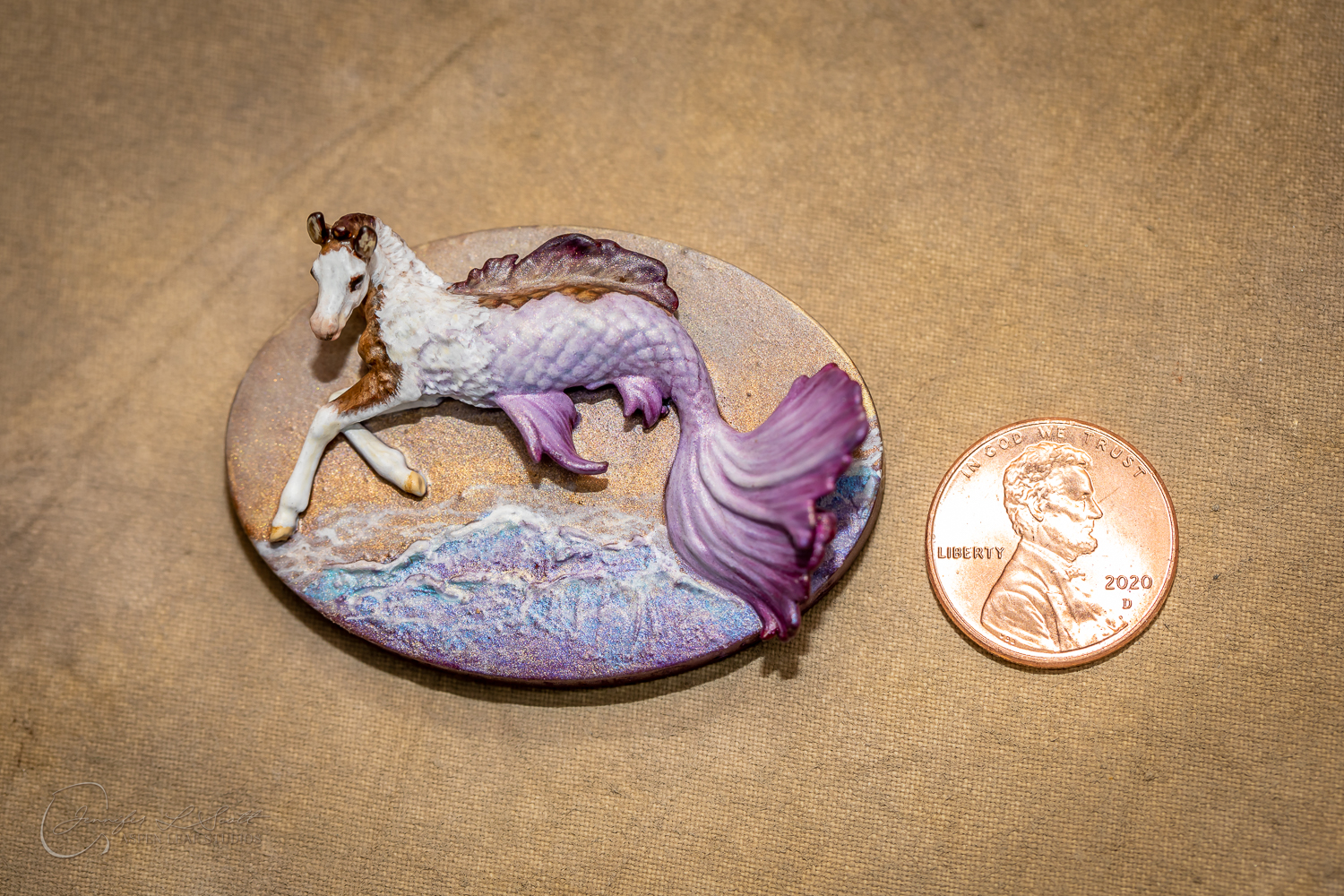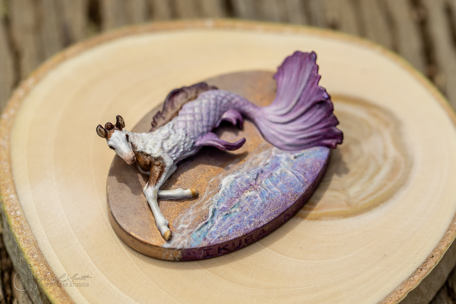 Micro Scale "Ikura" by Kylee Parks painted bay overo with purple fins in 2022.