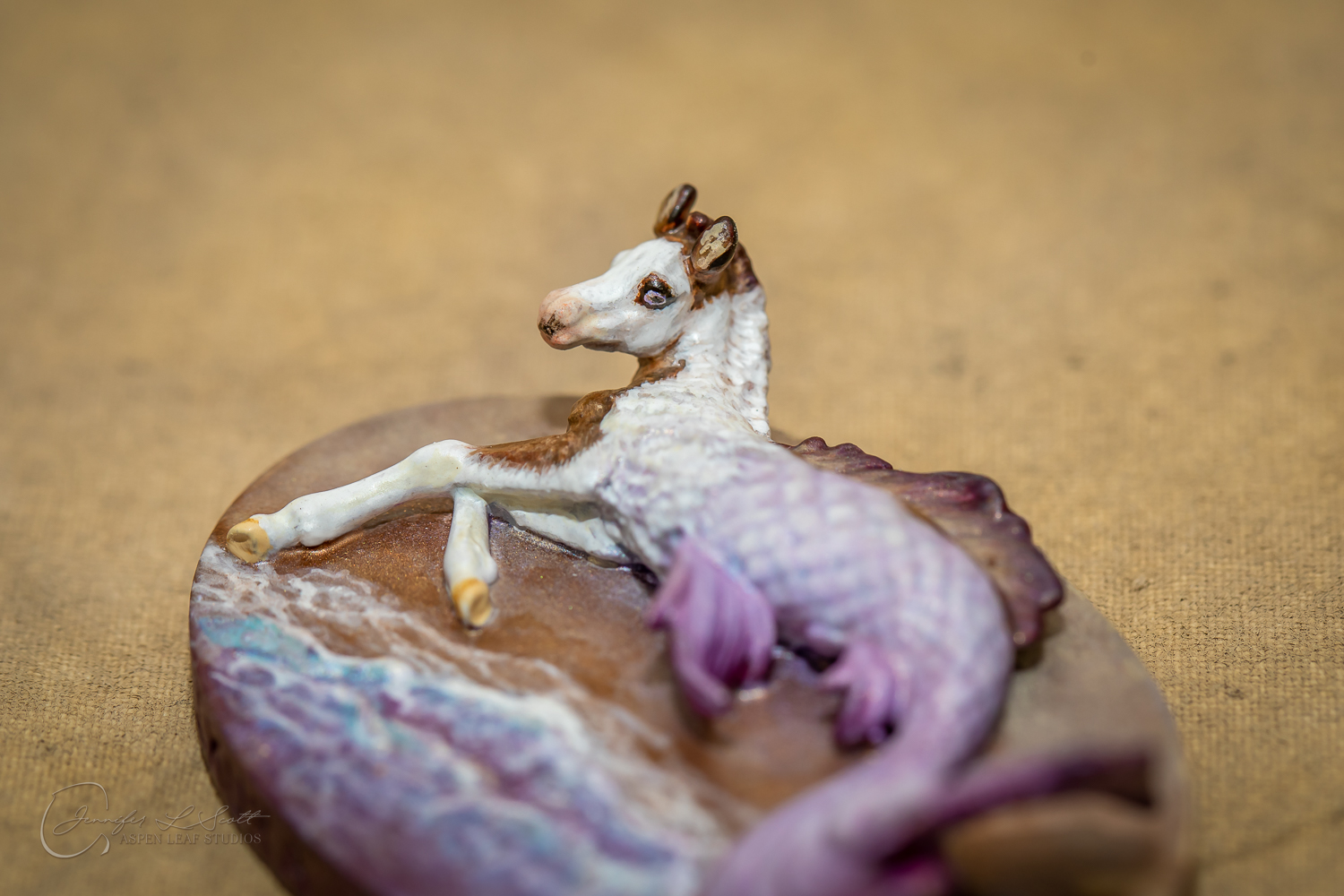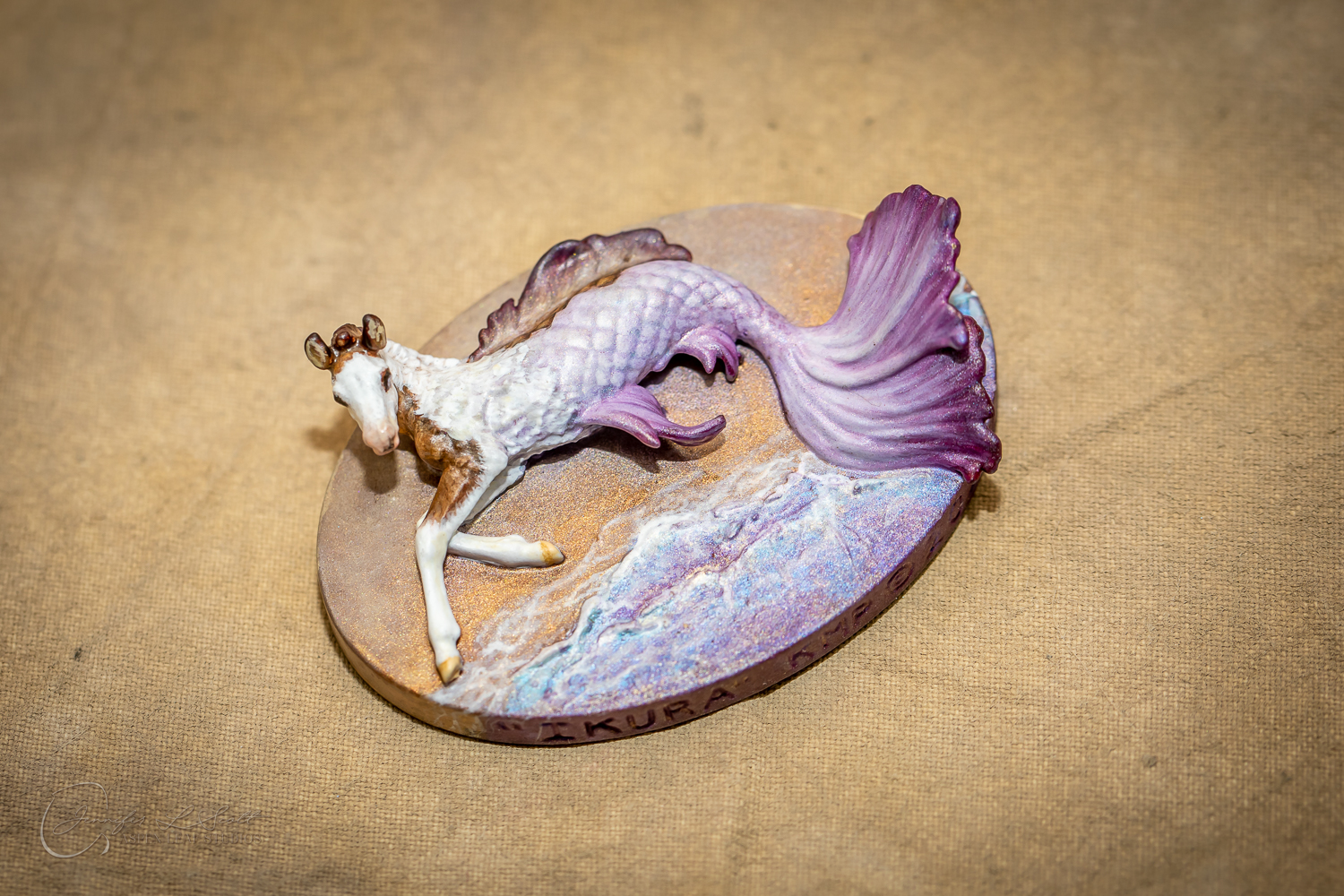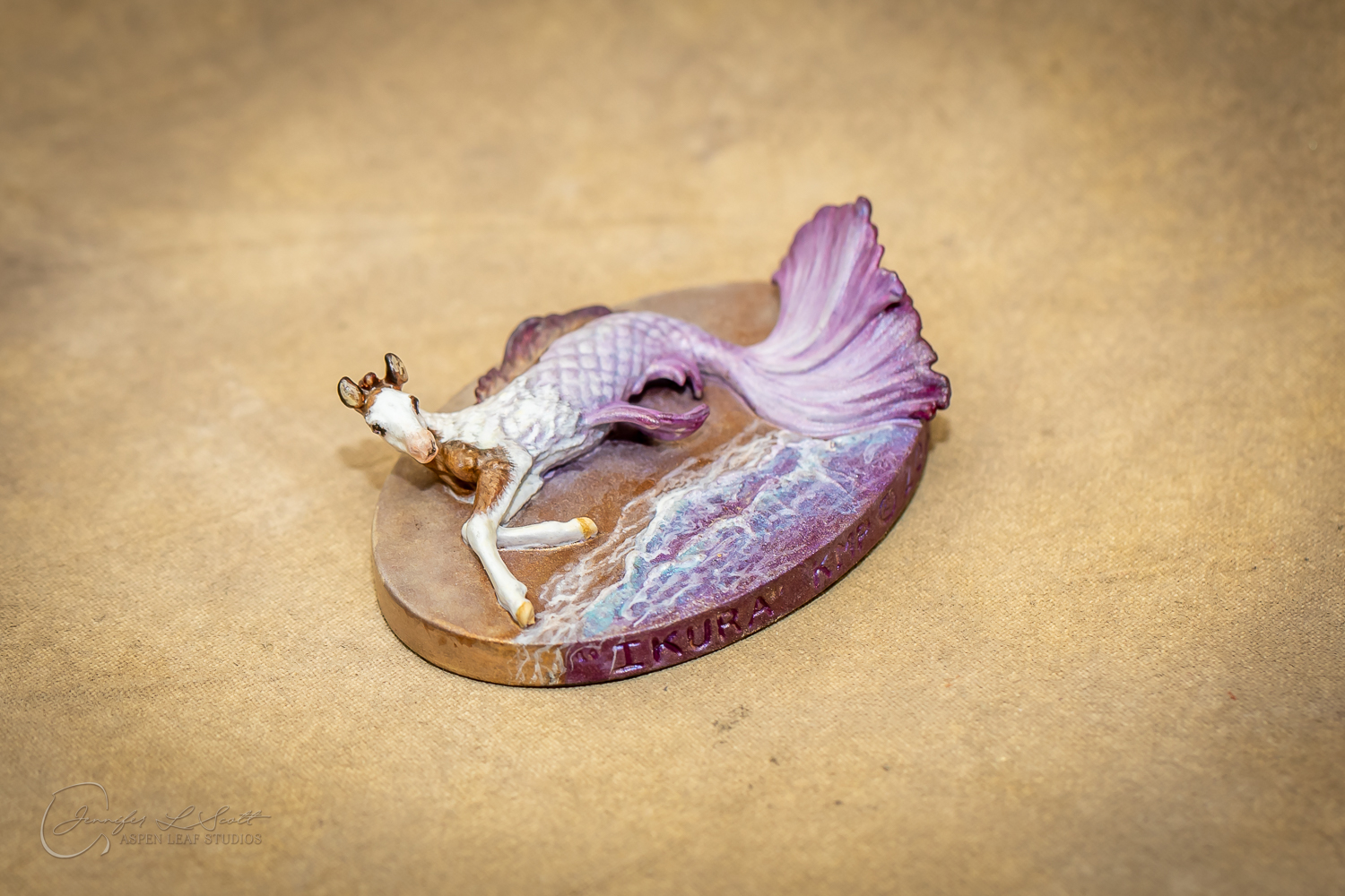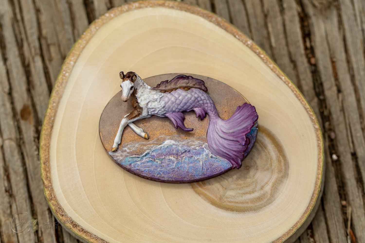 Micro Scale "Ikura" by Kylee Parks painted bay overo with purple fins in 2022.