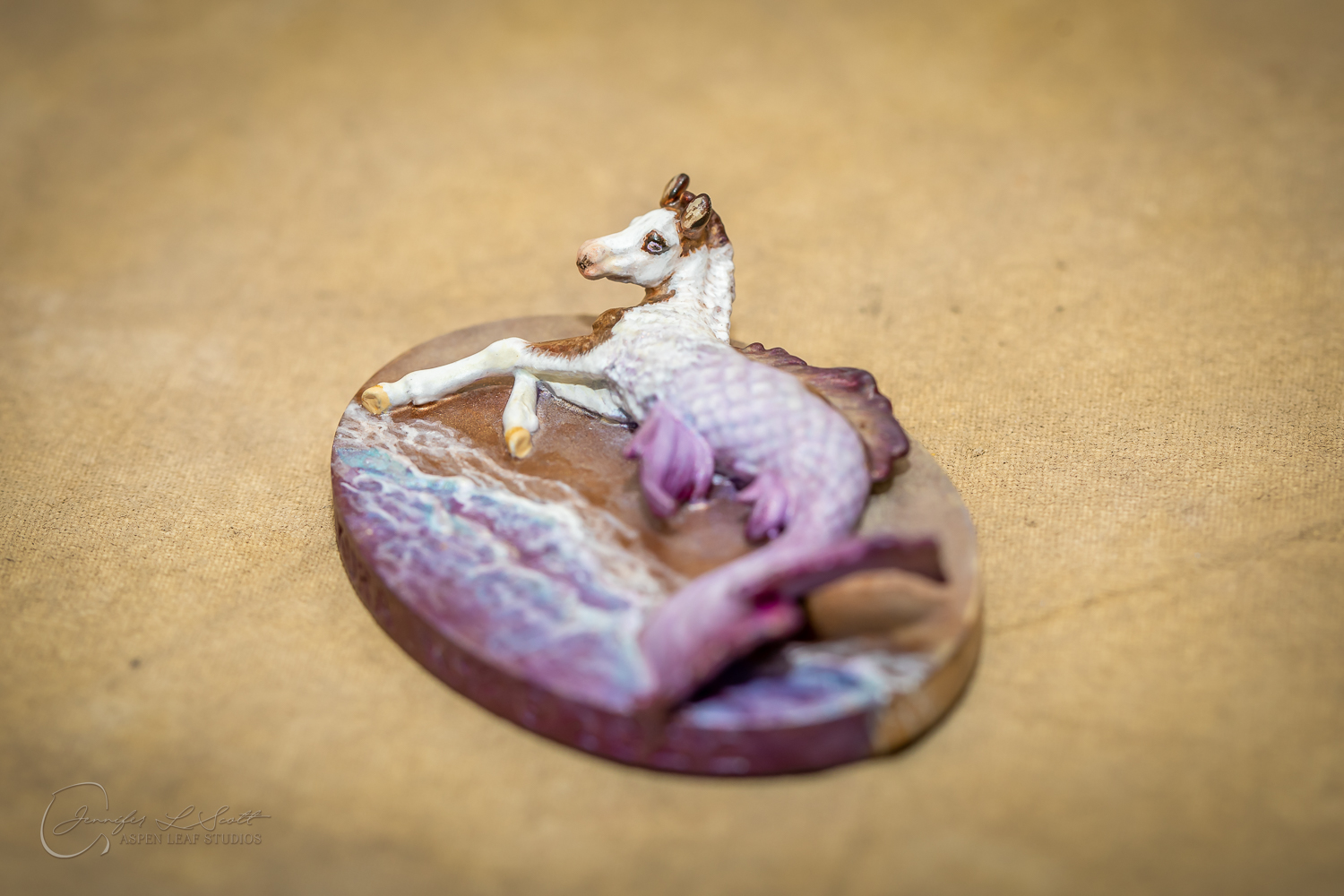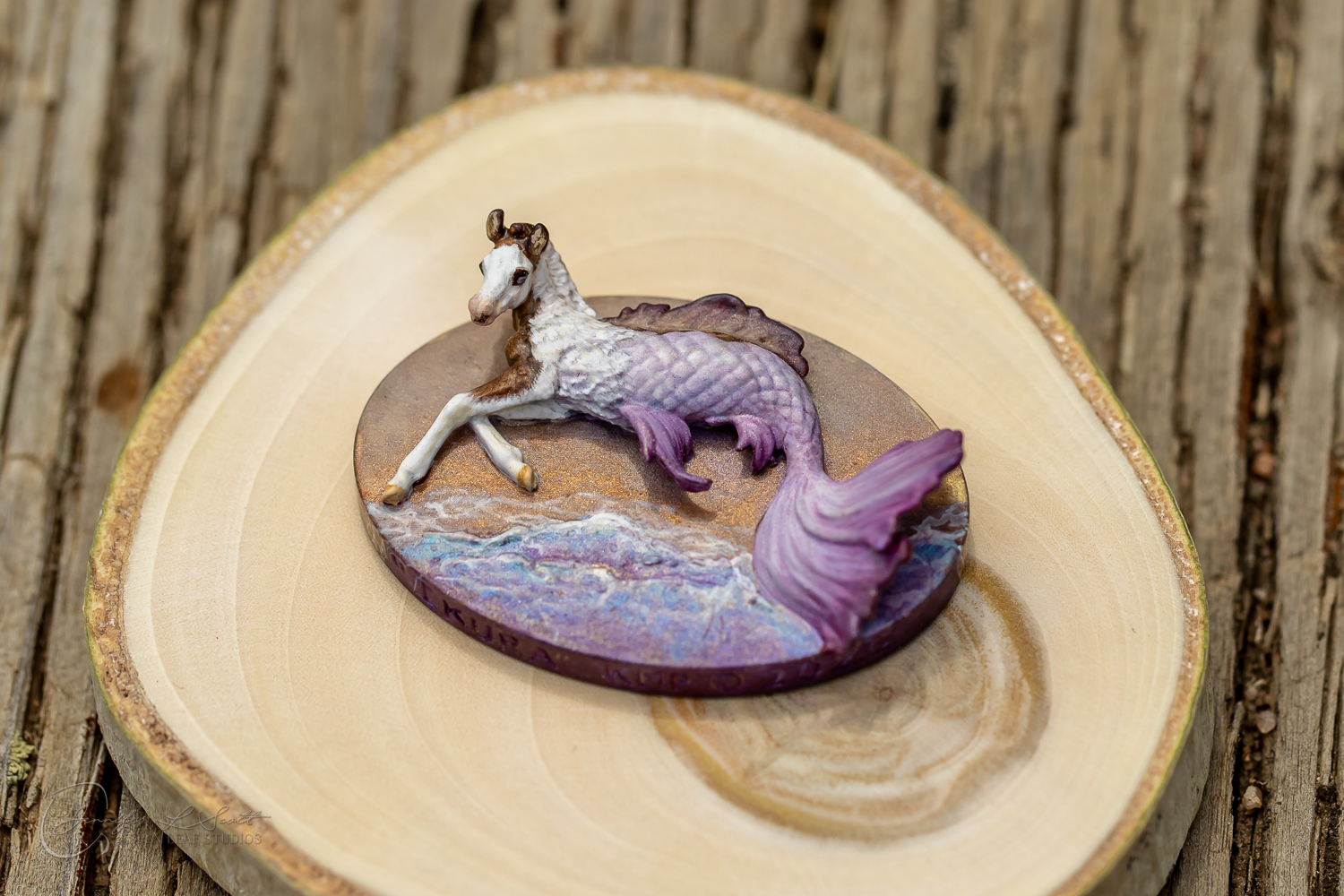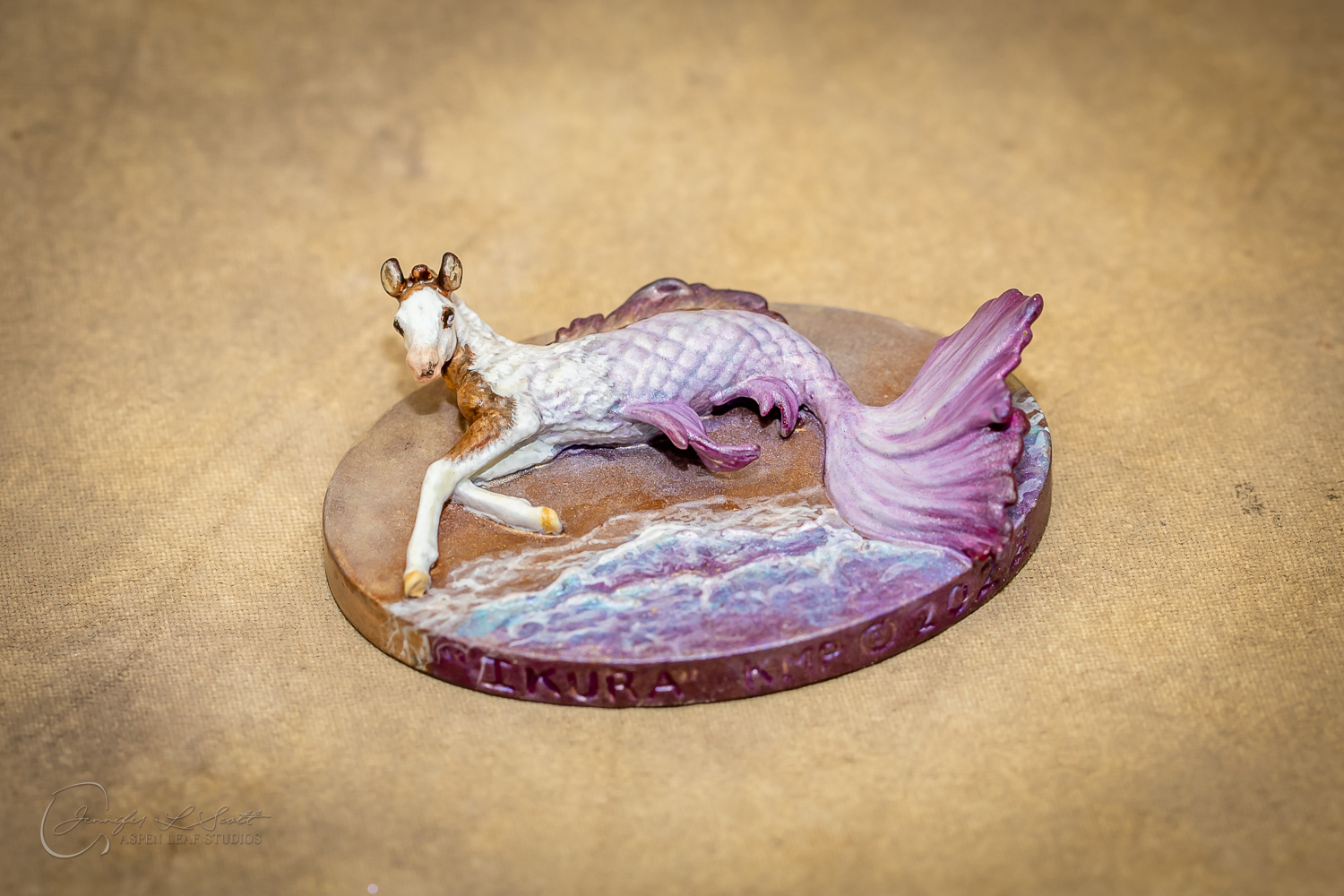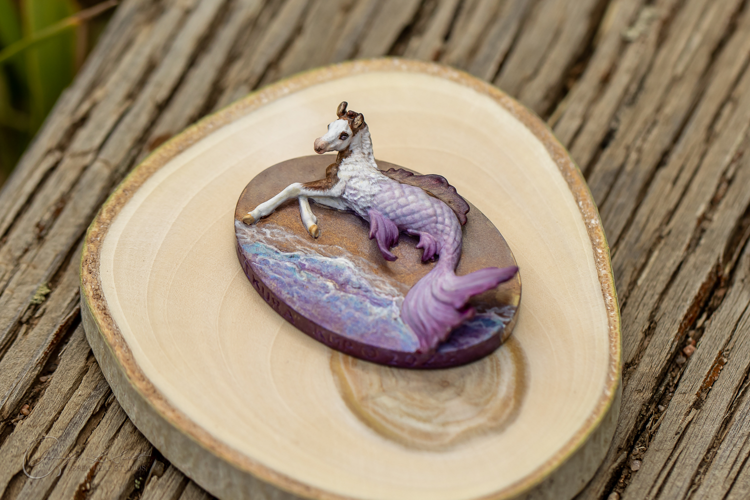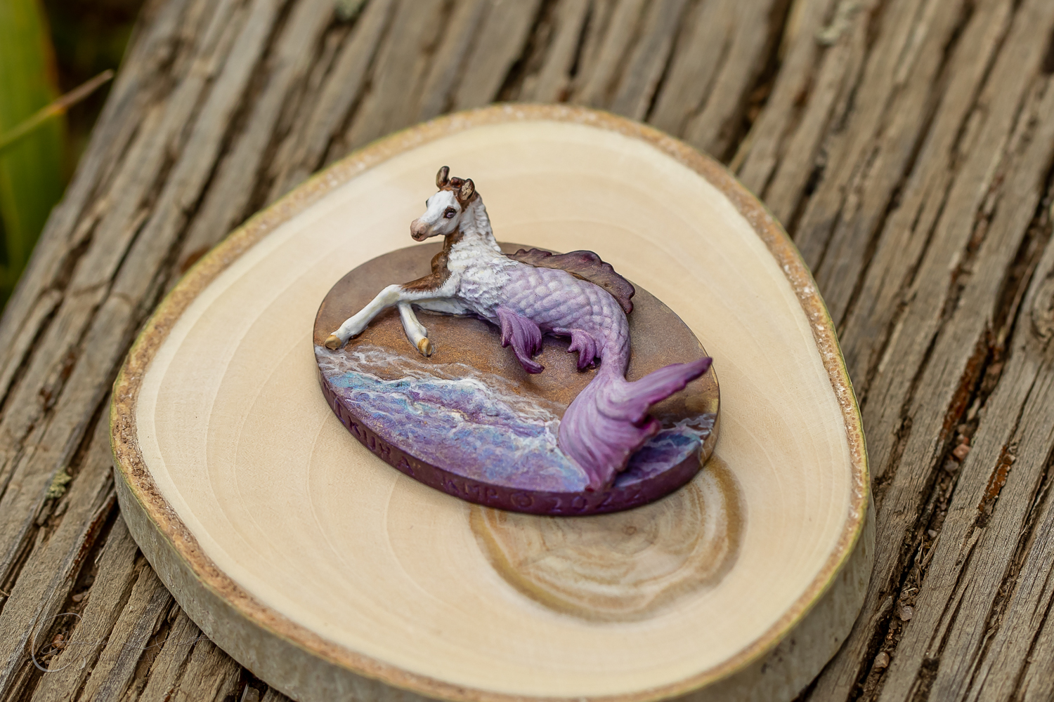 Micro Scale "Ikura" by Kylee Parks painted bay overo with purple fins in 2022.