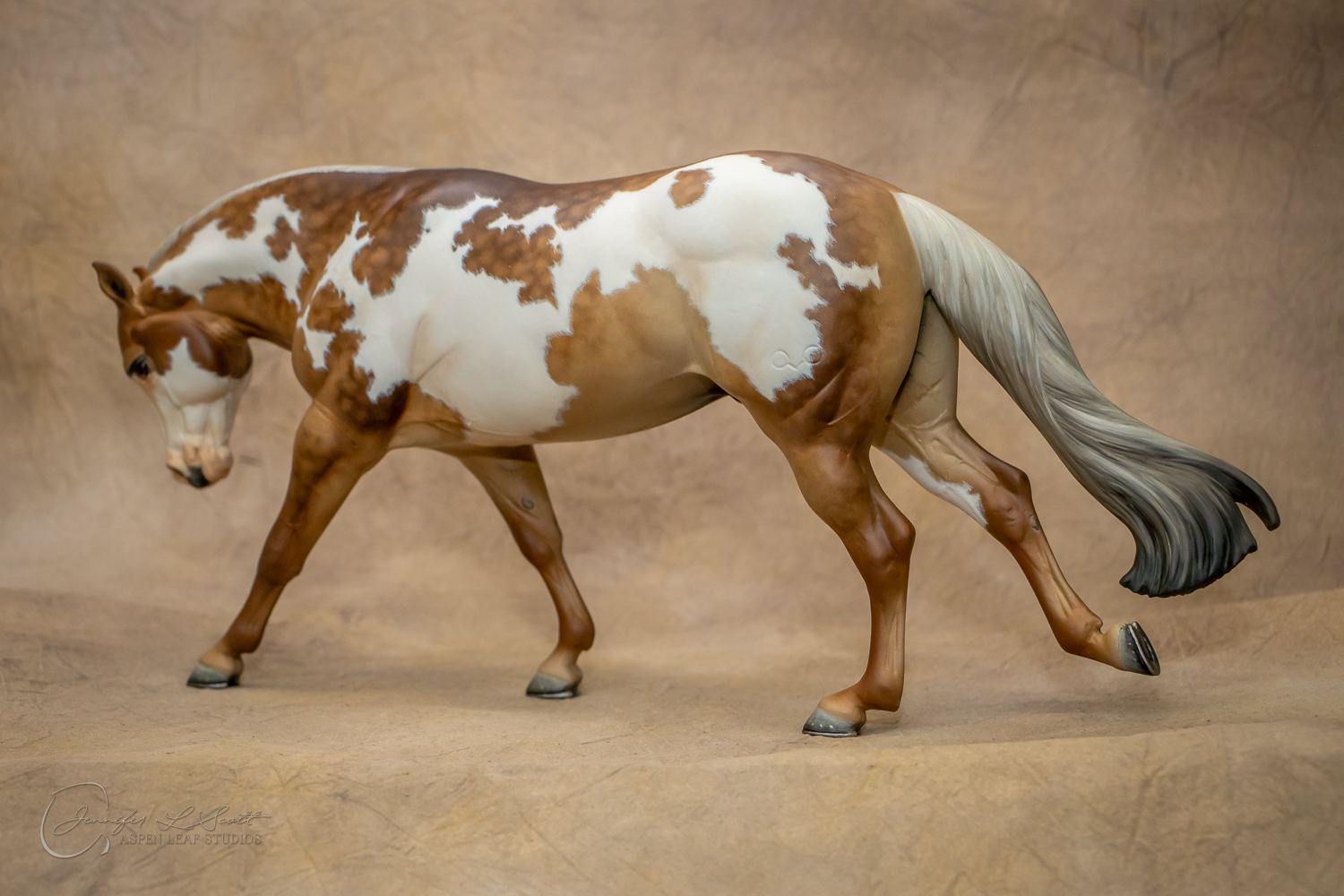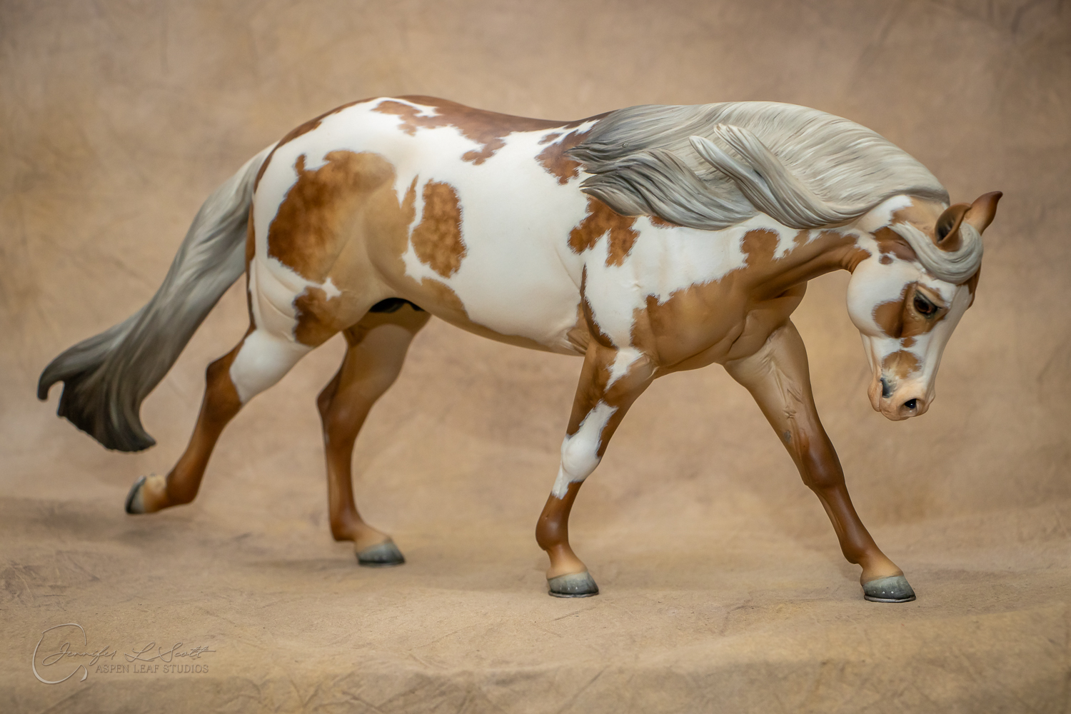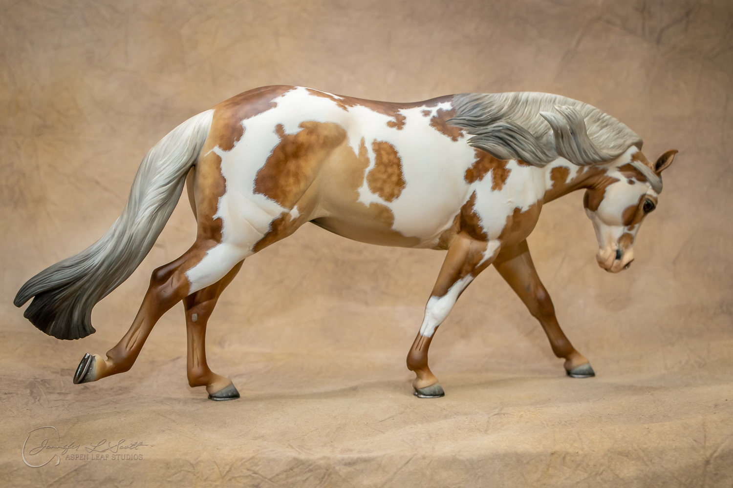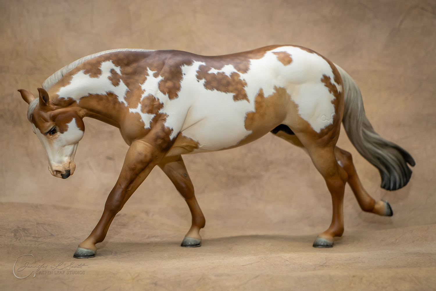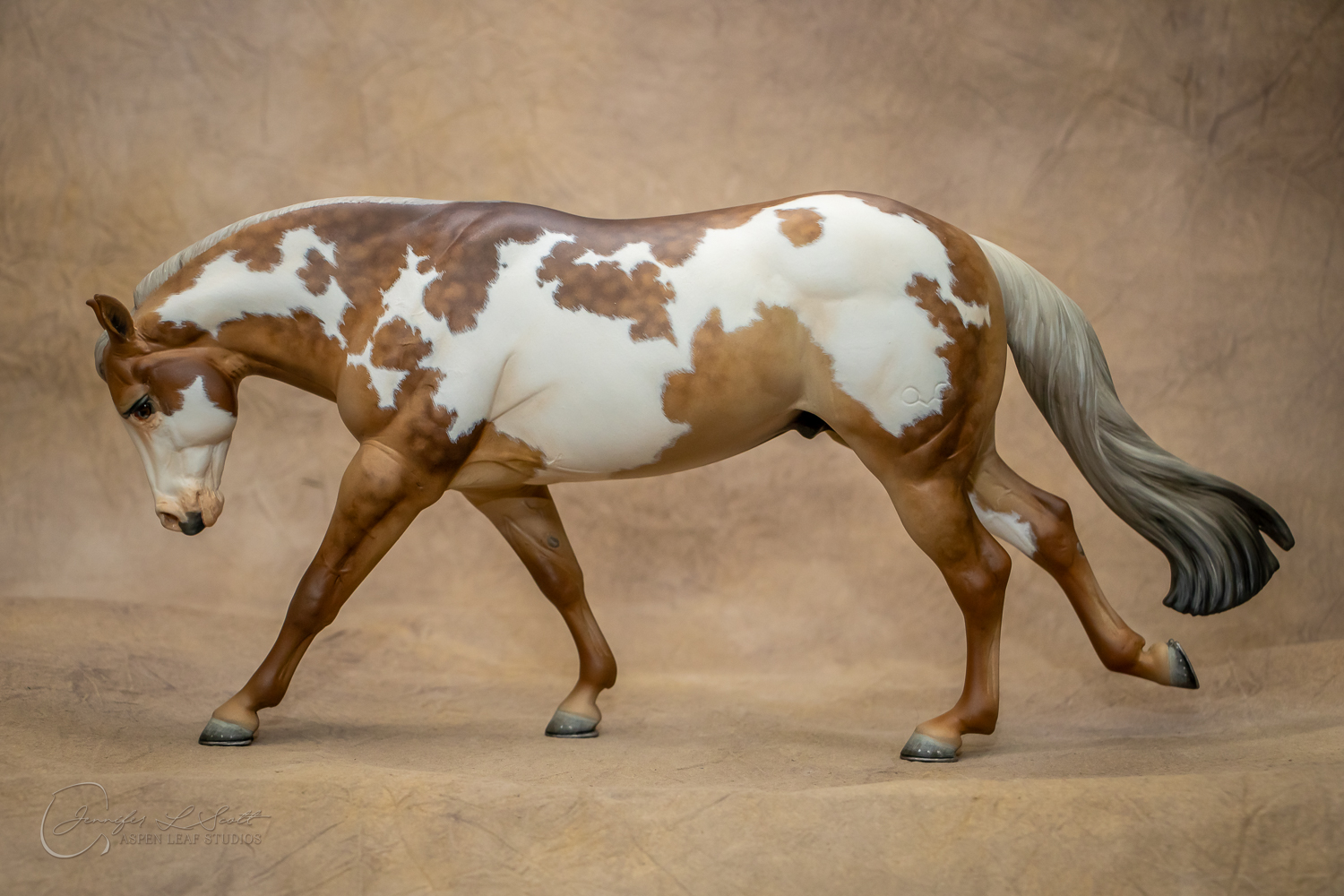 Traditional Scale "Chex Bueno" resin by Debbi Lermond painted sooty dappled palomino overo in 2019.