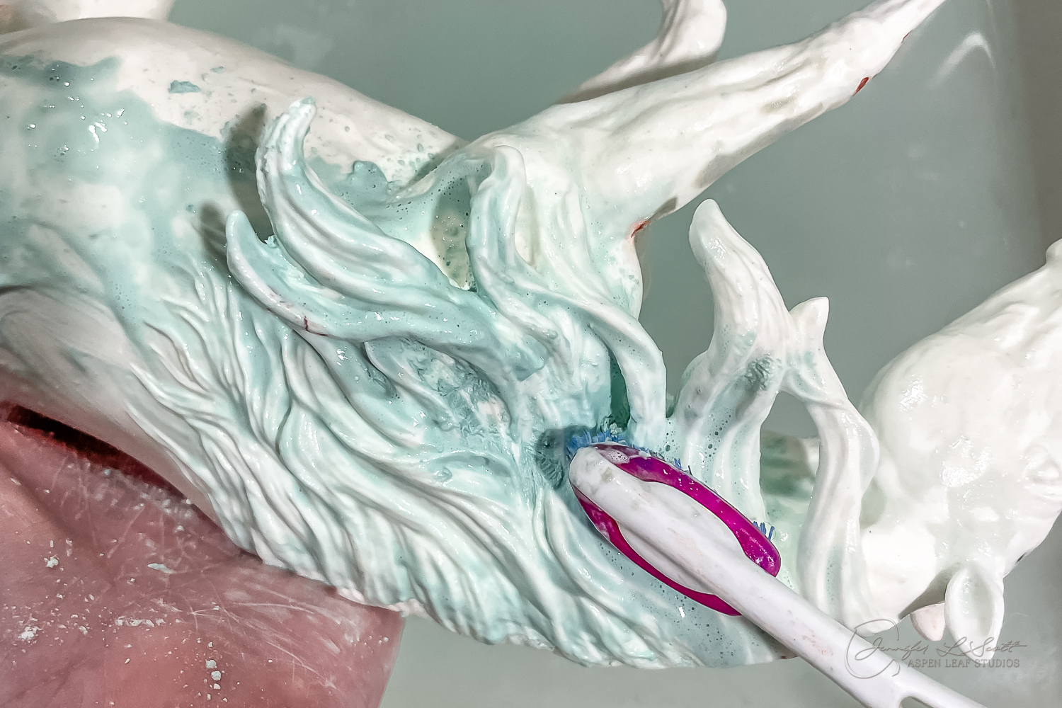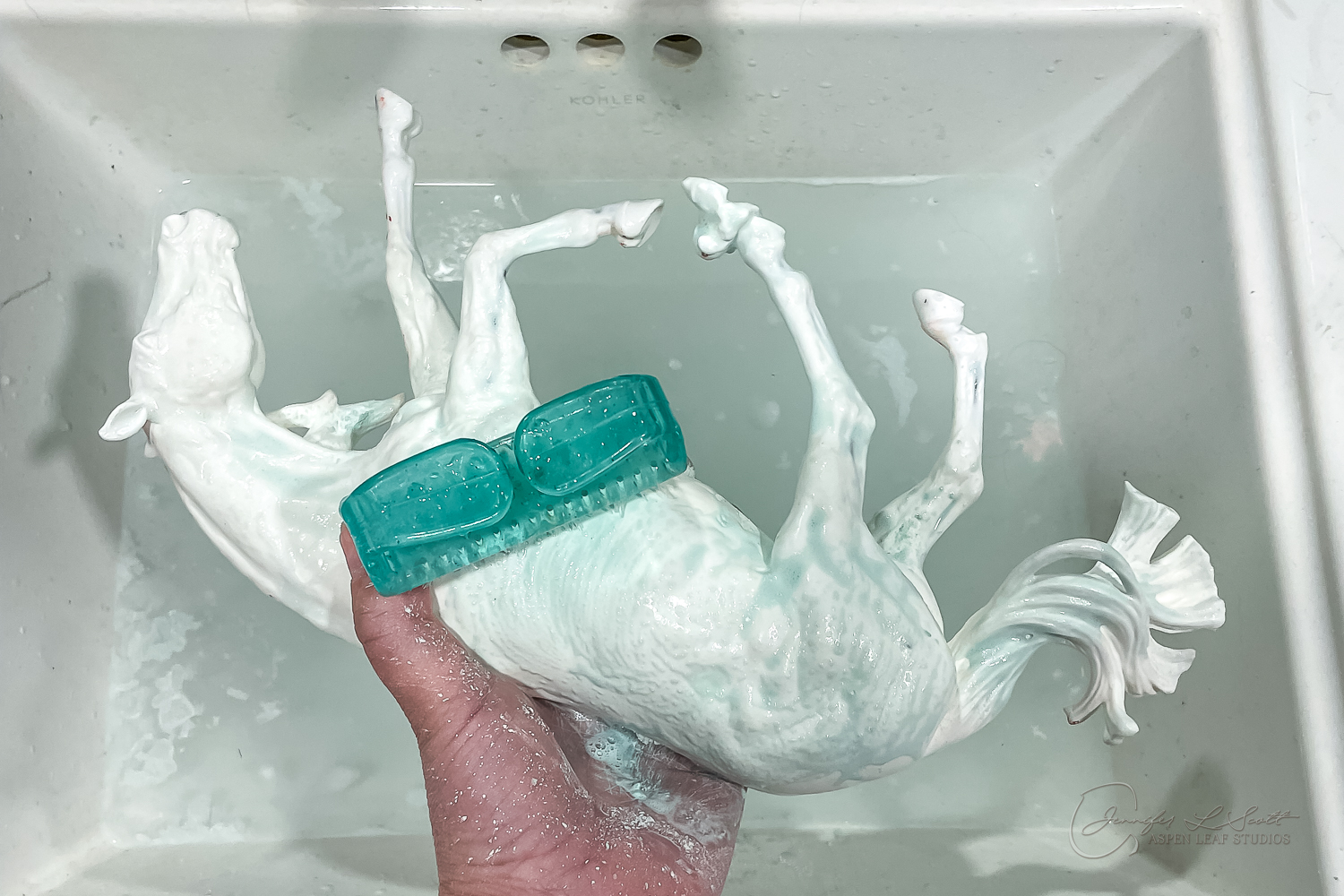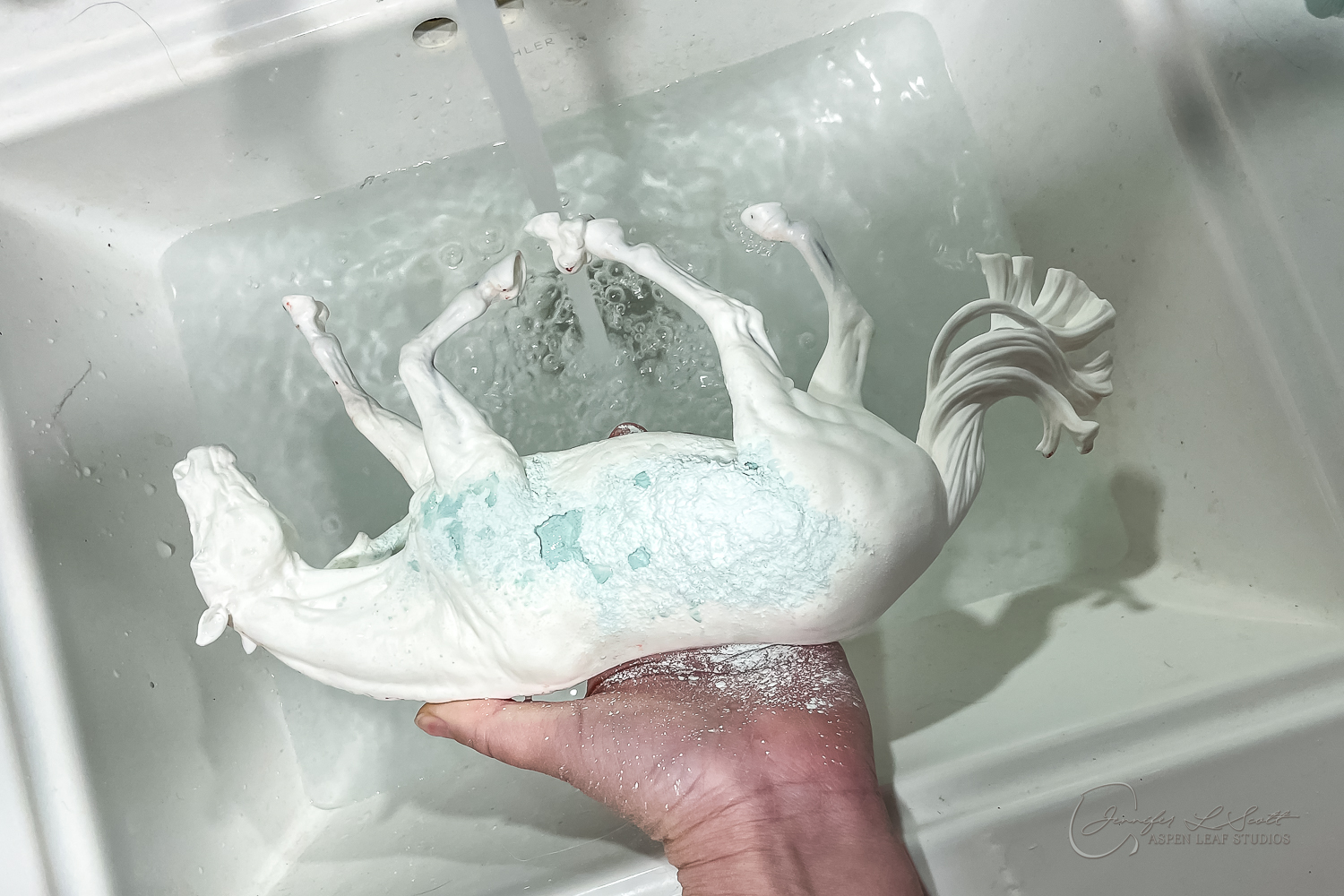 Have you ever hand-washed dishes? You have the skills necessary for this job. First we're going to apply a cleaning agent like Ajax, Barkeepers Friend, or Comet. I am using Comet in the photos below, which is a power form. I typically shake it directly onto the horse, drip my pot cleaner or tooth brush into the water and make the paste directly on the resin body. Really, solidly apply and scrub this stuff everywhere. The tooth brush is great for the hard to reach areas like under mane, nostrils, the butt crack, etc. You want your brush bristles to be stiff enough to really scour the piece but not so stiff that they leave marks behind. The cleaner will do the bulk of the work so go too soft rather than too hard on those bristles. Use warm/comfortably hot water. After you've thoroughly scrubbed every little surface of your model, scrub inside the water to rinse as well, making sure all the cleaner is removed.