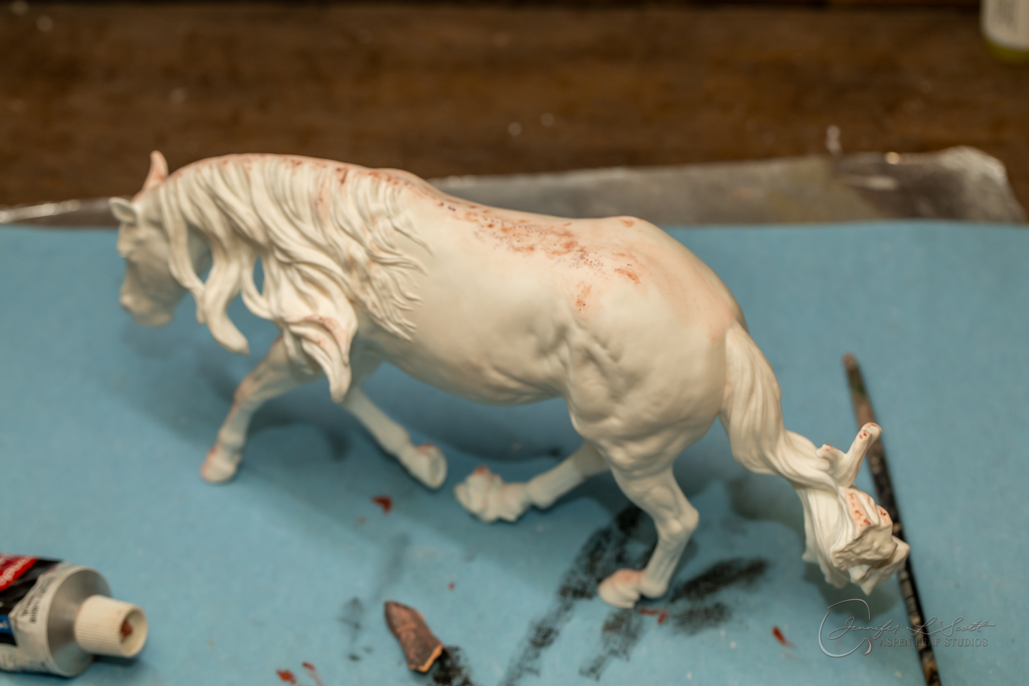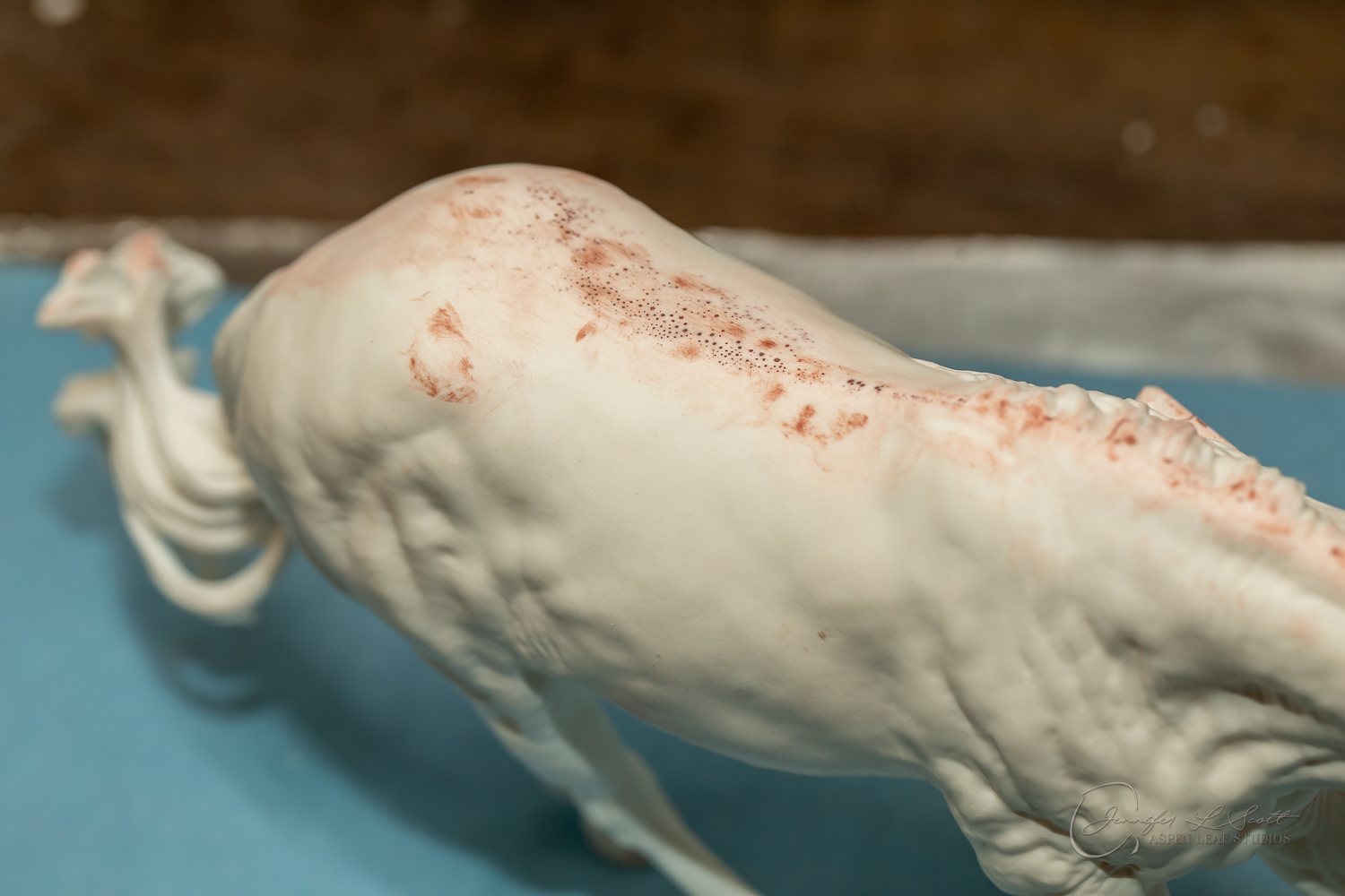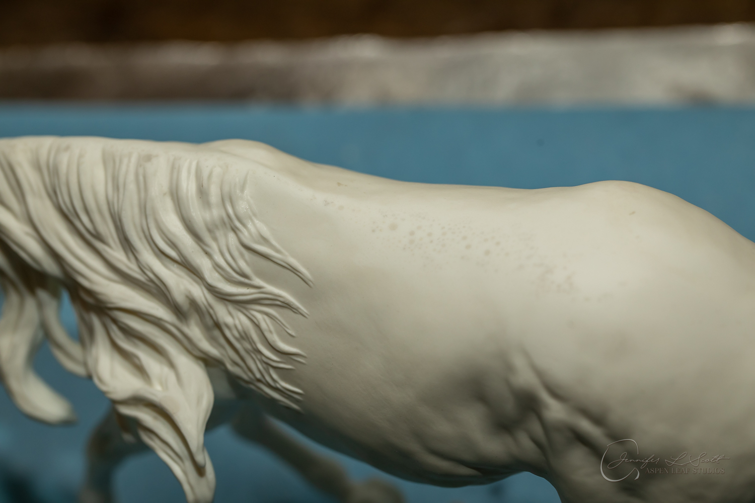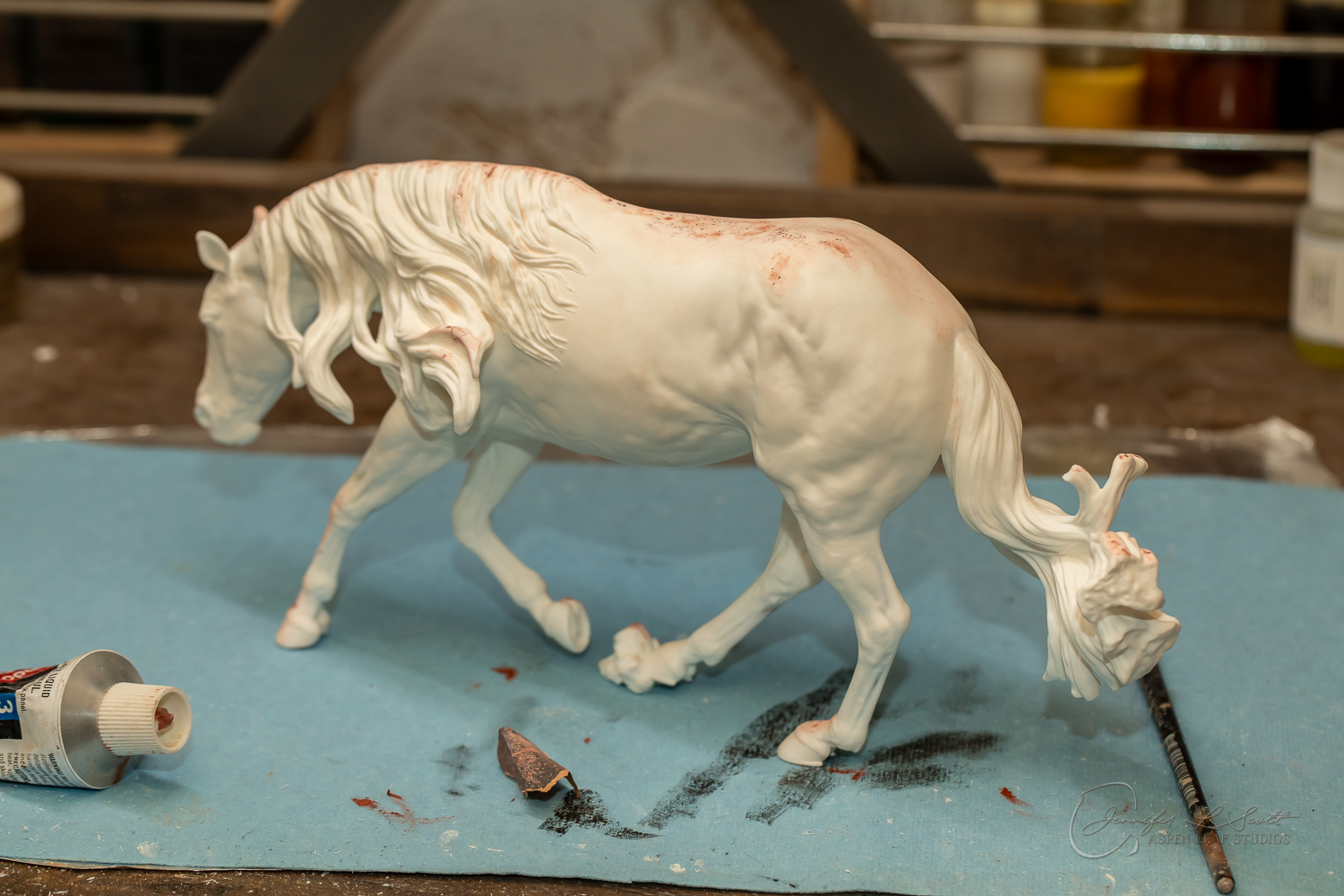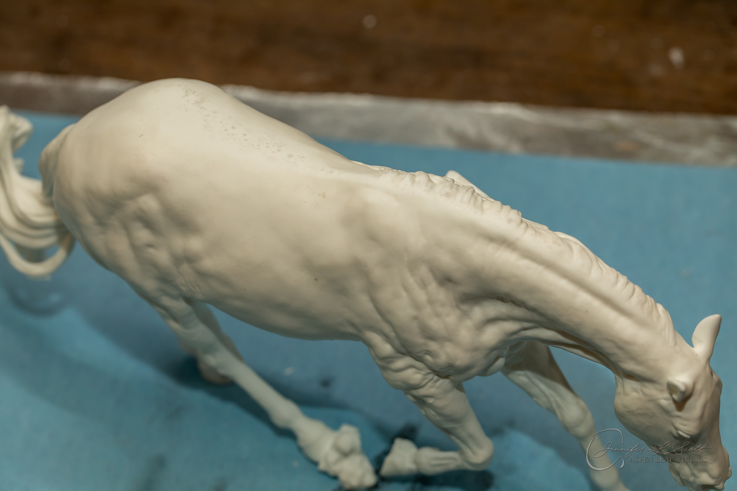Once your piece is all nice and scrubbed clean (three times), then you should be able to feel the difference. There is a "grab" to the horse's surface that wasn't there before. You're done washing now, and it's time to let the piece dry thoroughly. I don't usually like to wipe down the piece with anything except maybe shop towels. I have giant, harry dogs and I found that if I used even a "clean" towel I'd end up with lint and hair in the piece that got exposed once I sprayed primer on. Letting the piece sit to air dry makes sure I don't wipe anything back on after spending the time to get everything off.