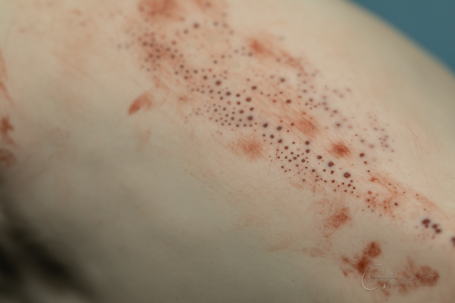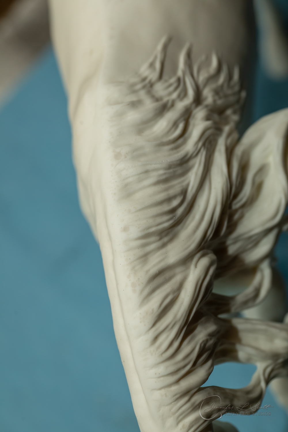 For the Stetson below, I'll be using Bondo Spot Putty and a small round angled clay shaper of medium firmness. I'll start by using the flat area of the shaper to generously apply and spread the Bondo along the pinhole zones. In the mane, I'll be a little more careful and use the tip of the shaper to remove extra Bondo from the hair creases, making sure to just fill where I need so I don't have to worry about really careful sanding later. Large easily-sanded areas like the back and butt though I'll go wild on. It'll shrink a little so I'm compensating with more filler than the hole needs. I'll let this all dry, and then I'll sand off the extra right down so it's flush with the rest of the resin's surface. When I put primer on, you'll never know it's there. If there are any other small fill areas, like a seam that went inward or an odd divot or crack, I'll apply it to those areas in the same way. In easily sanded areas, I'll sometimes put a spread of it down even if I'm not totally sure it needs it because it's so quick to do anyway. This whole process probably took 3 minutes of actual working time. So while it looks like it should have taken hours, Bondo makes the fill work EASY.