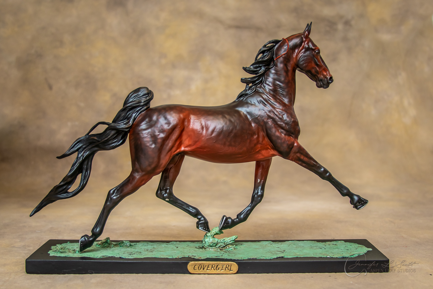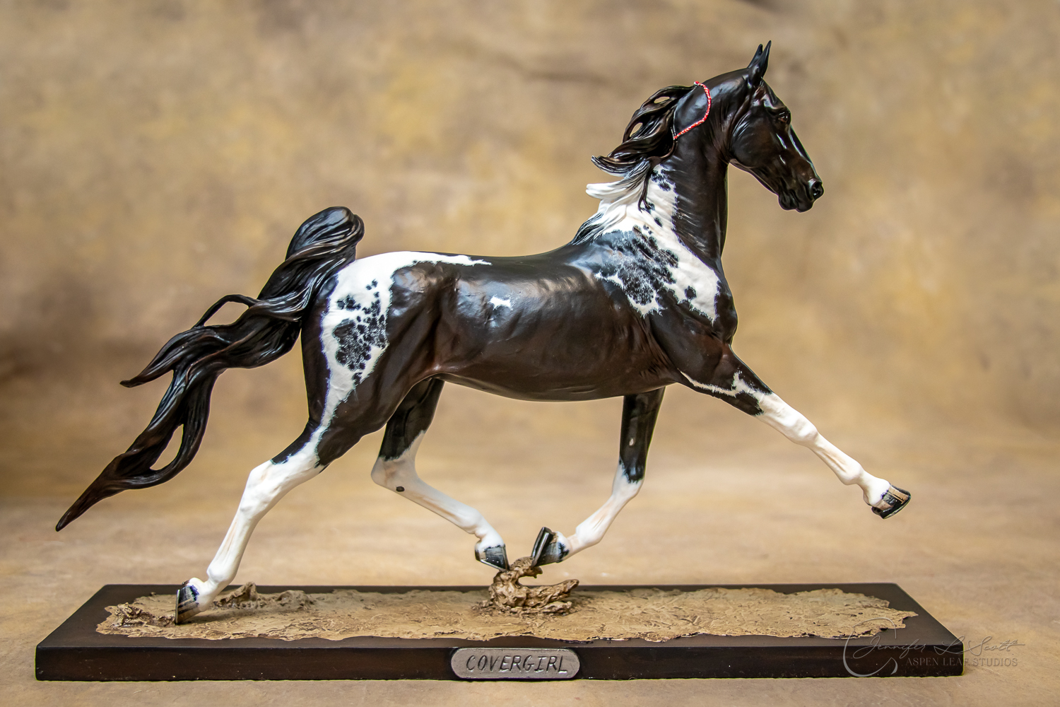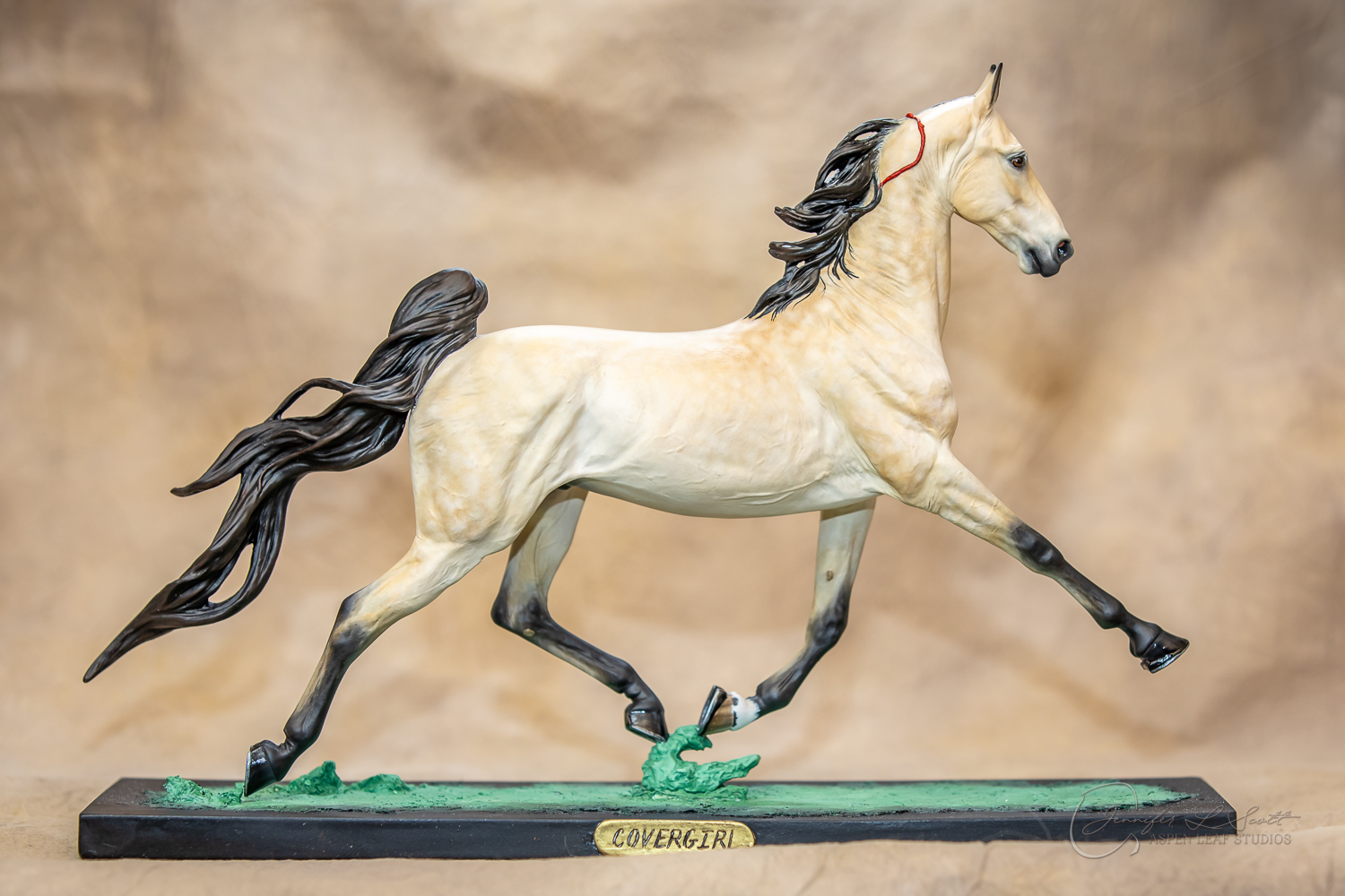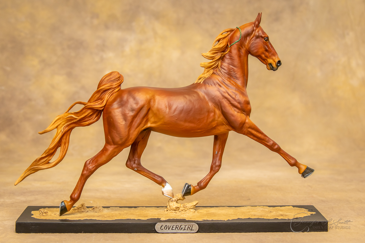 Anise has two versions. One version sports a loose, pulled mane and tail (galloping day on xc!) and the other sports a sleek button-braided look (dressage/show jump time!) and a ear cocked back. She has two bases for each version. A display ready plinth style (which takes up a lot of shelf space, and a smaller more portable and performance friendly one for your show setups.