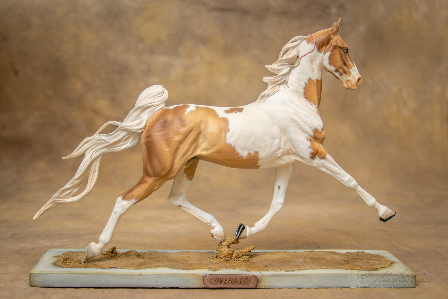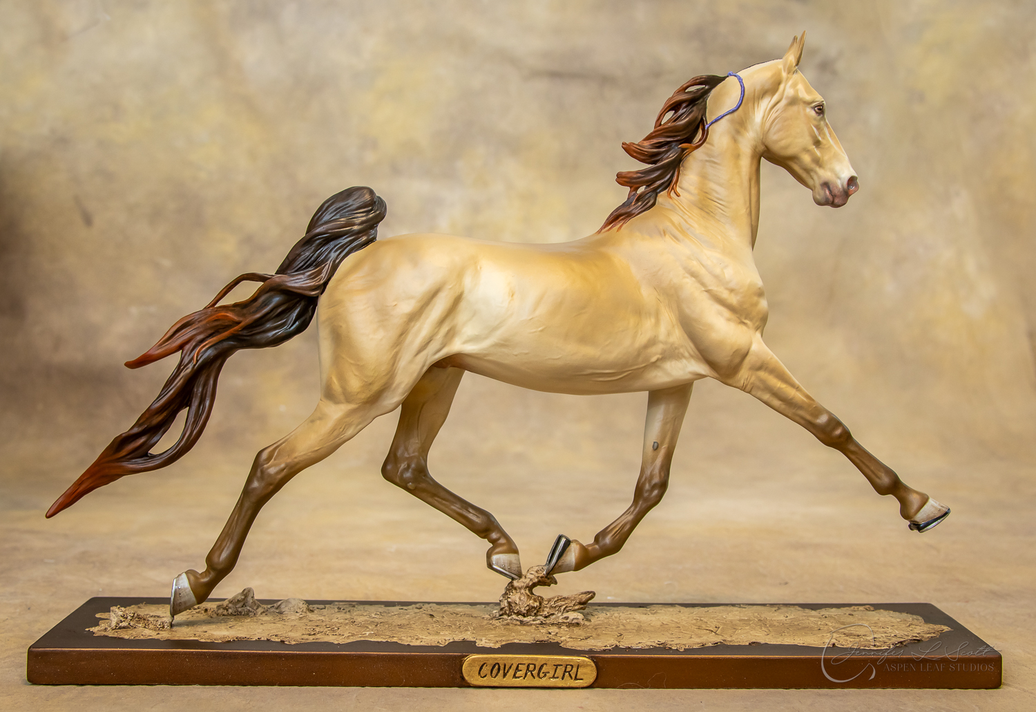 The loose mane version was produced in three scales: Traditional, venti, and micro. Only the traditional came with the extra plinth base. The venti version was released as the judges' model, painted fund raiser, and overall division champ/res. champ prizes for The Jennifer Show 2019. The traditional and venti versions were solid-cast resin with steel wire reinforced legs and tail produced in house. The braided version was only released in traditional scale and was hollow cast resin with steel wire leg an tail reinforcement by Jolt Studios. Both traditional versions were sold via lottery and limited to 40 unpainted pieces each. A loose-maned micro version was released in both pewter (produced by Metal Oak Casting Studios) and 3D printed resin (produced in house).