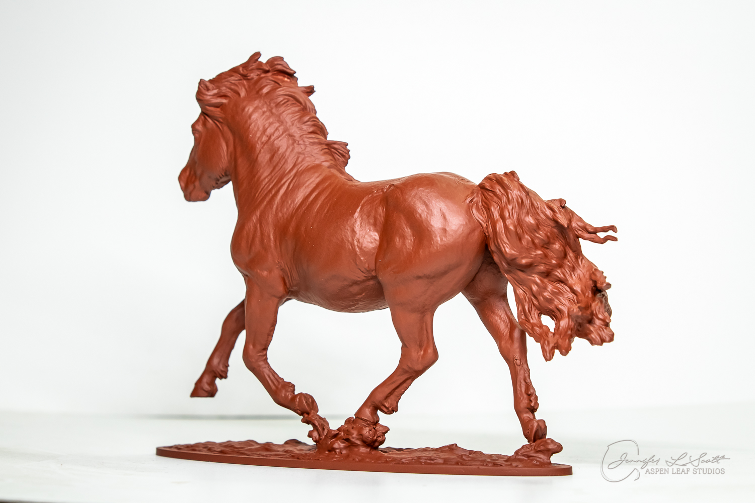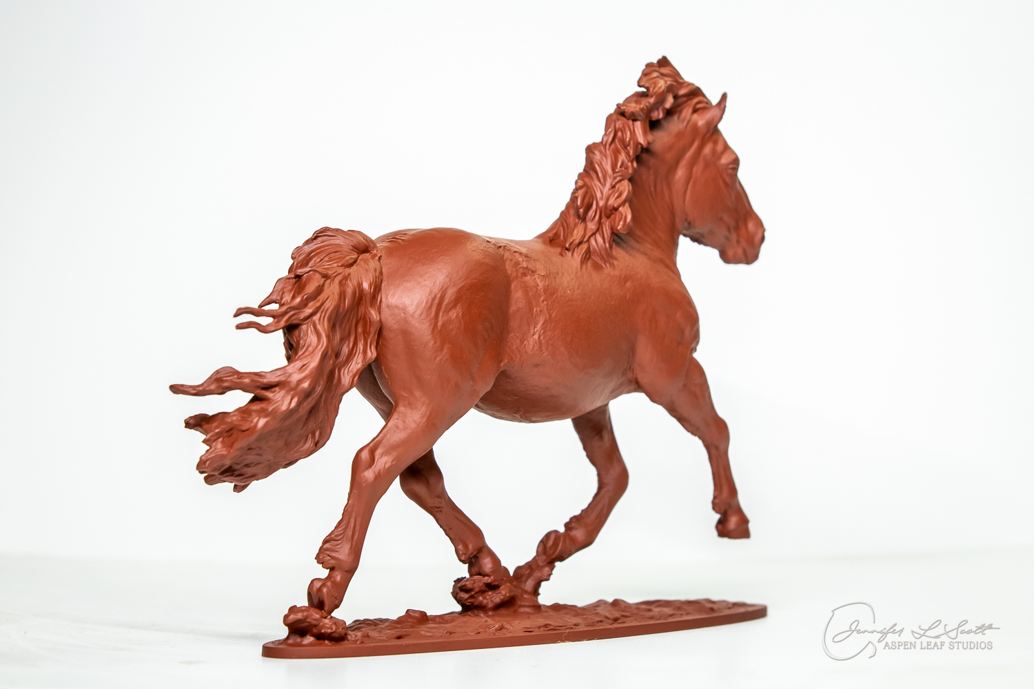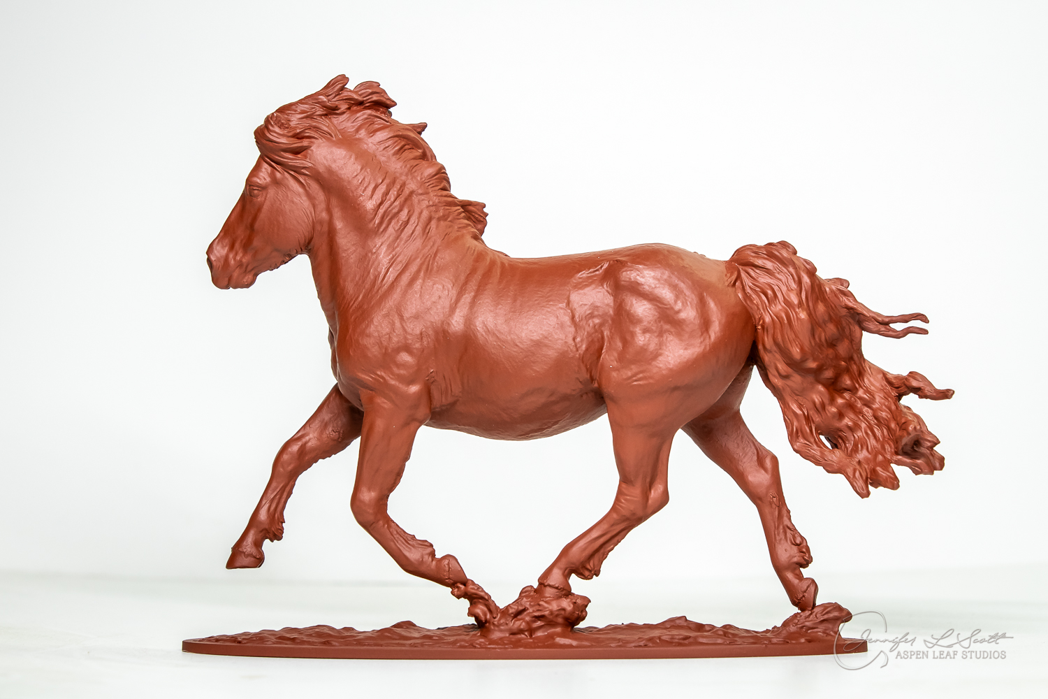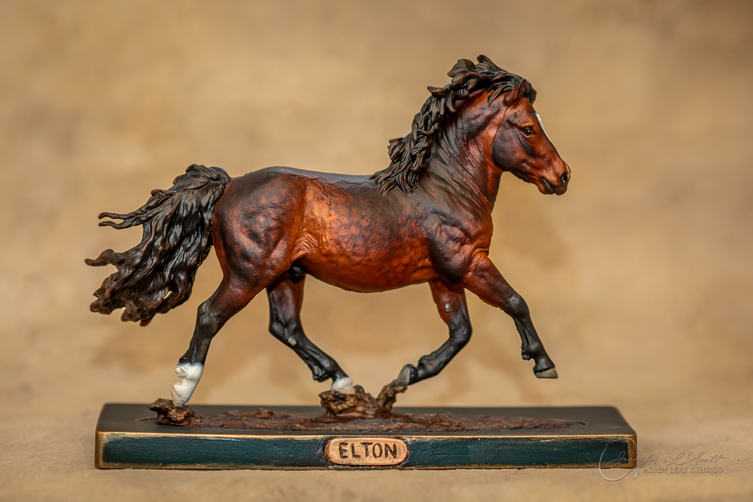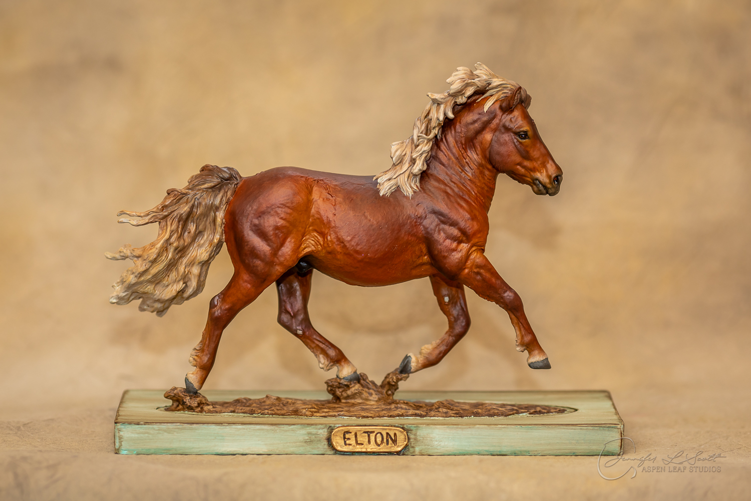 Like most of my work, Elton is smallish traditional scale and is a depiction of a British Shetland pony stallion. Jauntily trotting, he's the stout and hairy pony we all think of. You can just feel the mischief about to bubble forth. I love his semi-fluffy texture, which is interesting and yet not too much to make painting difficult.