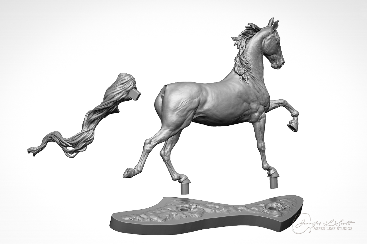 After the success with magnets on the Stetson mold, I was ready to be a little more ambitious with my piecing. This sculpture's tail is actually a separate piece, which makes it much easier for transportation as well as shelf storage. Originally the tail was designed to work with a magnet in it and a mated one in the body of the horse, but the result was a hold that worked too well. The tail is perfectly secure with only the key; and when primed and painted, it fits very tightly. Enough that the friction of pushing in and pulling out will probably scratch paint work off in that area. No biggie since it's invisible, but it's good to disclose. There is very little gap between the tail and the body of the horse, and the way the tail is folding over really sells the illusion of everything being one piece. The base is removable, and slimmed down from my usual rectangular plinth style, making it more shelf-space friendly for this very long, spread out lady. Her pegs are hoof-shaped so she can only be put into her base one way and you can easily see which way that is. She slides in divinely and is very secure.