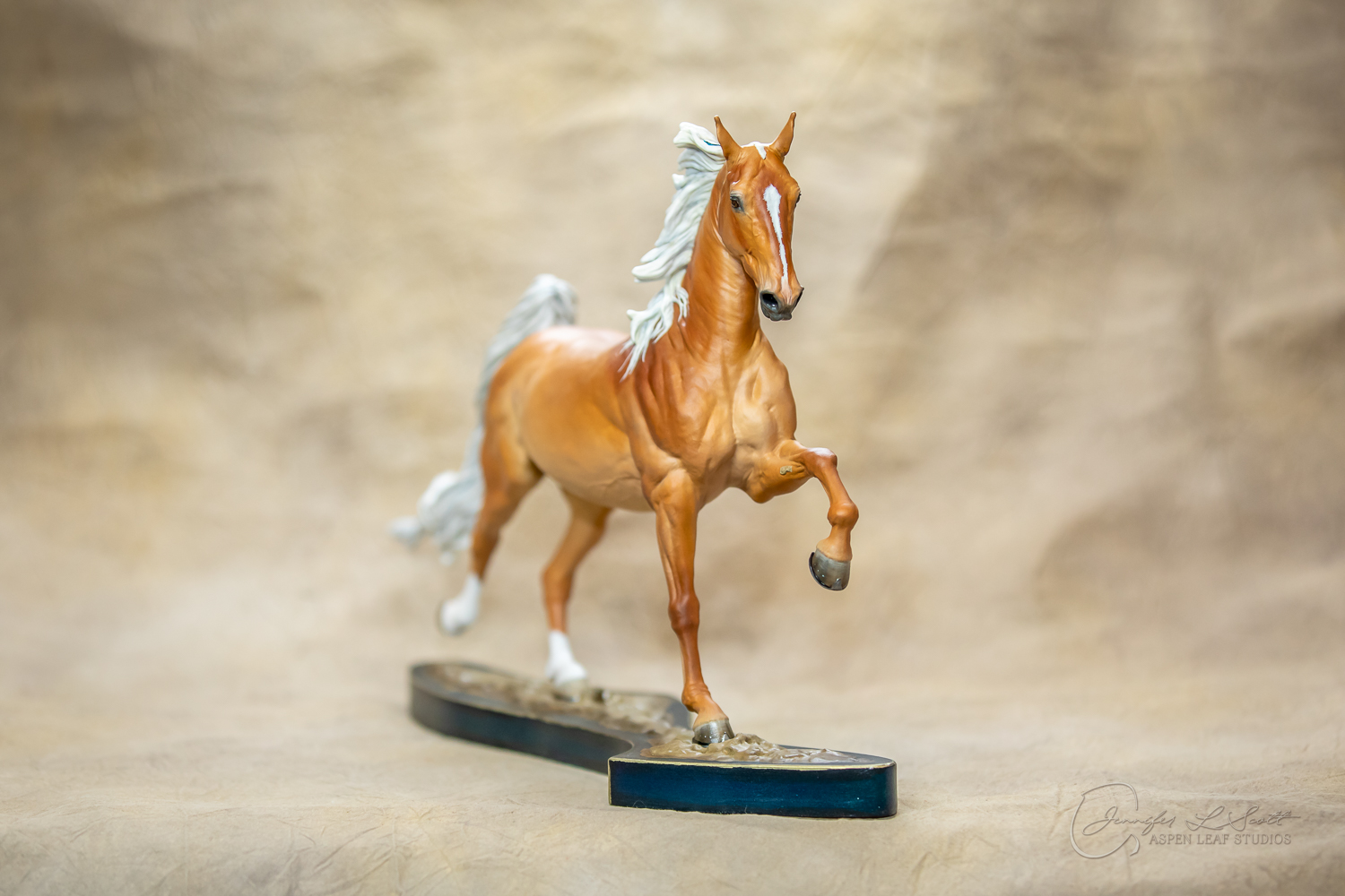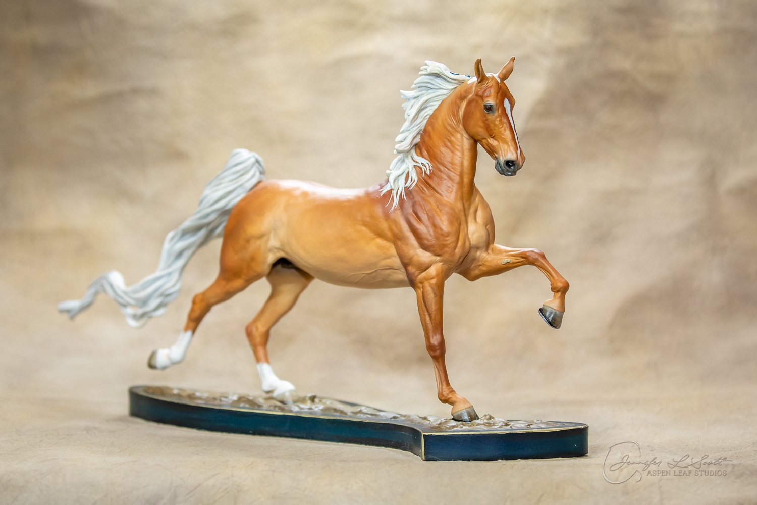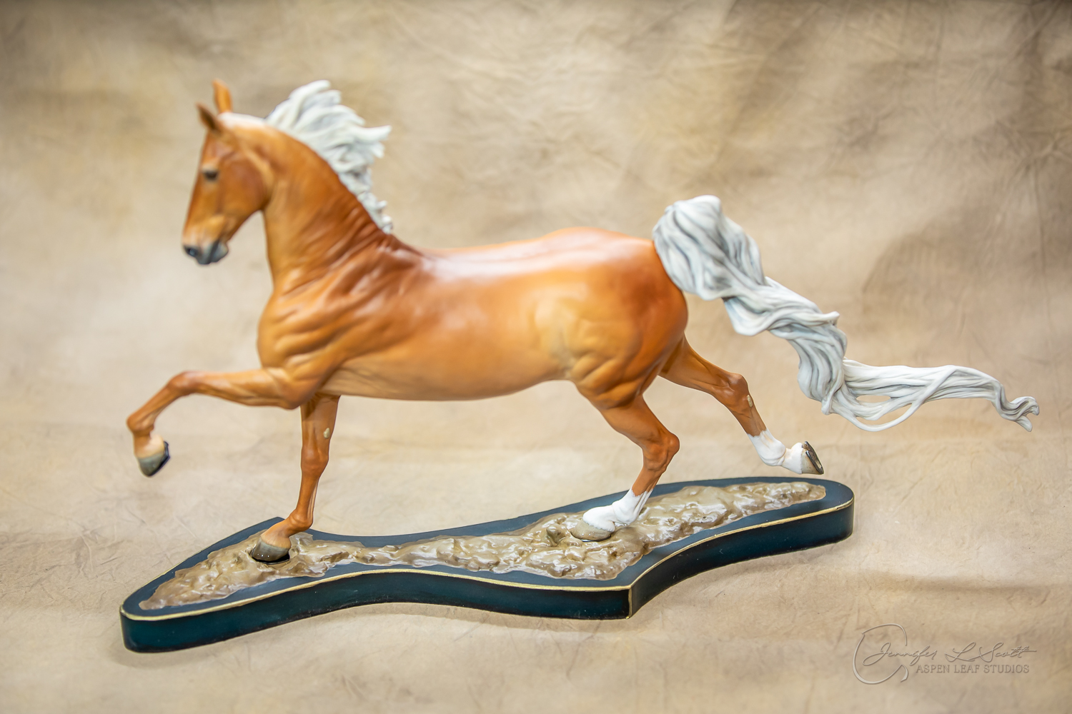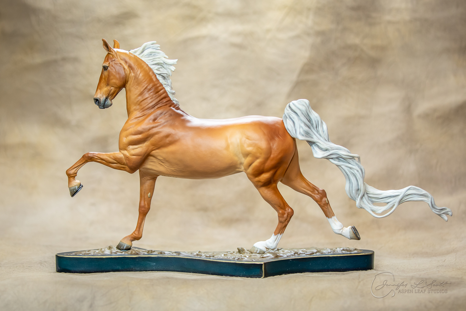 Painted palomino with a dark turquoise ribbon in 2025. Base is dark turquoise with black antiquing and gold edging all surrounding a sand center.