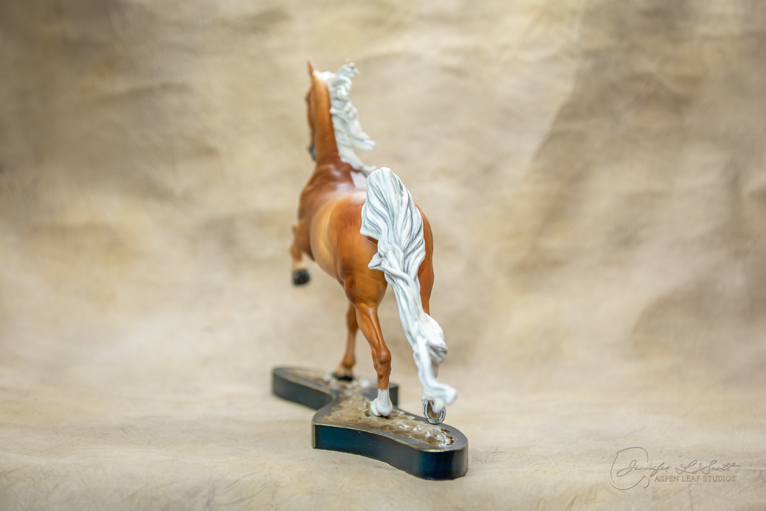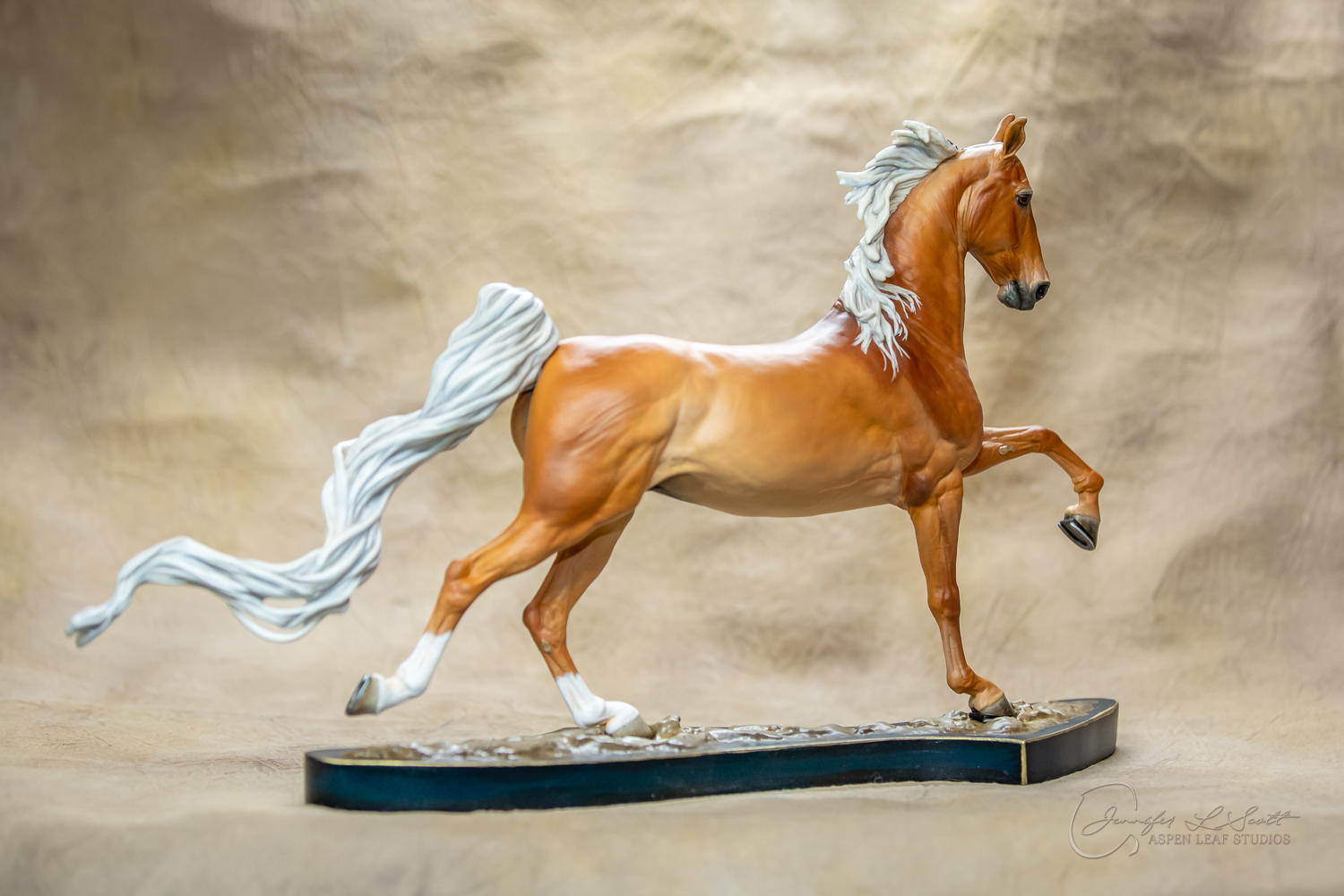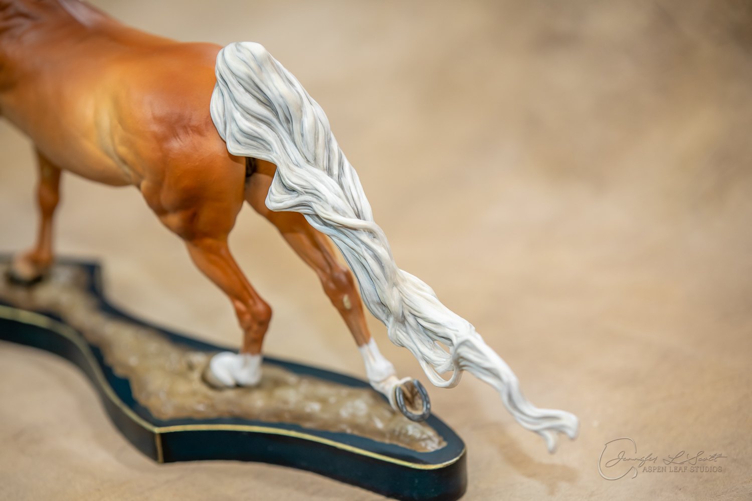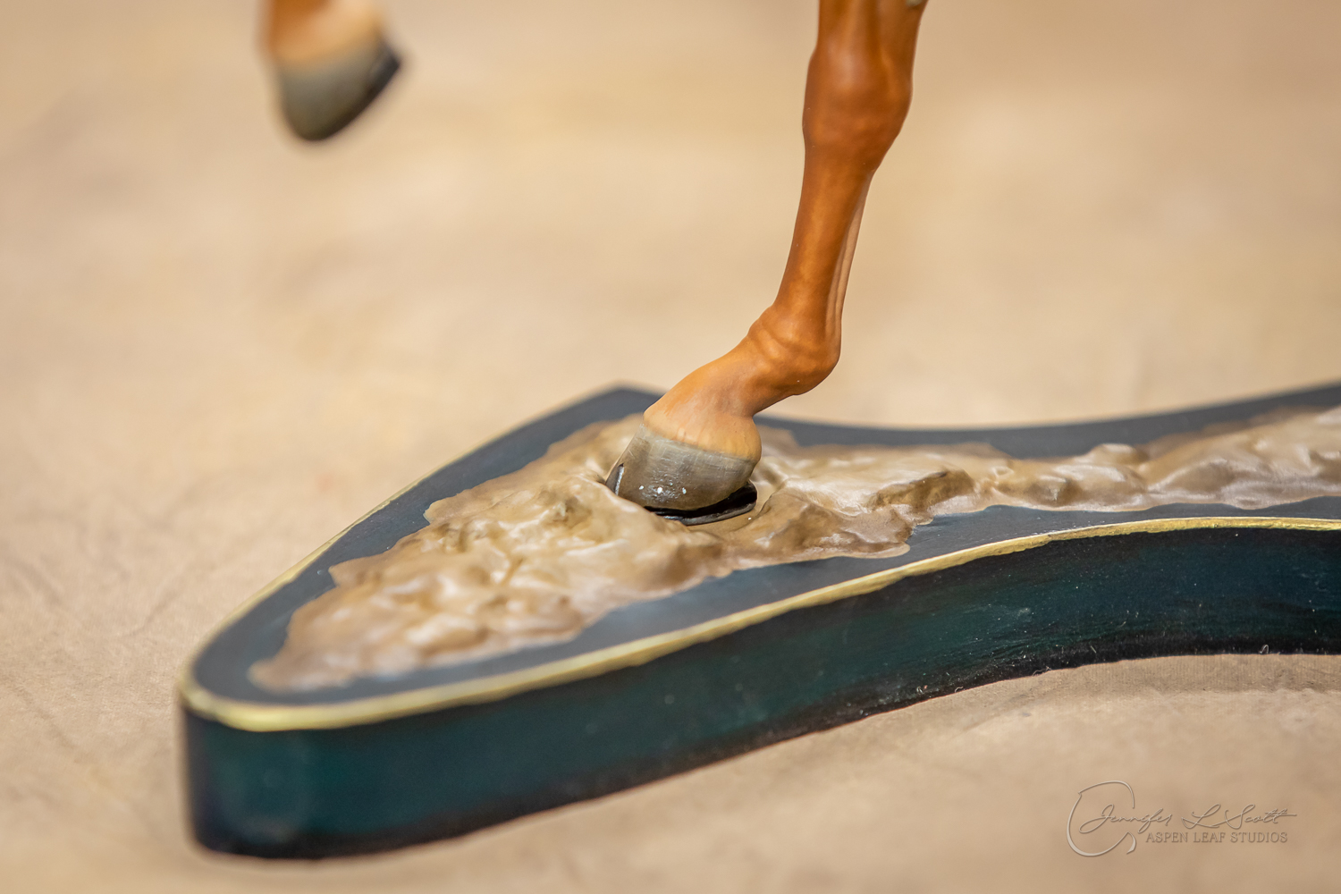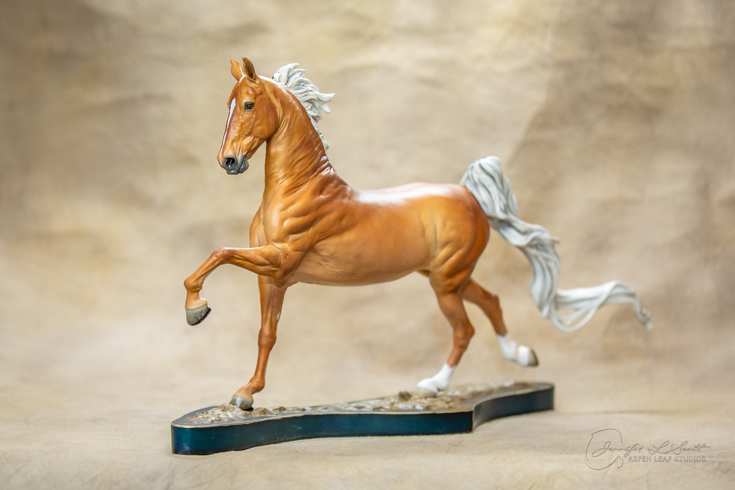 Painted palomino with a dark turquoise ribbon in 2025. Base is dark turquoise with black antiquing and gold edging all surrounding a sand center.