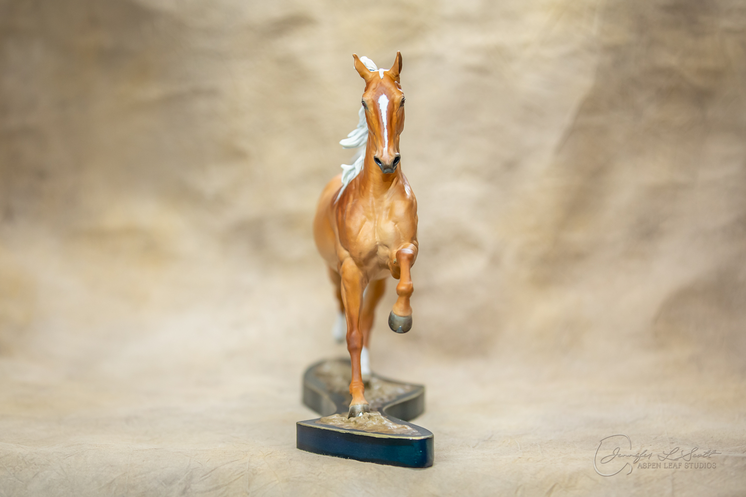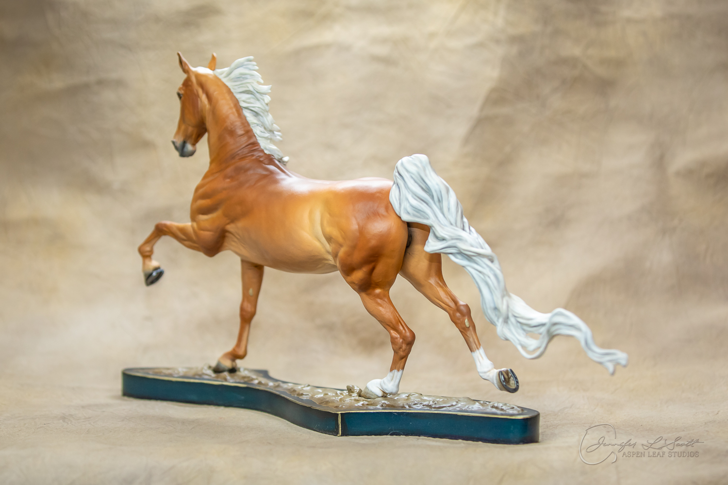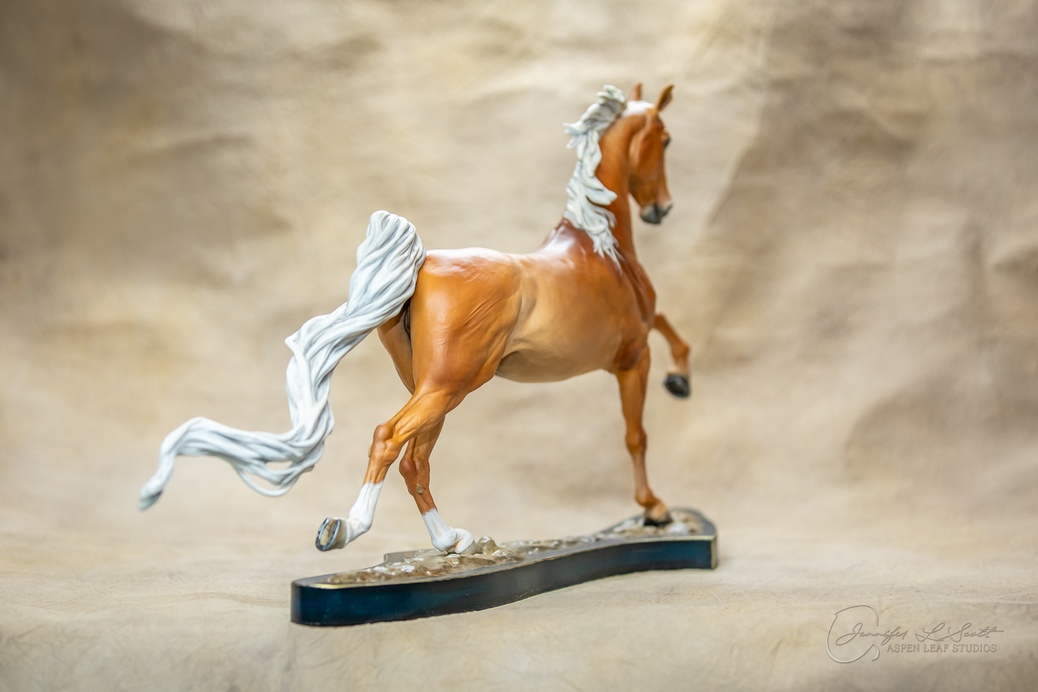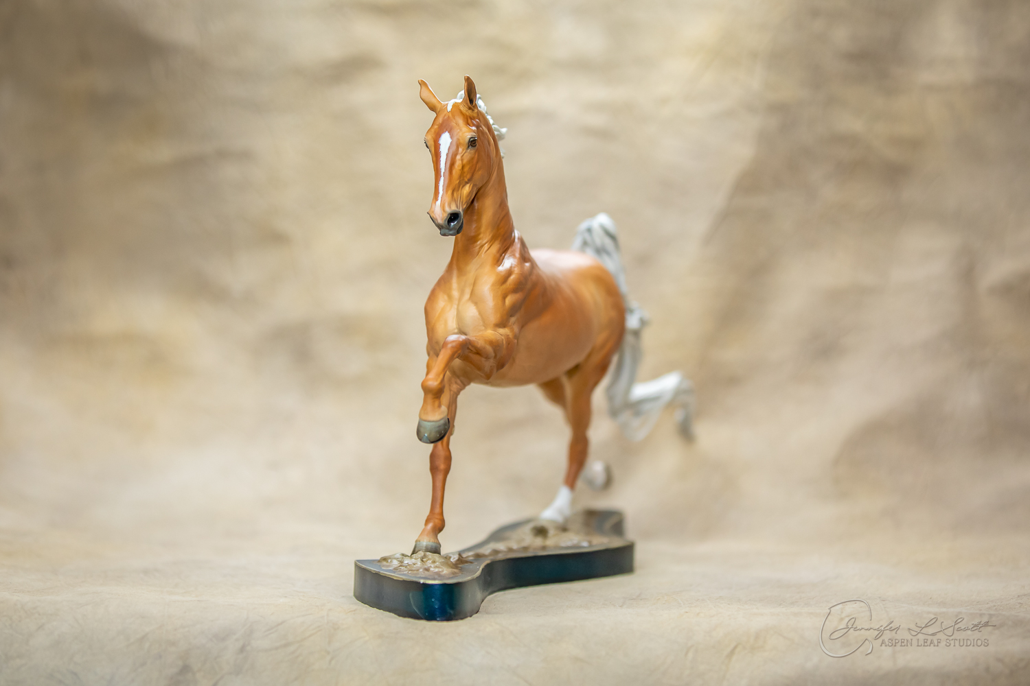 Painted palomino with a dark turquoise ribbon in 2025. Base is dark turquoise with black antiquing and gold edging all surrounding a sand center.