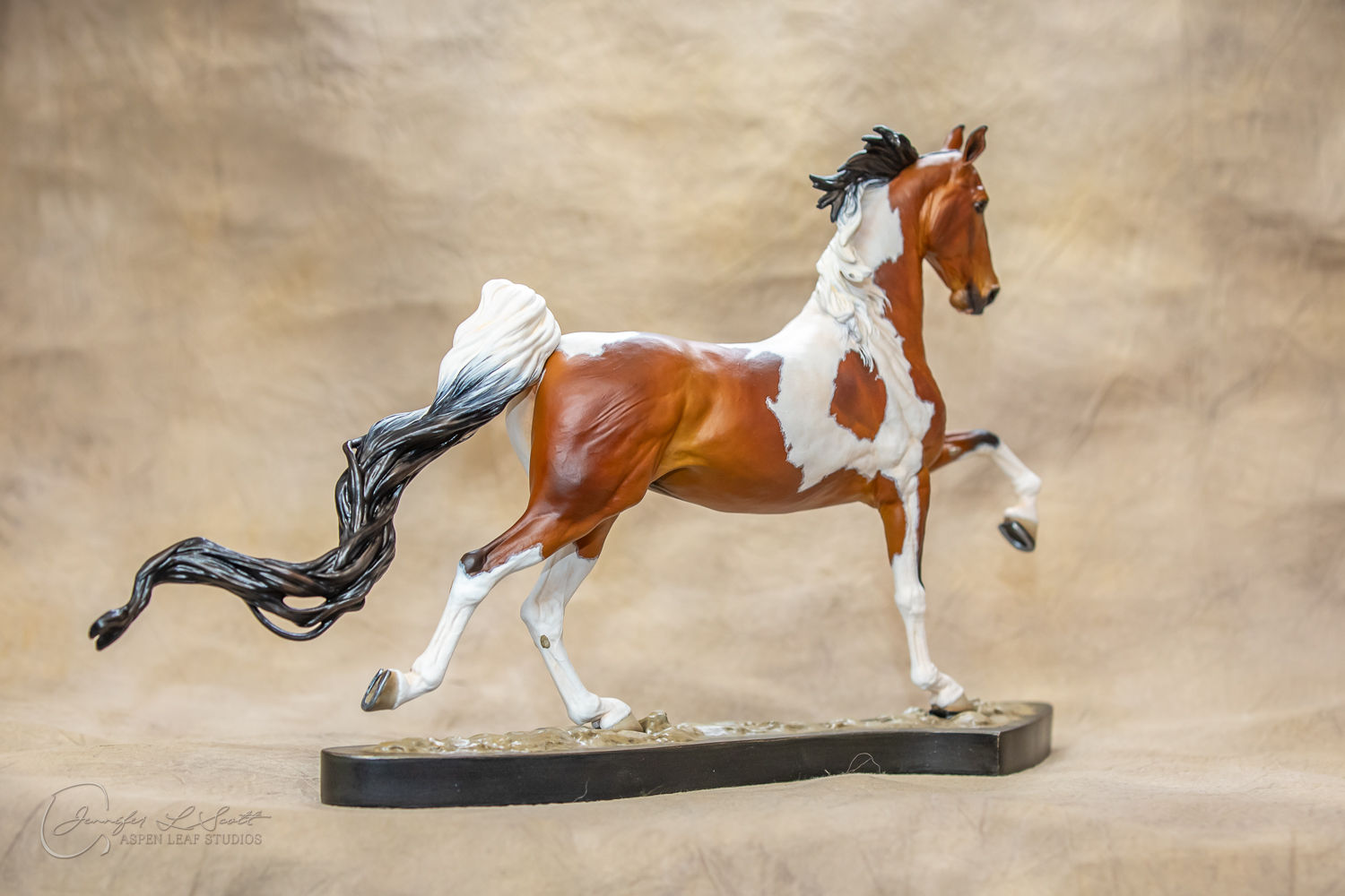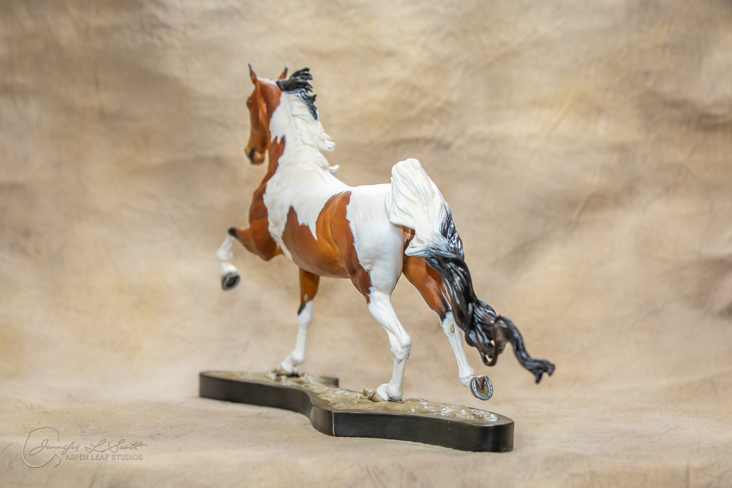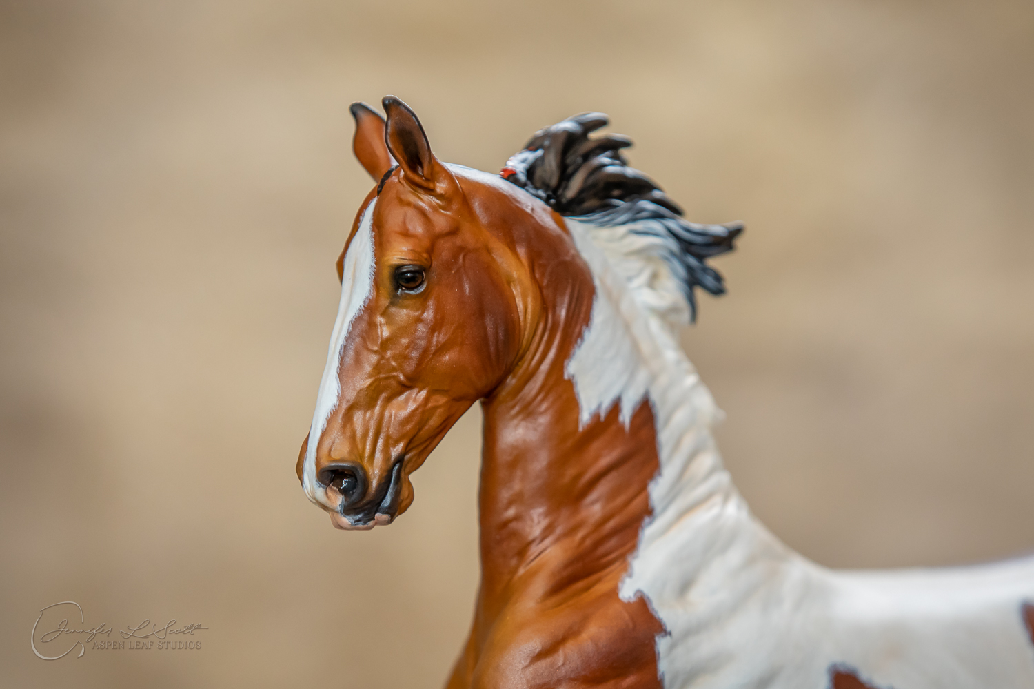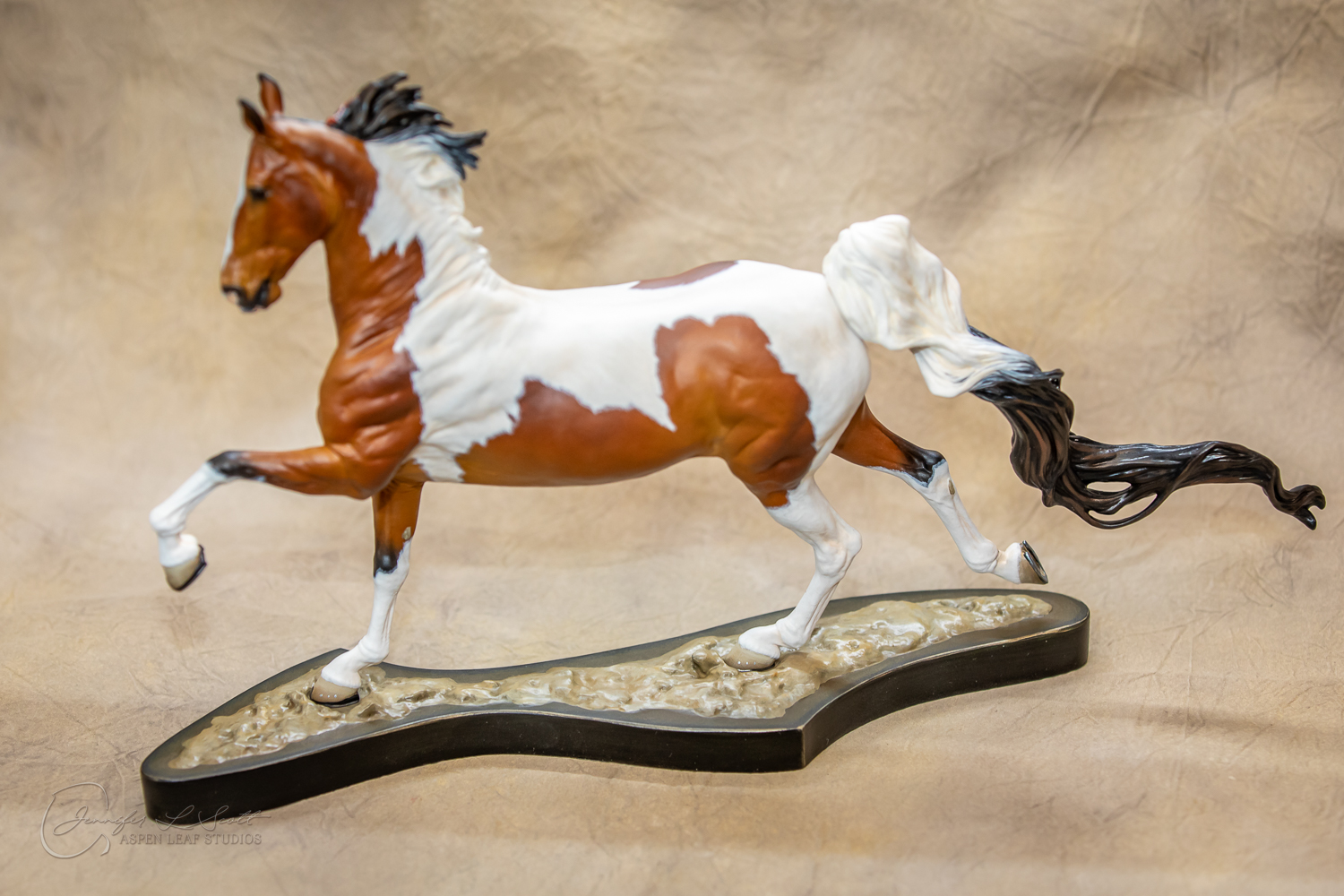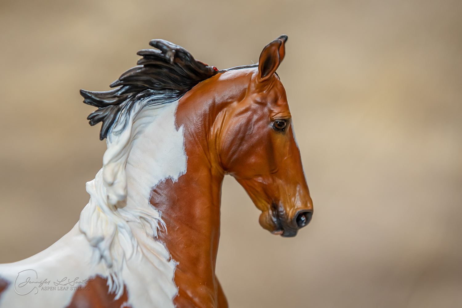 Painted bay tobiano with a traditional red ribbon in 2025. Base is dark olive with black antiquing and gold edging all surrounding a sand center.