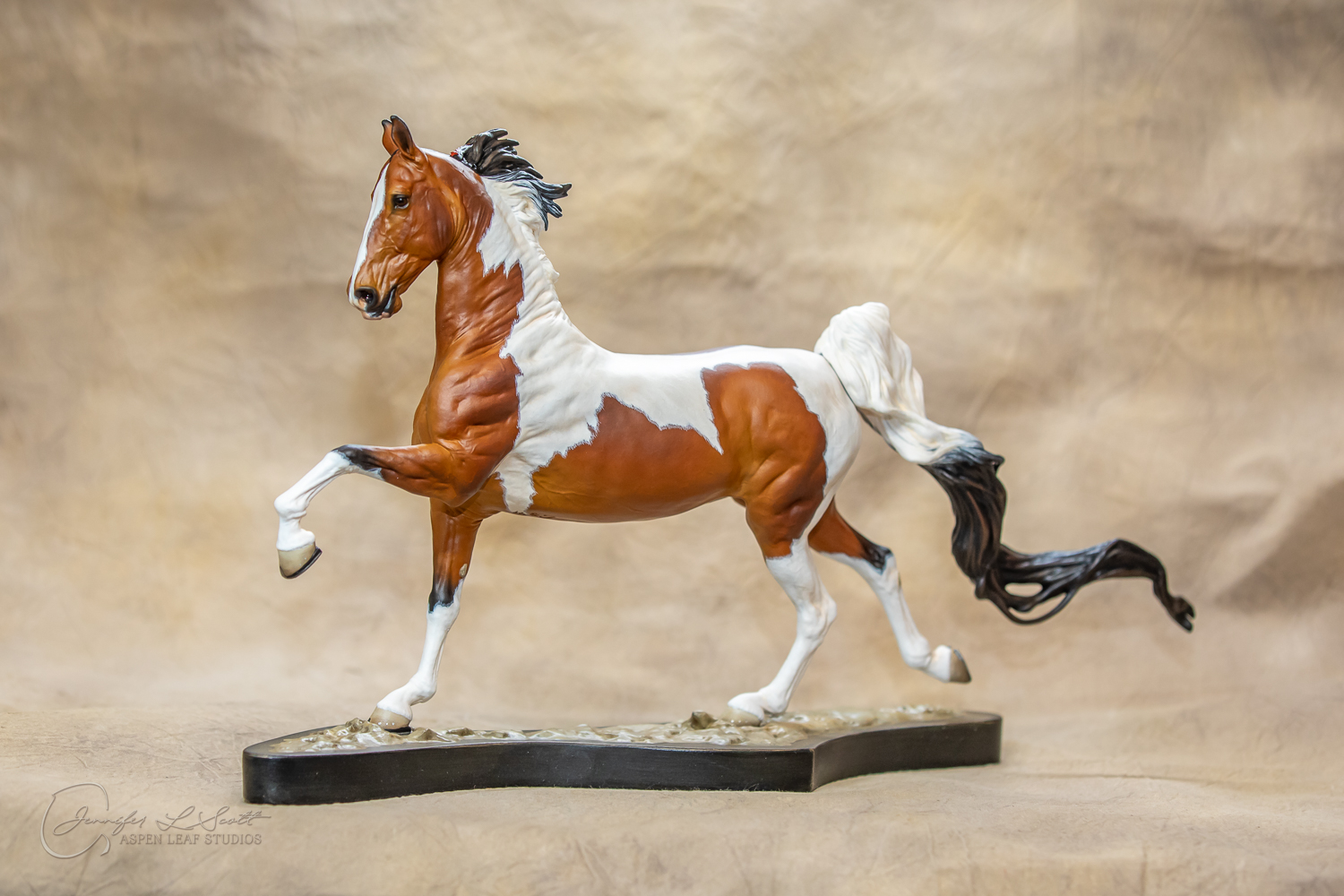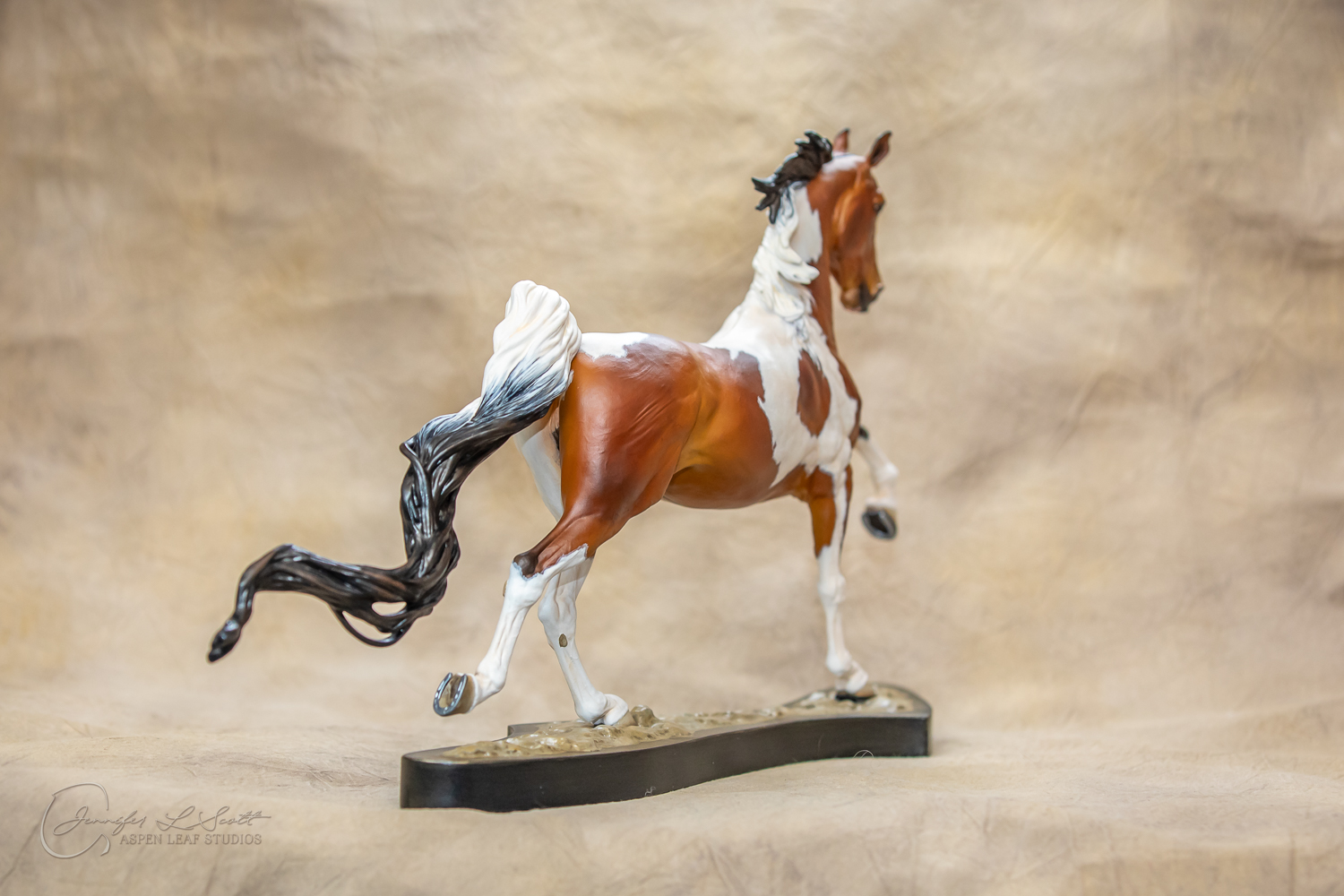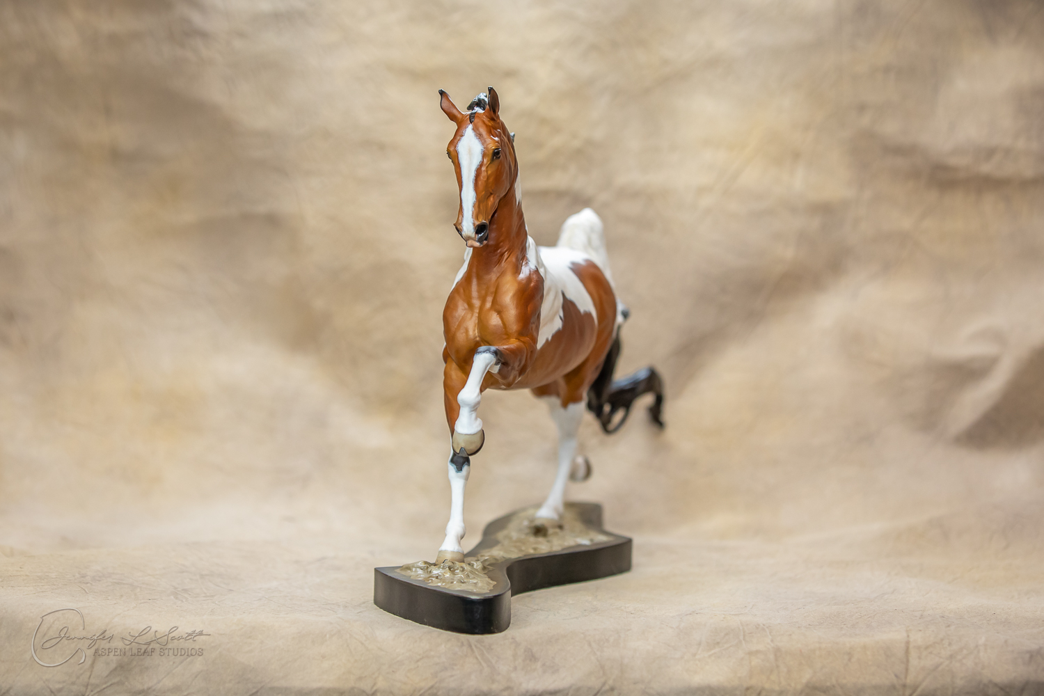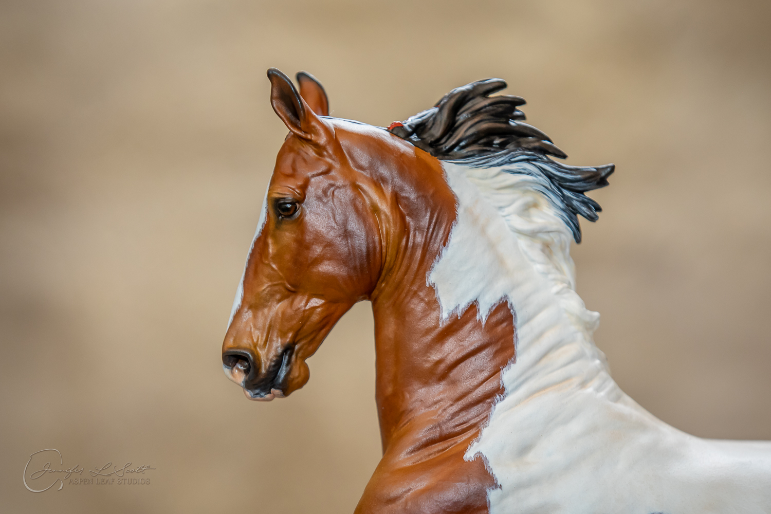 Painted bay tobiano with a traditional red ribbon in 2025. Base is dark olive with black antiquing and gold edging all surrounding a sand center.